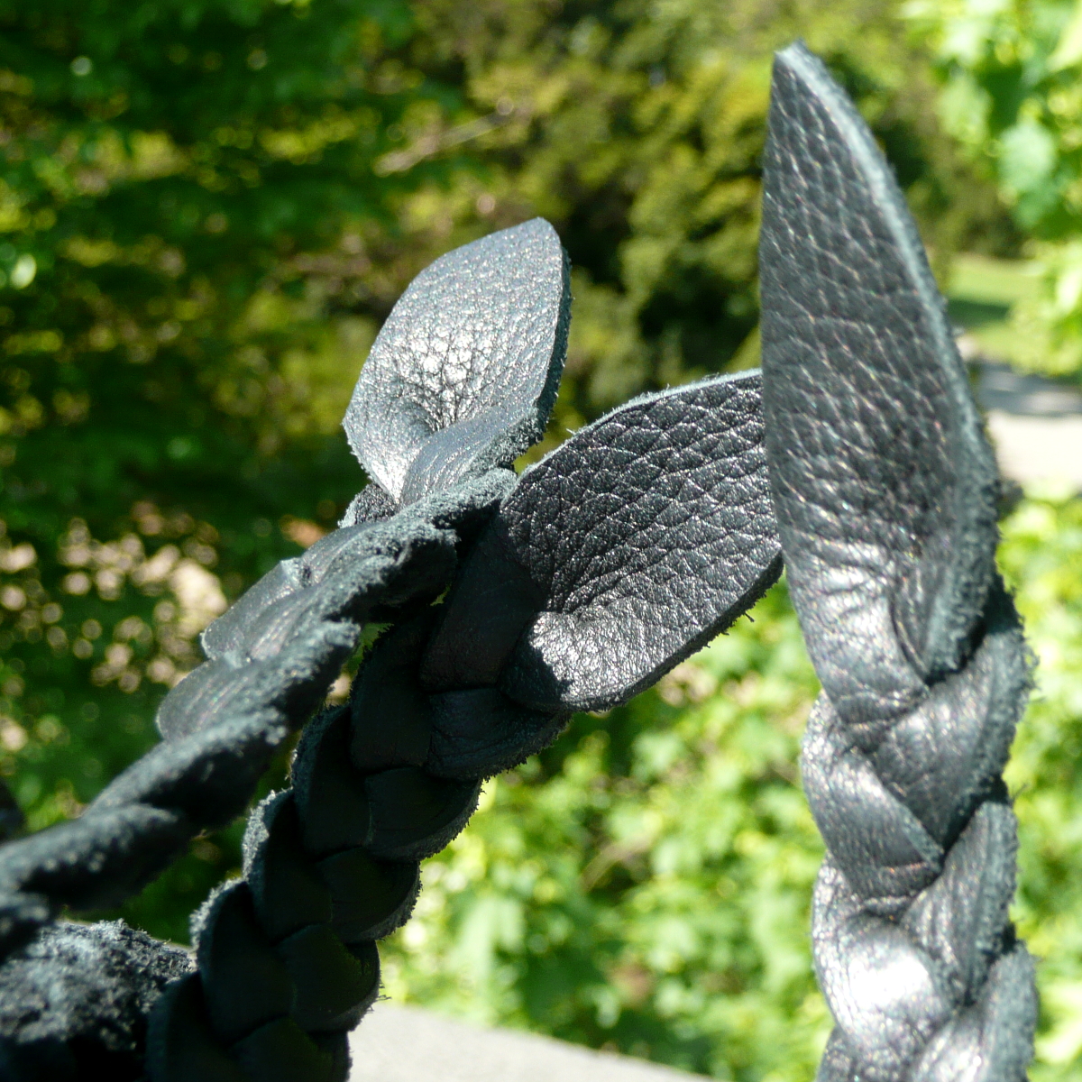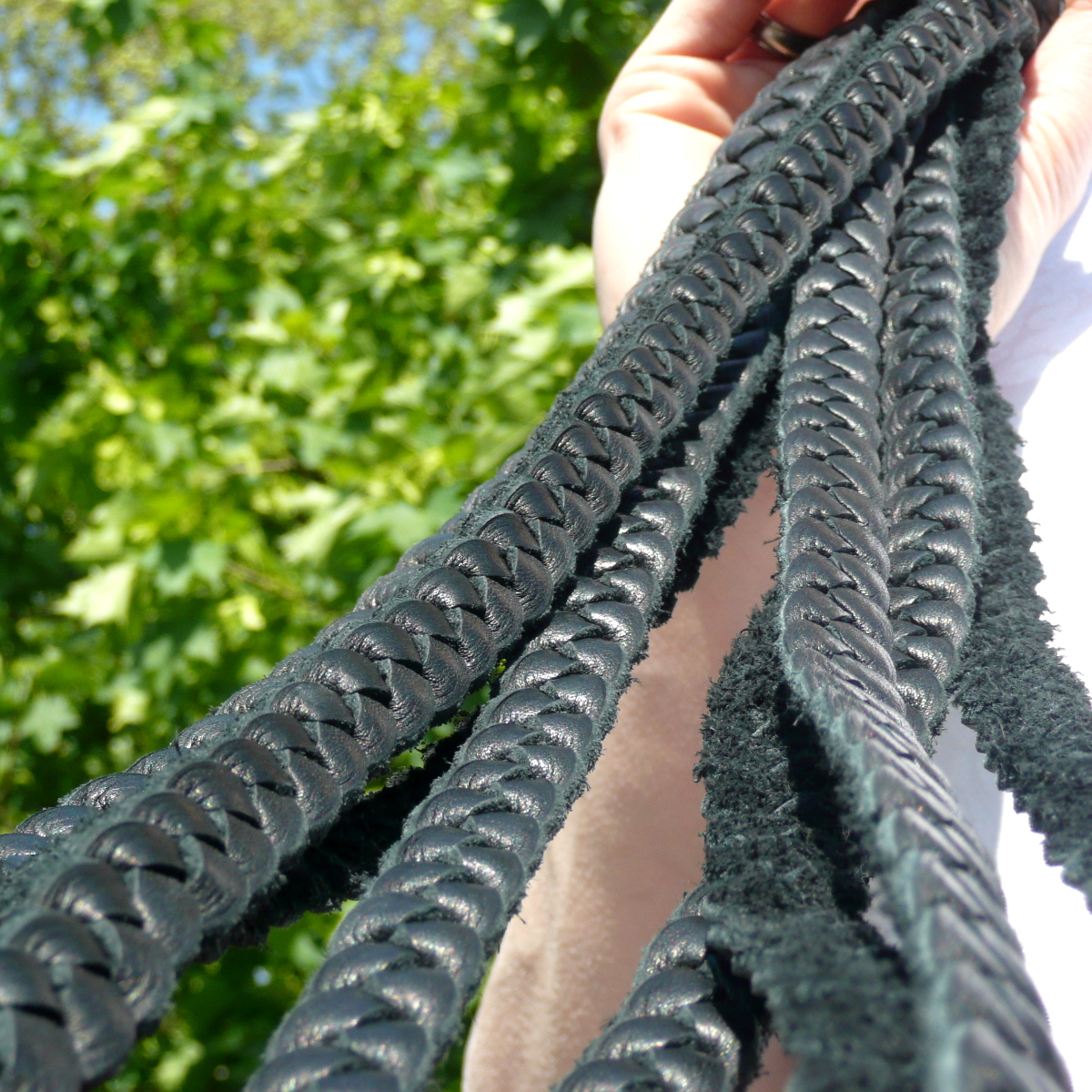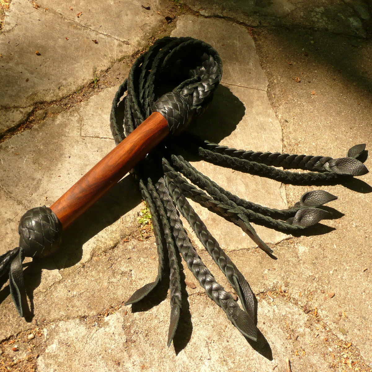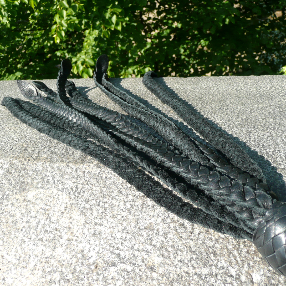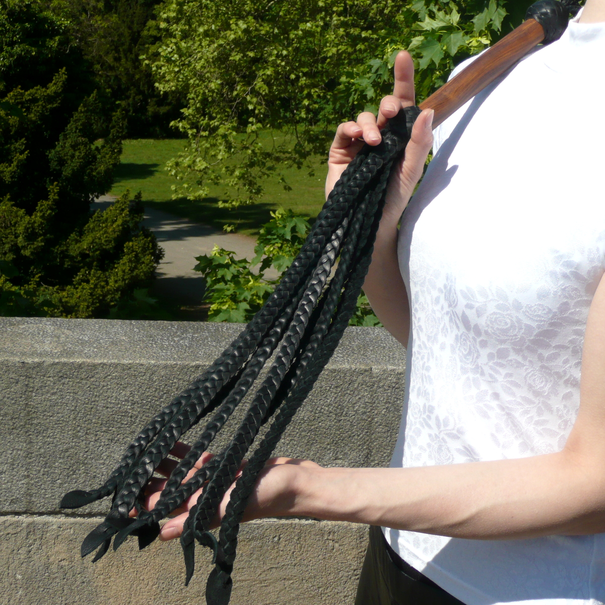 Die geflochtenen Tails mit ihren kurzen Spitzen erzielen eine deutlich intensivere Wirkung als glatte Tails. Sie werden aus ca. 2 Millimeter dickem Anilin-Leder vom Ende aus geflochten und verhelfen diesem Flogger zu einem Gewicht von ca. 300 Gramm.
