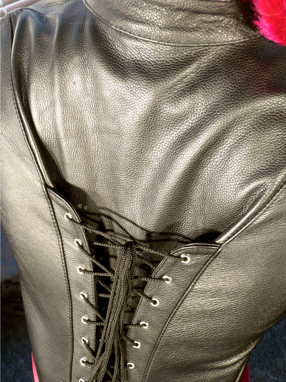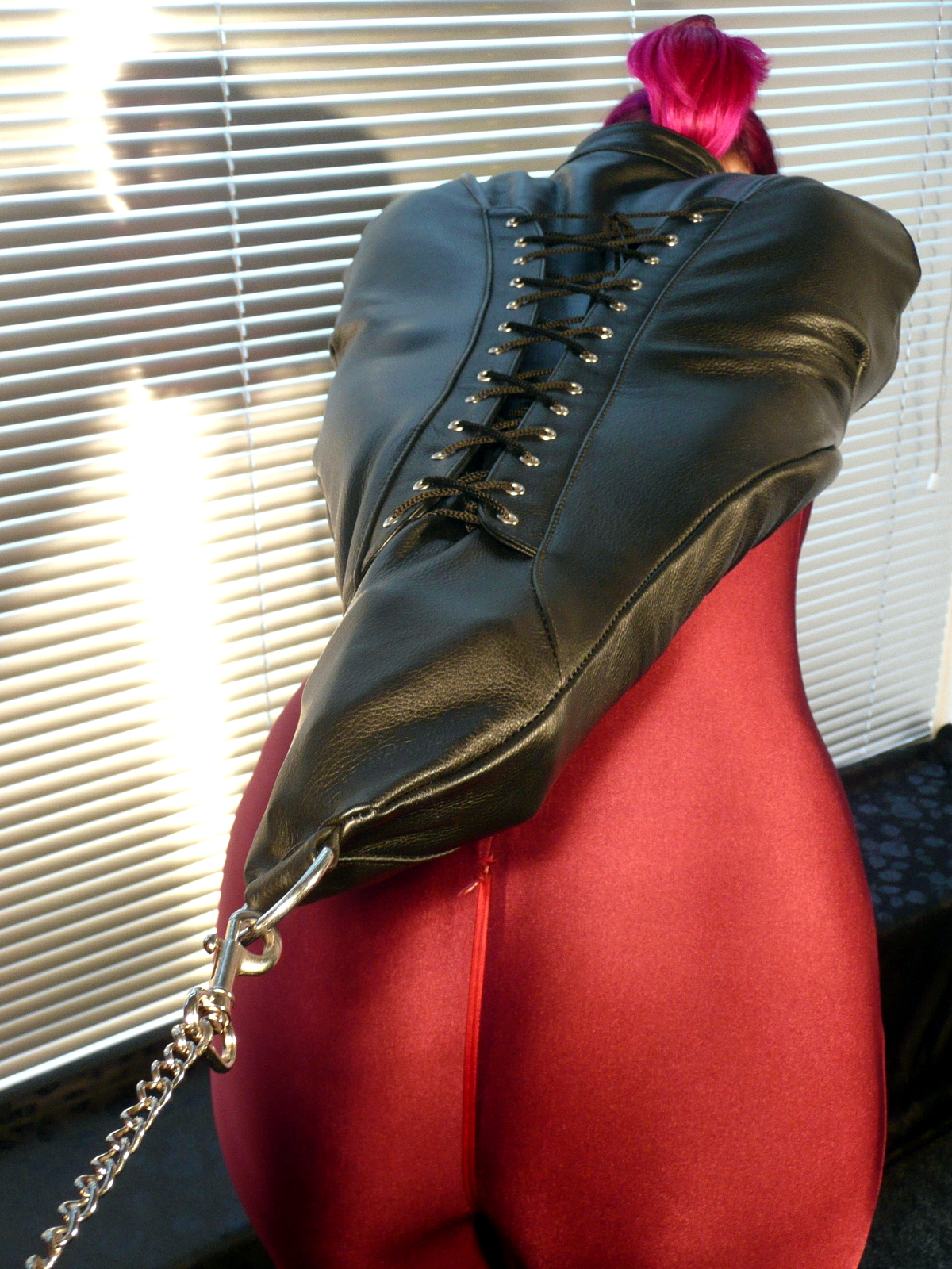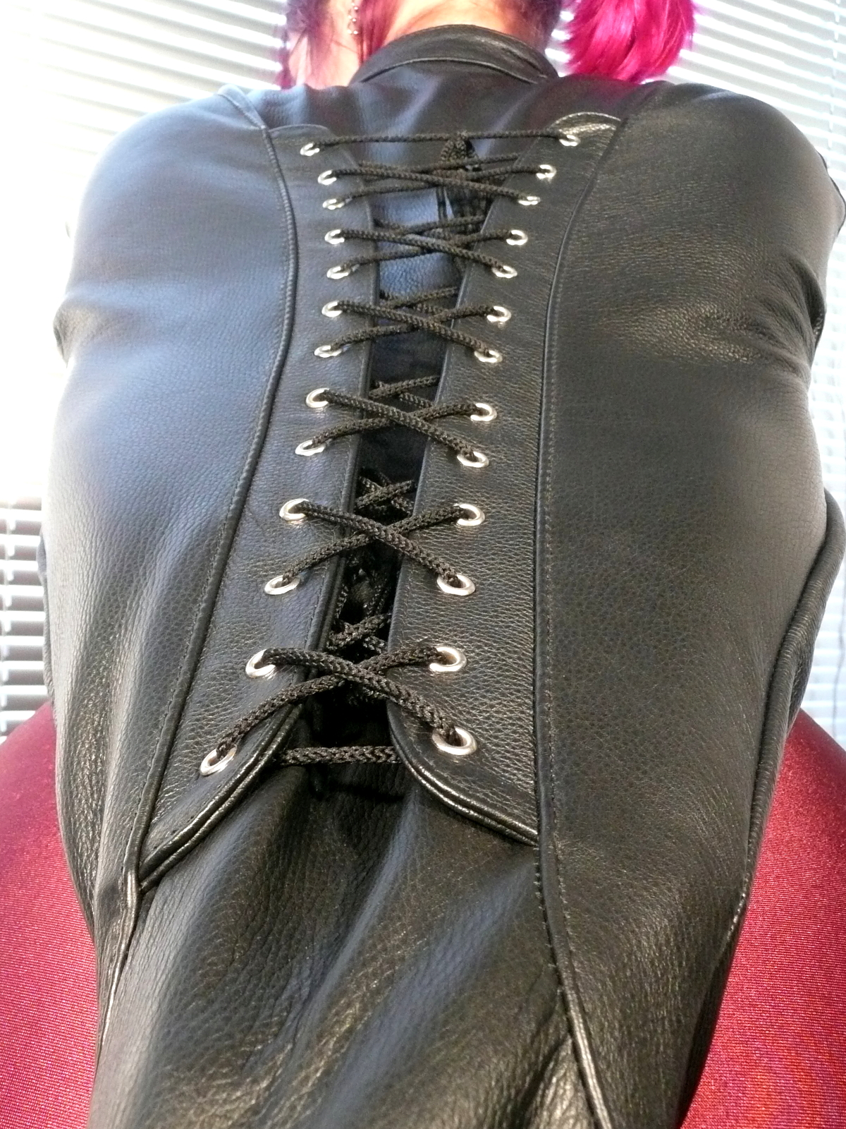 Die Fessel wird im Rücken von unten über die Arme gezogen, dann legt sich der obere Teil über die Schultern und wird über der Brust wie ein Bolero-Jäckchen mit zwei kleinen Riemen geschlossen. Mit der Schnürung wird dann die Weite für die Arme reguliert.