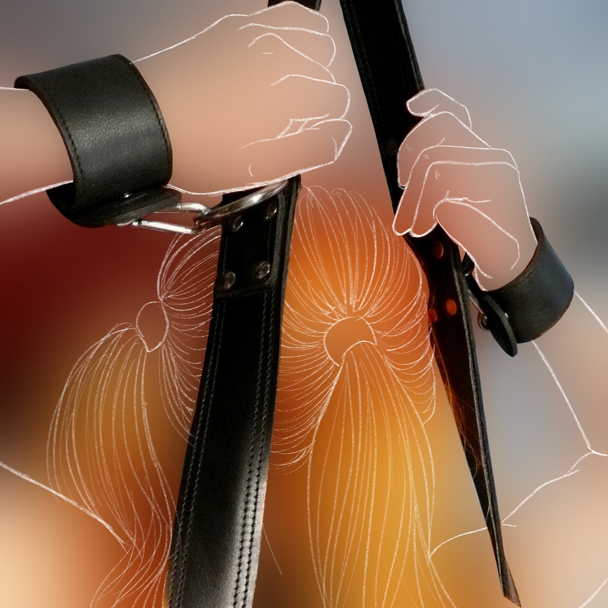 Auf den Fotos haben wir Manschetten aus unserer Mala-Serie benutzt. Alternativ können Sie natürlich auch andere Fesselmanschetten aus Ihrem Bestand nutzen, oder unsere Hand-Hängefesseln, oder auch Seile, oder . . . oder . . . oder . . .