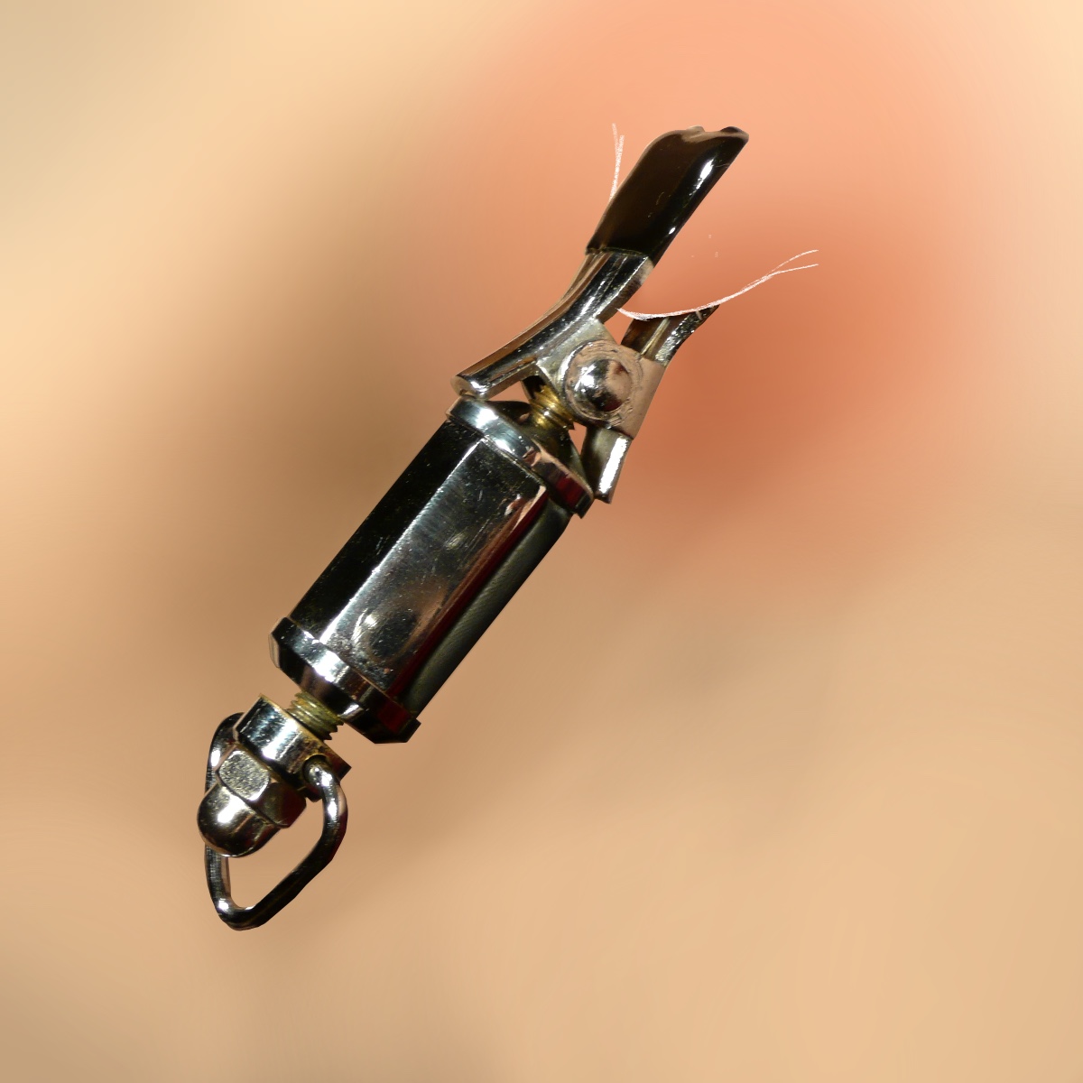 Gewicht (ca. 250 Gramm)  mit abschraubbarem Karabinerhaken und Bohrung im Boden zum Anschrauben von Zusatz-Gewichten Höhe ca. 4,8 Zentimeter (zuzüglich Halterung und Karabinerhaken) Durchmesser ca. 3 Zentimeter Hergestellt aus verchromtem Stahl