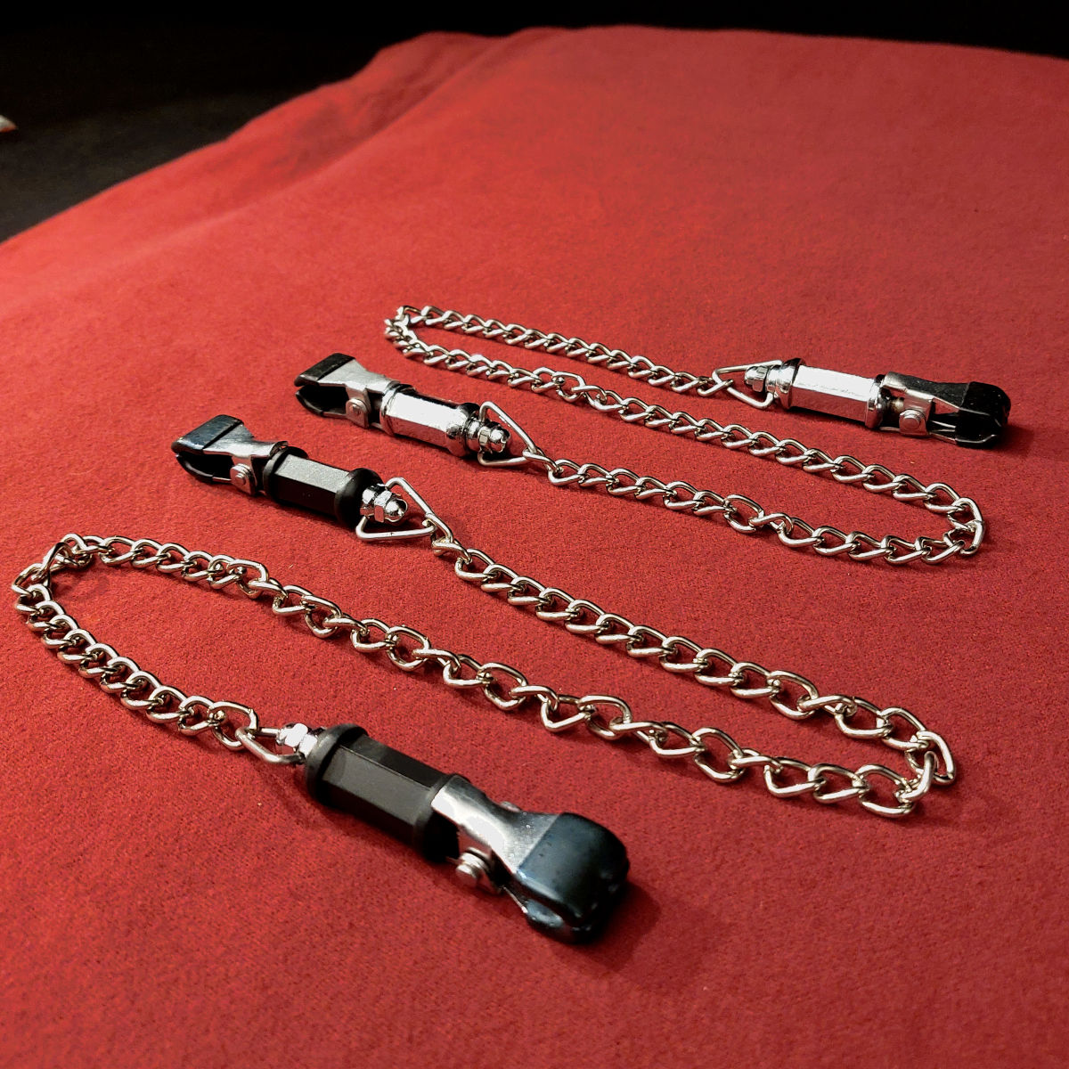 Bei dieser breiten Version verteilt die 16 Millimeter breite Auflagefläche den Druck auf eine größere Fläche als bei der schmalen Version. Damit sind diese Klammern vor allem für weibliche Nippel geeignet, da der erzeugte Schmerz flächiger und damit erträglicher wird.