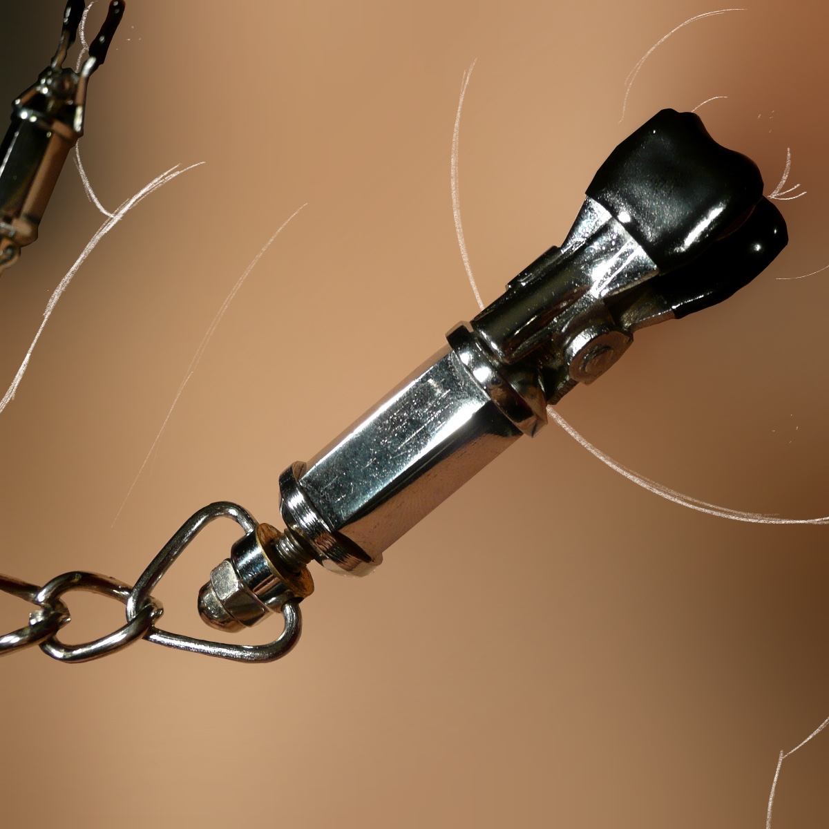 Mit der dekorativen Kette kann auf beide Klammern gleichzeitig Zug ausgeübt werden, wobei die Person -soweit möglich- dem Zug bestimmt Folge leisten wird, da die Kunststoff-Ummantelung bei dieser breiten Version der Klammern ein Abrutschen noch effektiver verhindert.