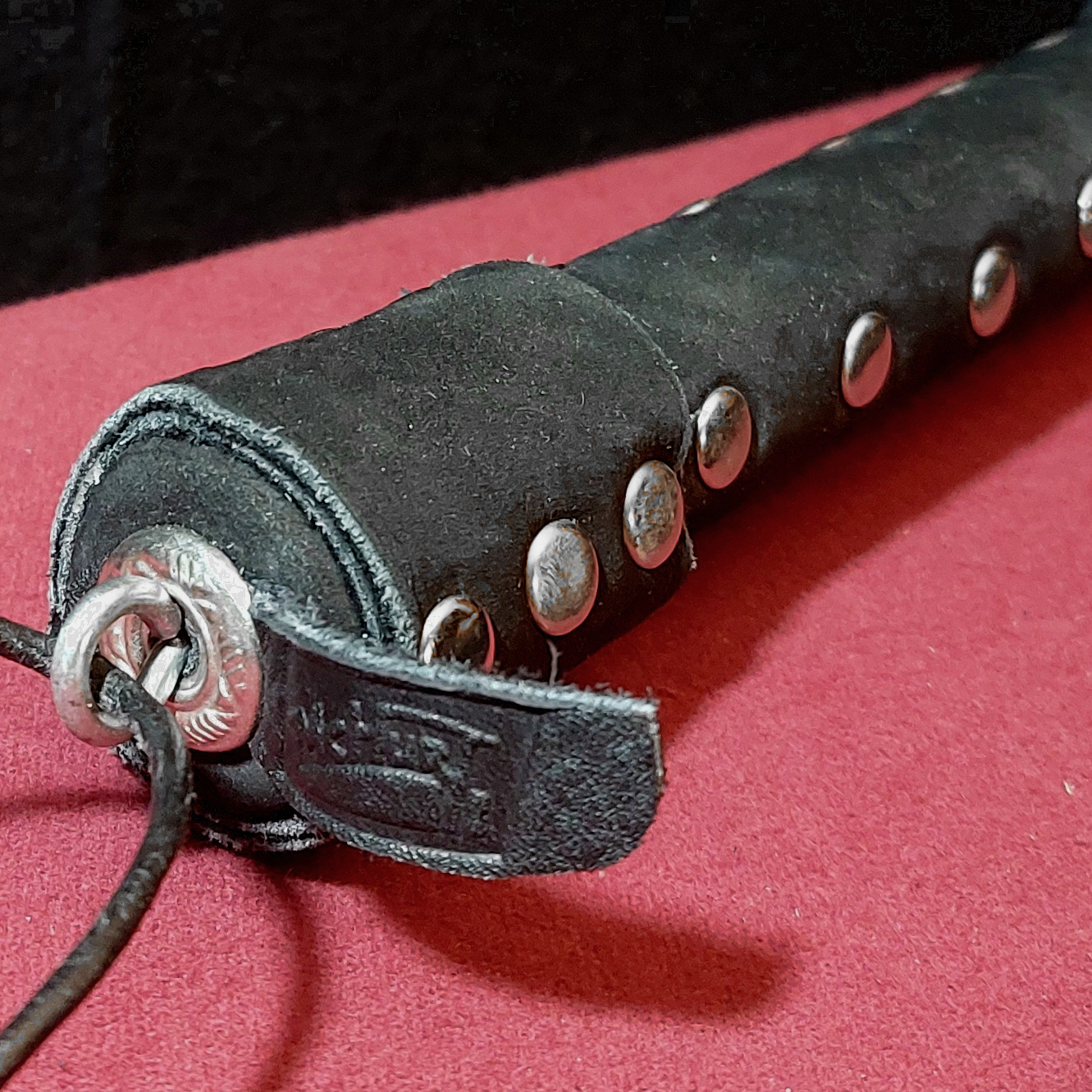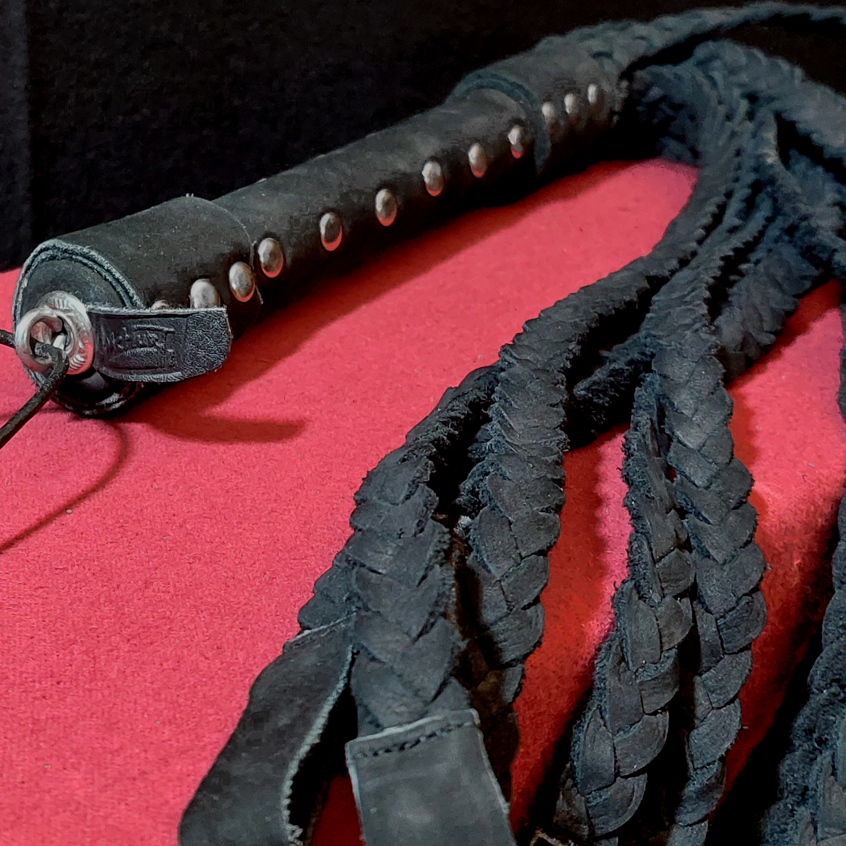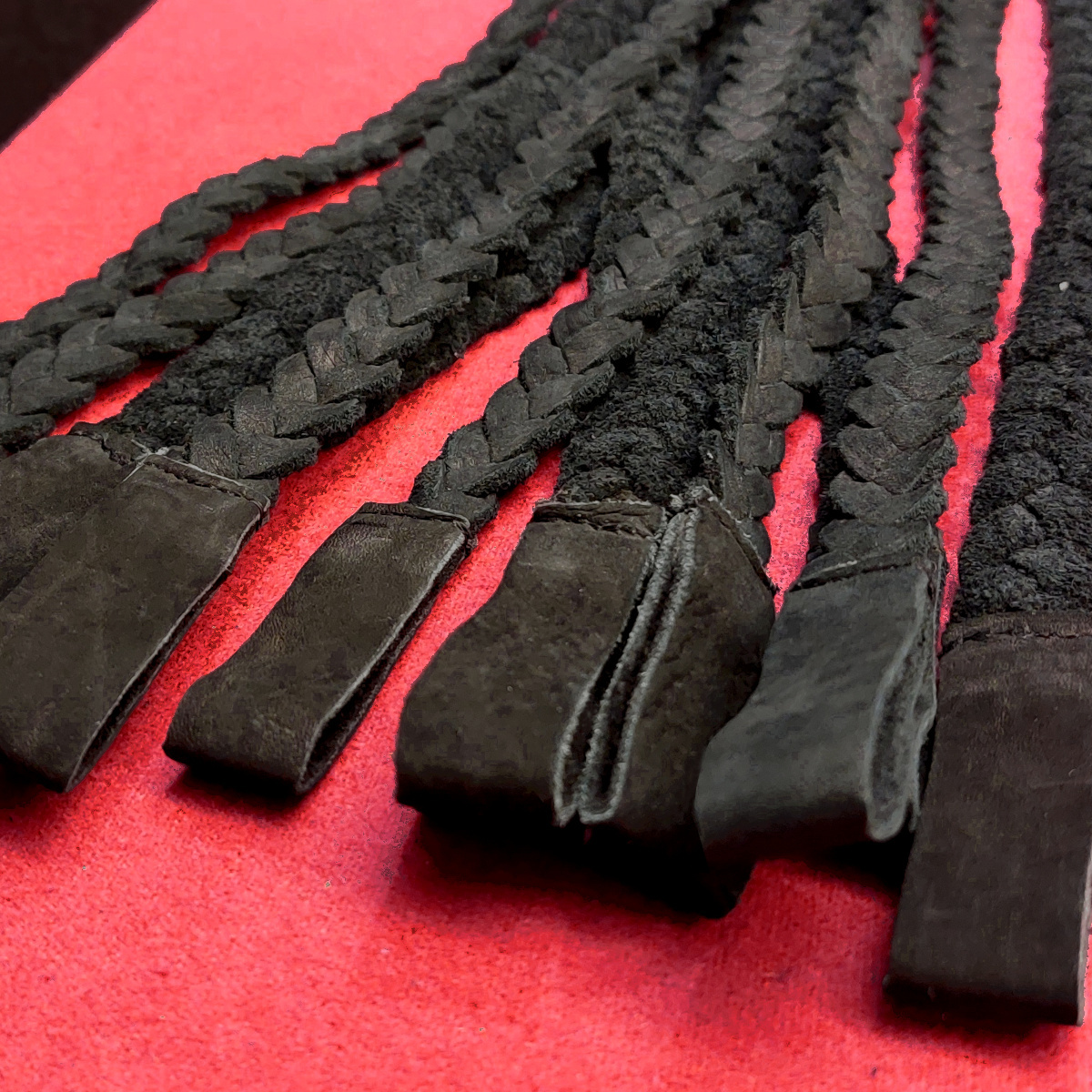 Flogger aus edlem Nubuk-Leder in dunkel-anthrazit mit 12 flach geflochtenen Tails, die in soften "Mini-Klatschen" enden.
