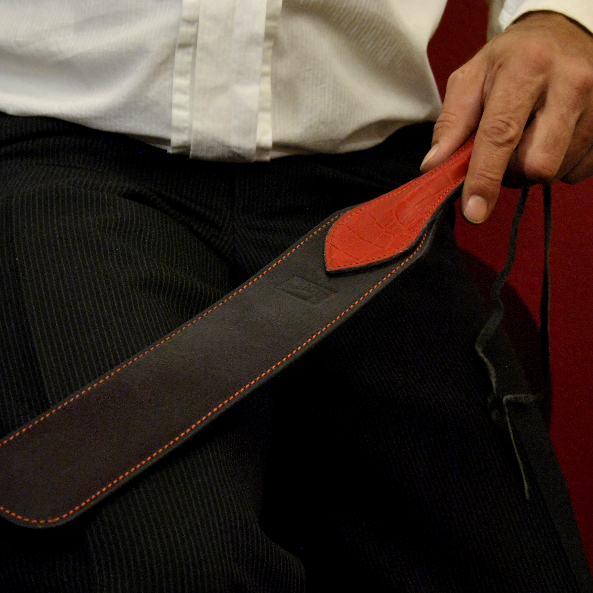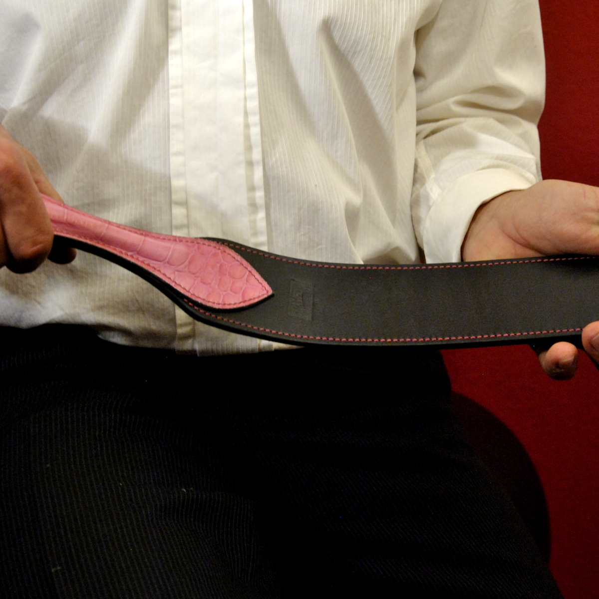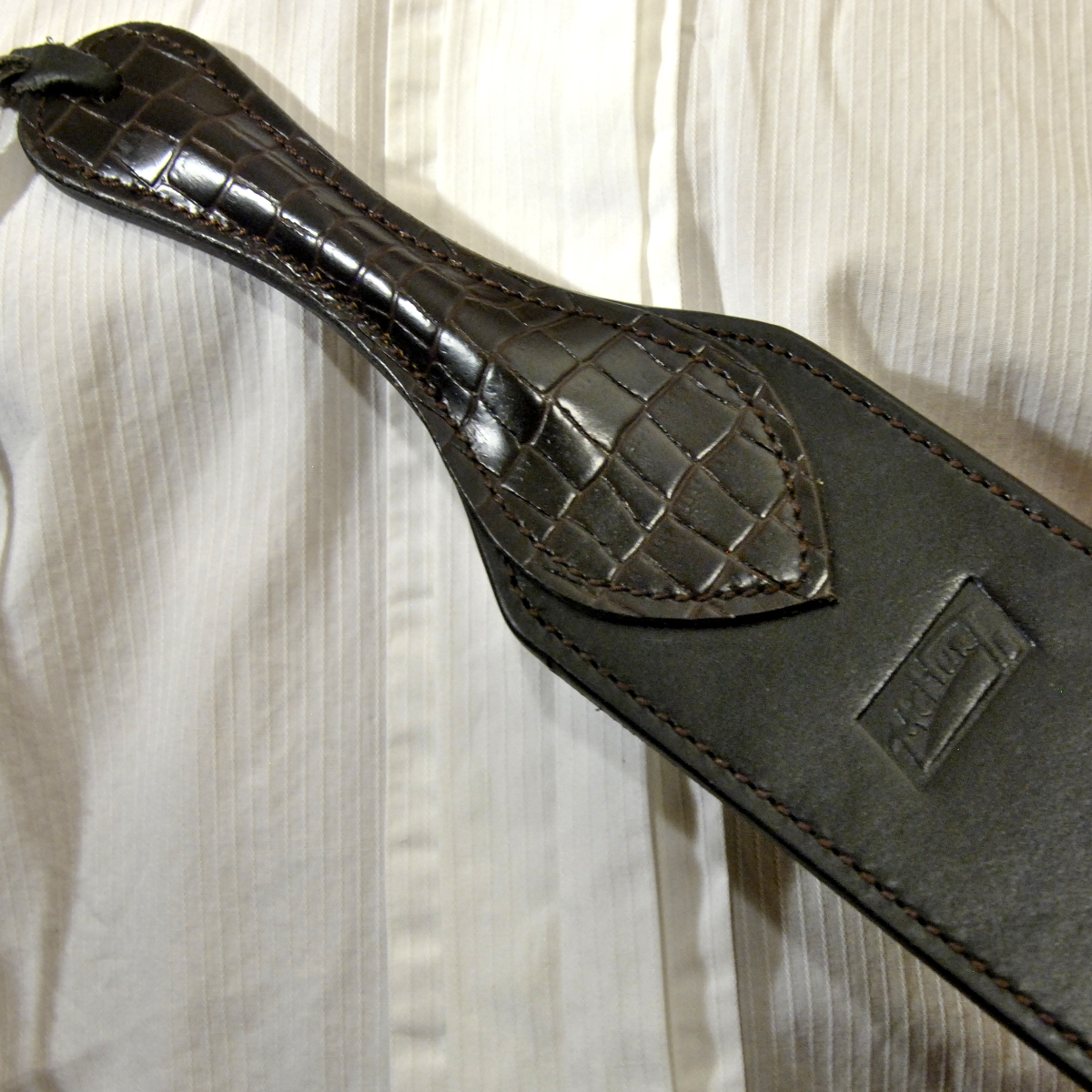 Der Crocodile-Strap wird aus dickem, sehr steifen Leder hergestellt. Dadurch ist die Wirkung sehr gut dosierbar von spielerisch klatschend bis streng und strafend.