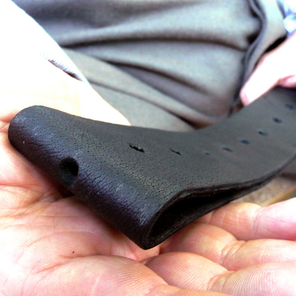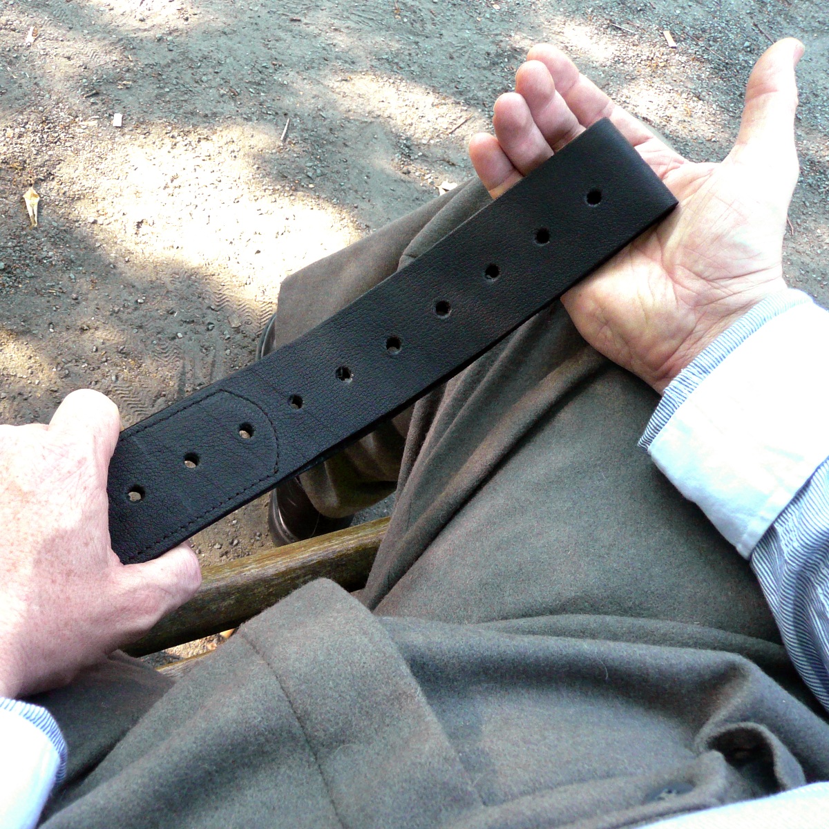 Wenn man mit einem langen Gürtel optimal spanken will, muß man ihn relativ kurz fassen und hat hinten einen langen störenden Überhang. Diesen Überhang haben wir einfach weg gelassen und entstanden ist ein sehr handliches und äußerst funktionales Instrument, das sich hervorragend für ausgedehnte Spanking-Sessions eignet.