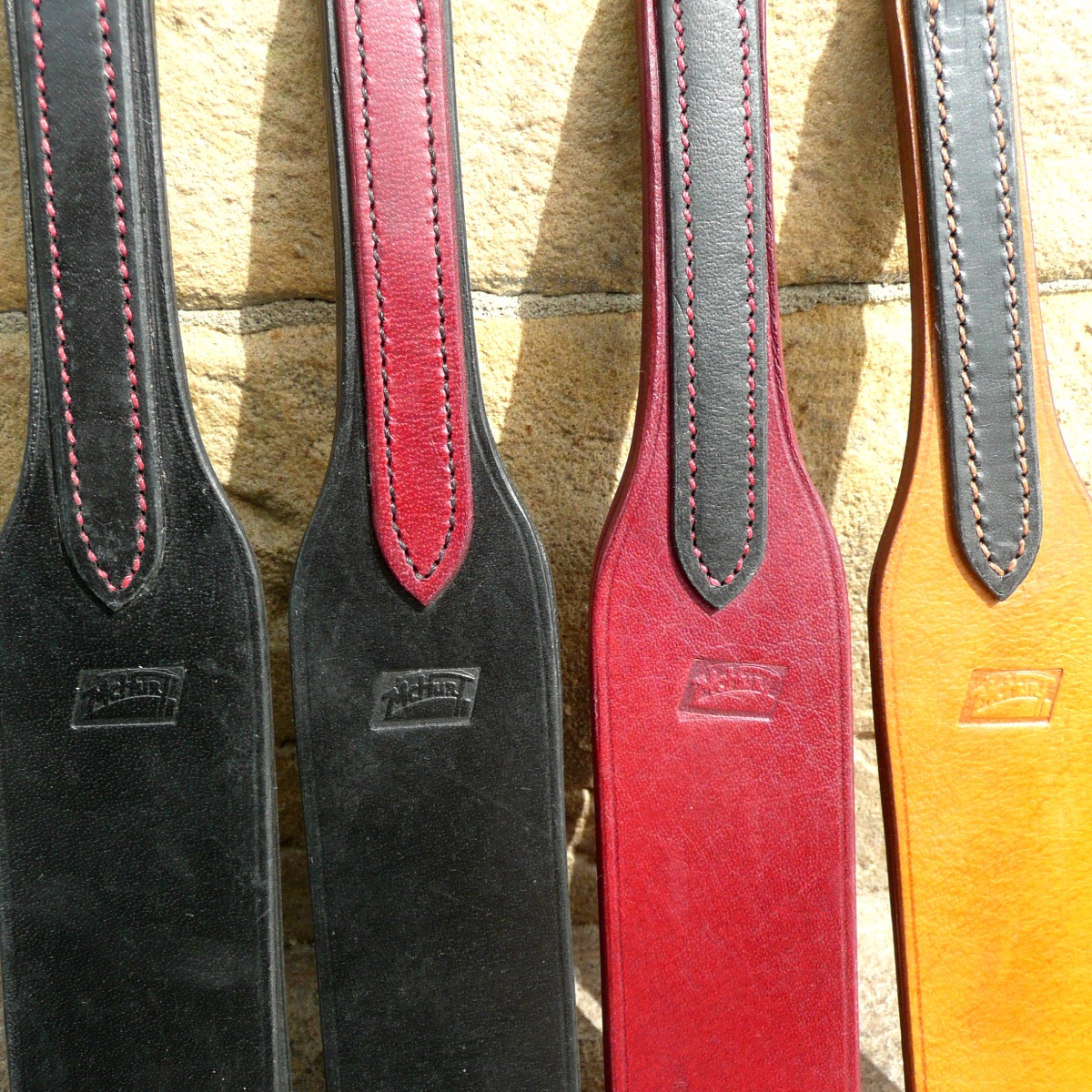 Wir verwenden für die Herstellung des Gesinnungs-Anpassers unser hochwertiges englisches Sattel-Leder mit (s. Zusatz-Information unten) in folgenden Farbvarianten: