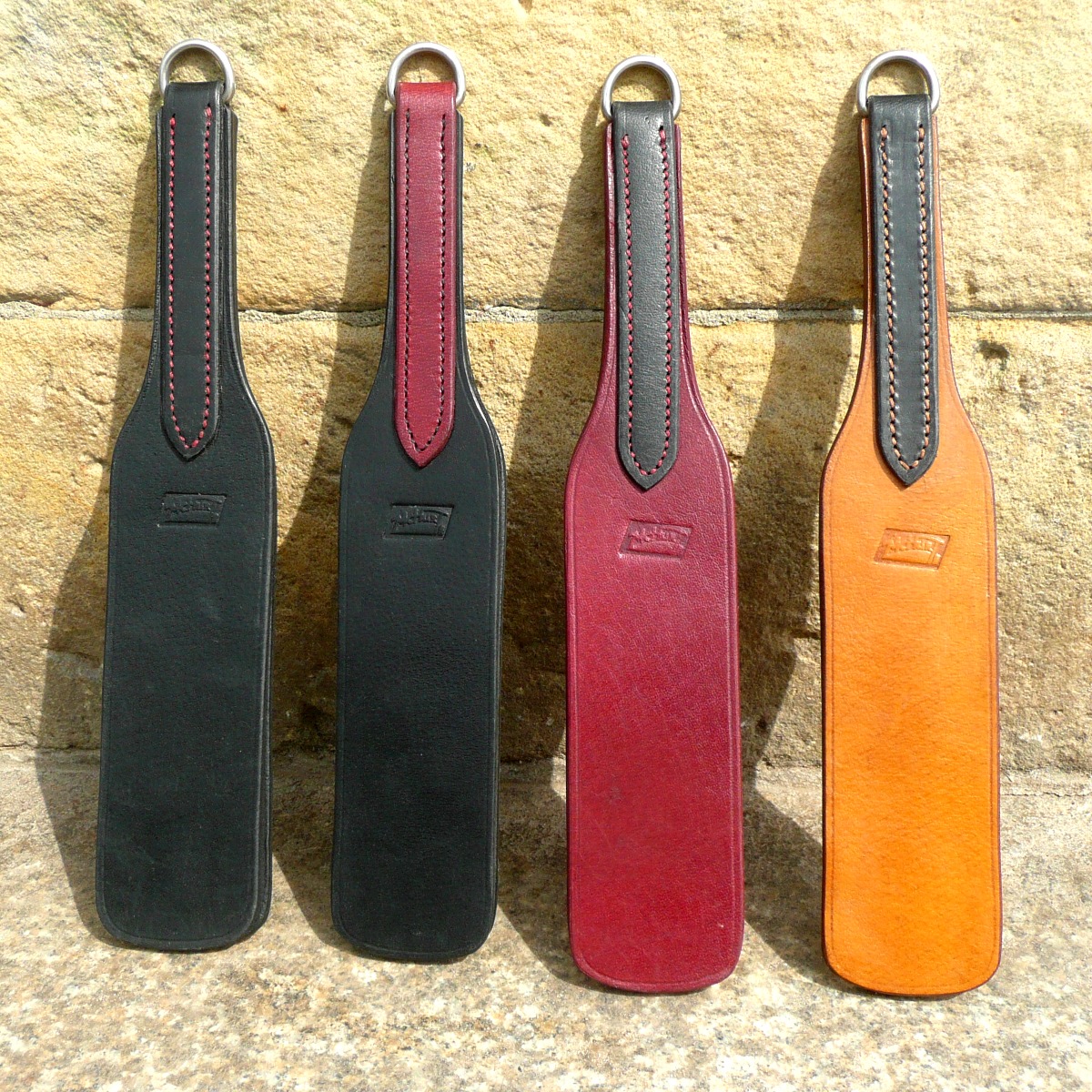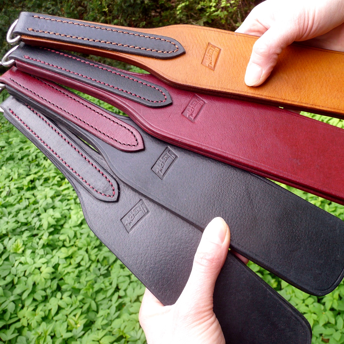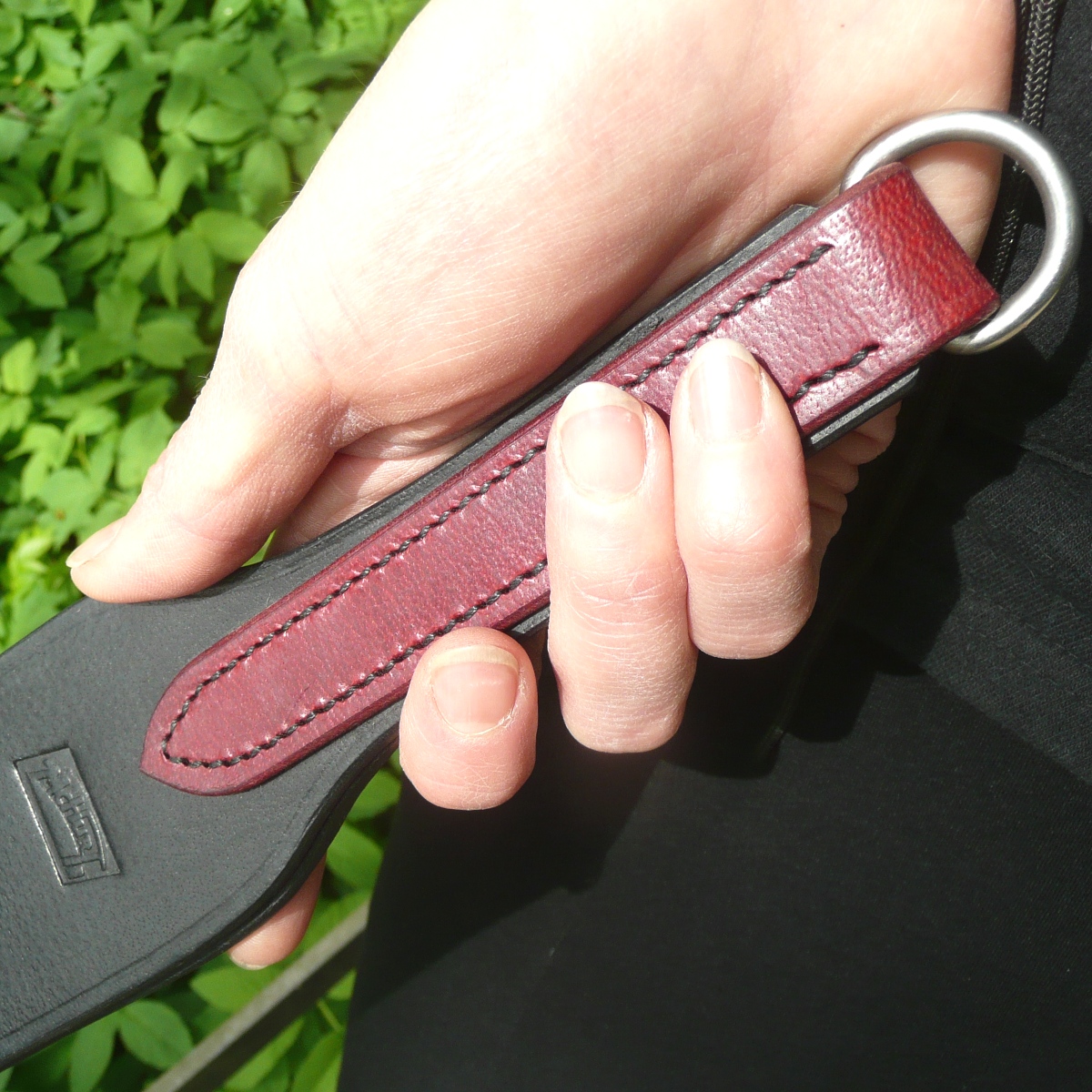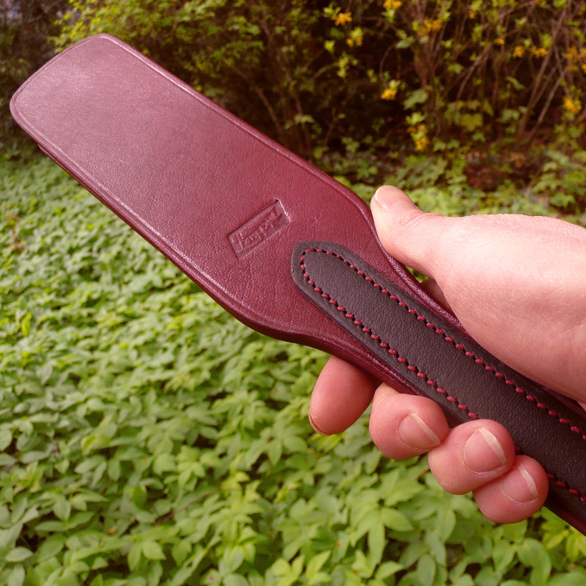 Der Griff wird mit einem separaten Streifen Leder aufgebaut, der um die beiden Lagen der Klatsche genäht wird und für einen komfortablen Halt in der Hand sorgt. Alle Kanten des Slappers sind sorgfältig abgerundet und mit einer geprägten Zierlinie versehen.