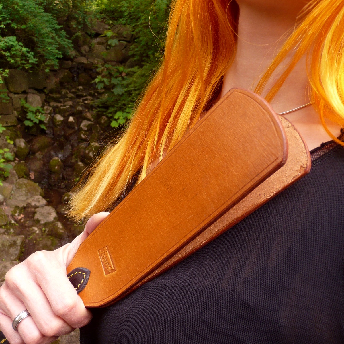 Die beiden Schichten aus dickem steifen Leder erhalten ihre Schwingung hauptsächlich aus dem schmalen Übergang des verstärkten Griffs. Bei leichteren Schlägen treffen sie mit kurzer Verzögerung auf, was ein charmantes doppeltes Klacken wie ein Echo verursacht. Die Wirkung hält sich dann noch auf einer Ebene, die es zulässt, sich Gedanken über die Gesinnung und Verfehlungen zu machen. Je kräftiger aber der Schlag wird, desto mehr tritt dieser Effekt in den Hintergrund und die Wirkung steigert sich zu der eines bösen Paddels.