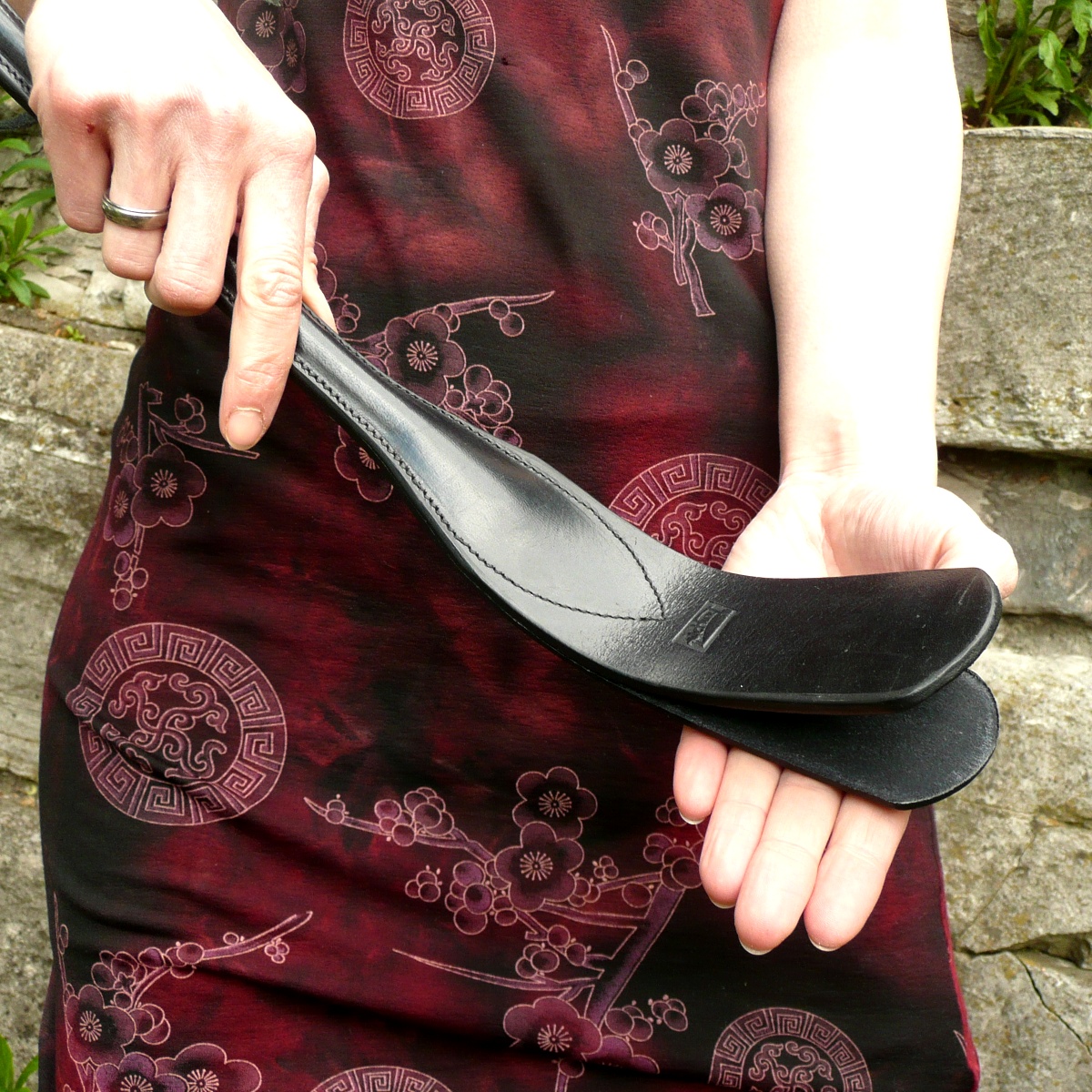 Charakteristische Merkmale sind die breite Doppelklatsche und eine elastische Einlage im Griff, die dem Instrument die Schwingung und das besondere Schlagverhalten gibt.