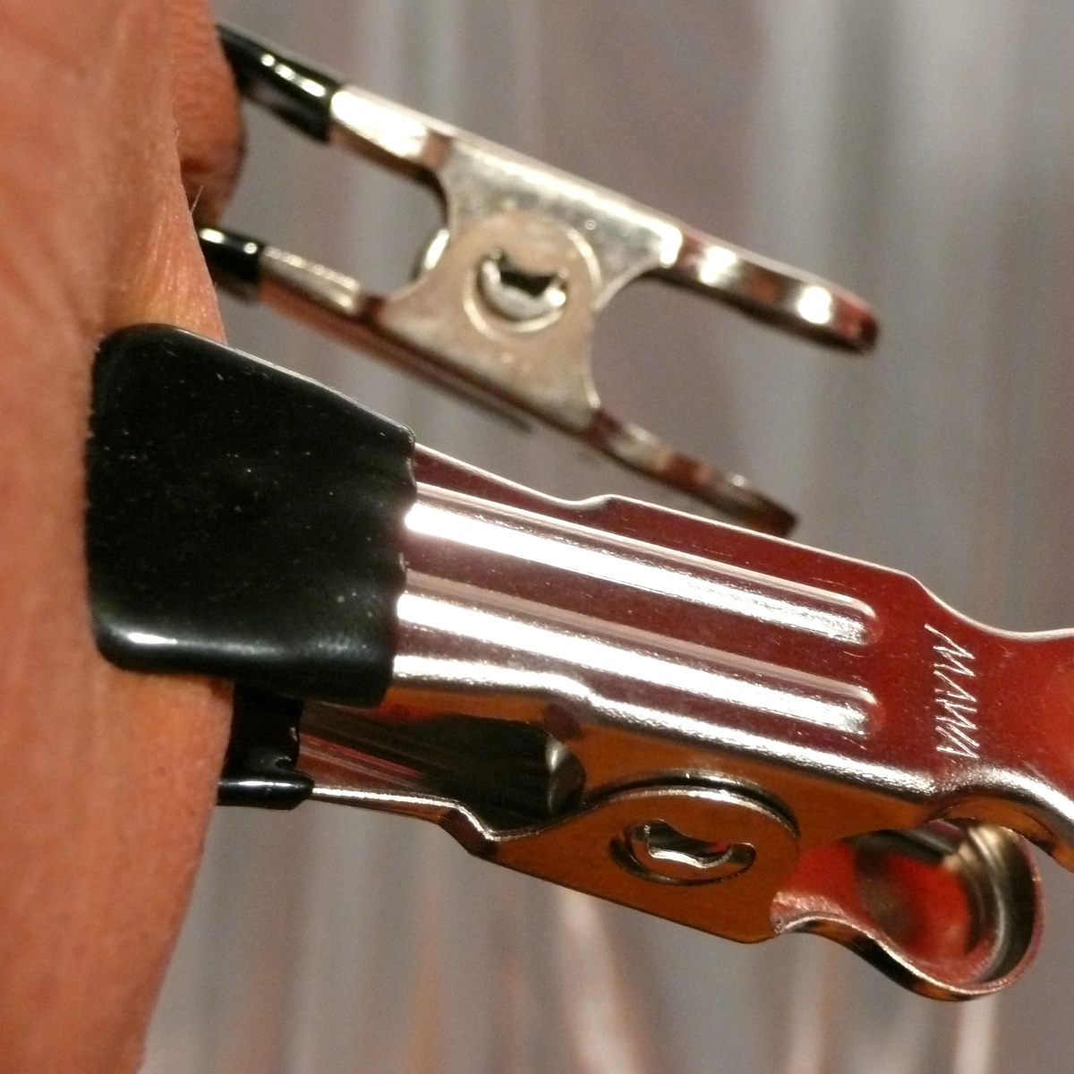 These grips distribute the pressure over a relatively large area and hardly ever slip off because of their plastic covers.Accordingly with their hooks these clamps are particularly suitable for attachment of weights or connecting cords or . . . or . . . or . . . We carry MAWA-grips with two varyingly strong springs. This softer version is especially suited for the genital area and sensitive female nipples, which normally can't take grips. Length approx. 7 centimetres (incl.hook) Delivery: 1 pair