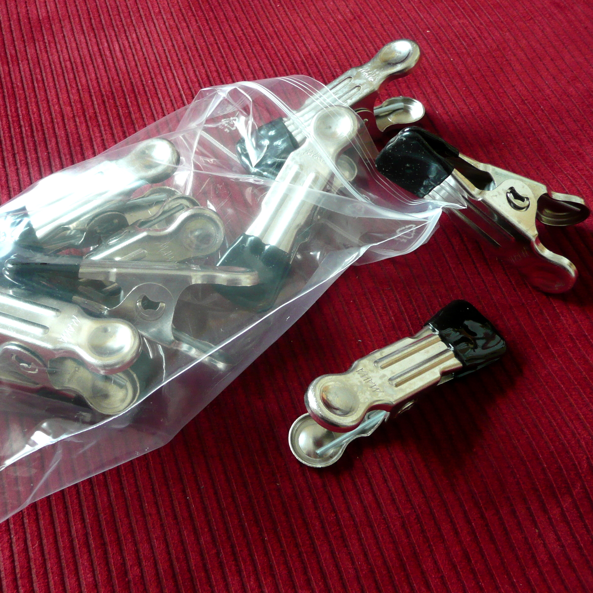 These grips distribute the pressure over a relatively large area and hardly ever slip off because of their plastic covers.Accordingly with their hooks these clamps are particularly suitable for attachment of weights or connecting cords or . . . or . . . or . . . We carry MAWA-grips with two varyingly strong springs. This softer version is especially suited for the genital area and sensitive female nipples, which normally can't take grips.Additionally this pack of 10 provides an opportunity to install mountings on several positions of the body for decorative lacings. Therefor the used cord should not be thicker than 5 millimetres to ensure a good run through the hooks. Length approx. 7 centimetres (incl.hook) Delivery: 1o pieces