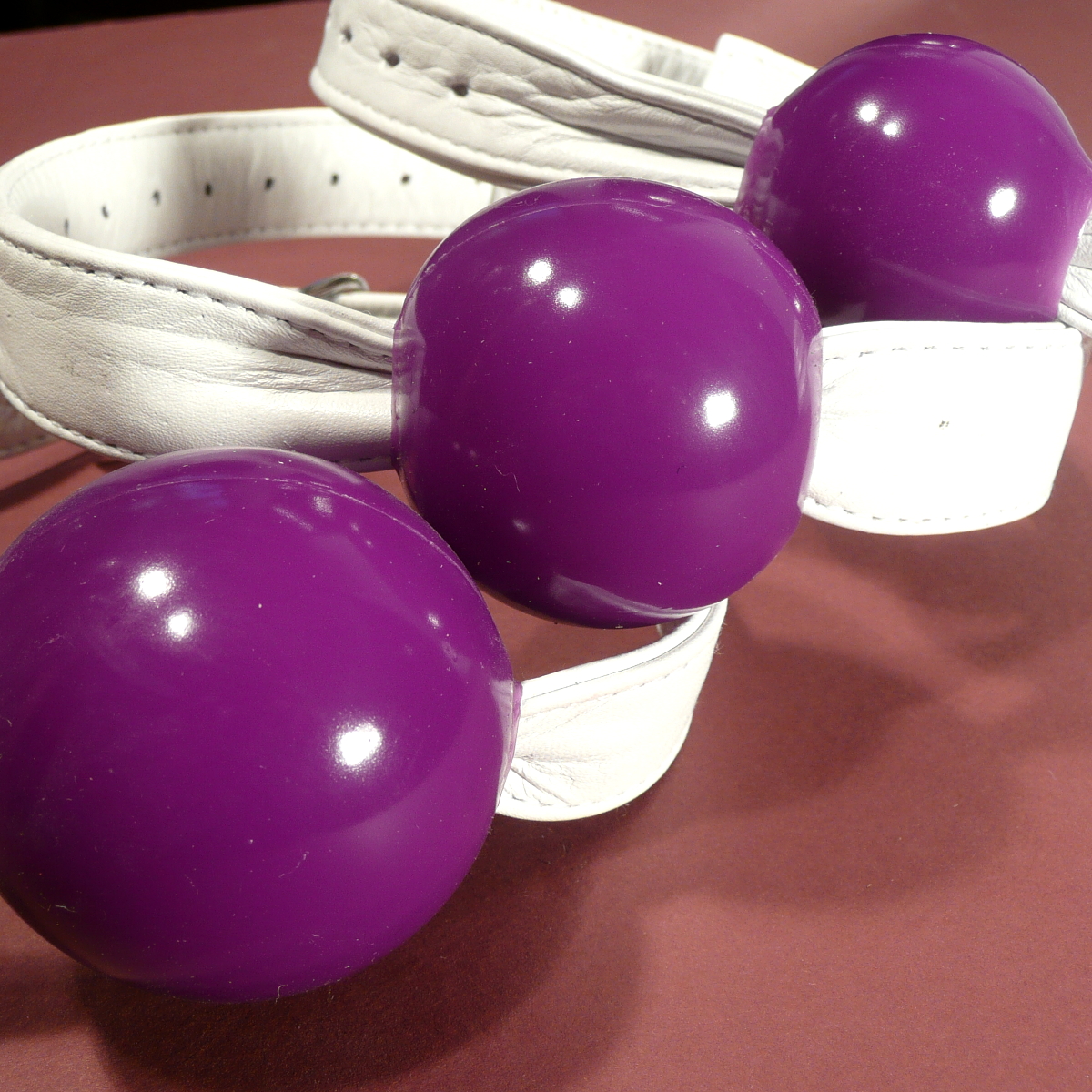 Silicone Ball Gag, purple (with white leather strap)