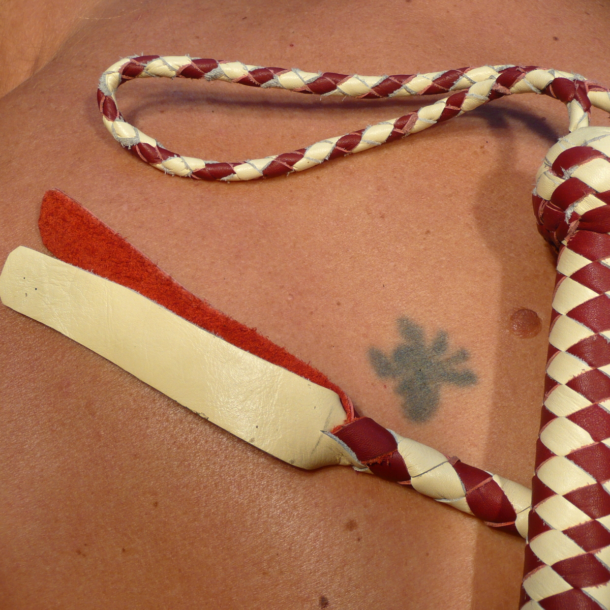 "Estefa" ist eine kurze, schlanke Singletail, die sich durch eine hervorragende Kombination aus Flexibilität und Steifigkeit sehr präzise führen und dosieren lässt. Sie wird aufwendig vom Ende her aus Rindleder geflochten, im unteren Drittel vierfach, im oberen Teil achtfach. Lässt man nur die beiden flexiblen Spitzen über die Haut streichen, ist der erzeugte Schmerz spitz, aber gut erträglich. Trifft das geflochtene Ende, so wird die Wirkung erheblich schärfer. Die Enden erhalten dann eine erhebliche zusätzliche Beschleunigung und können sehr deutliche Spuren hinterlassen. Gesamtlänge der Peitsche ca. 75 Zentimeter, Länge der Doppelspitze ca. 10 Zentimeter, Durchmesser im Griffbereich ca. 22 Millimeter