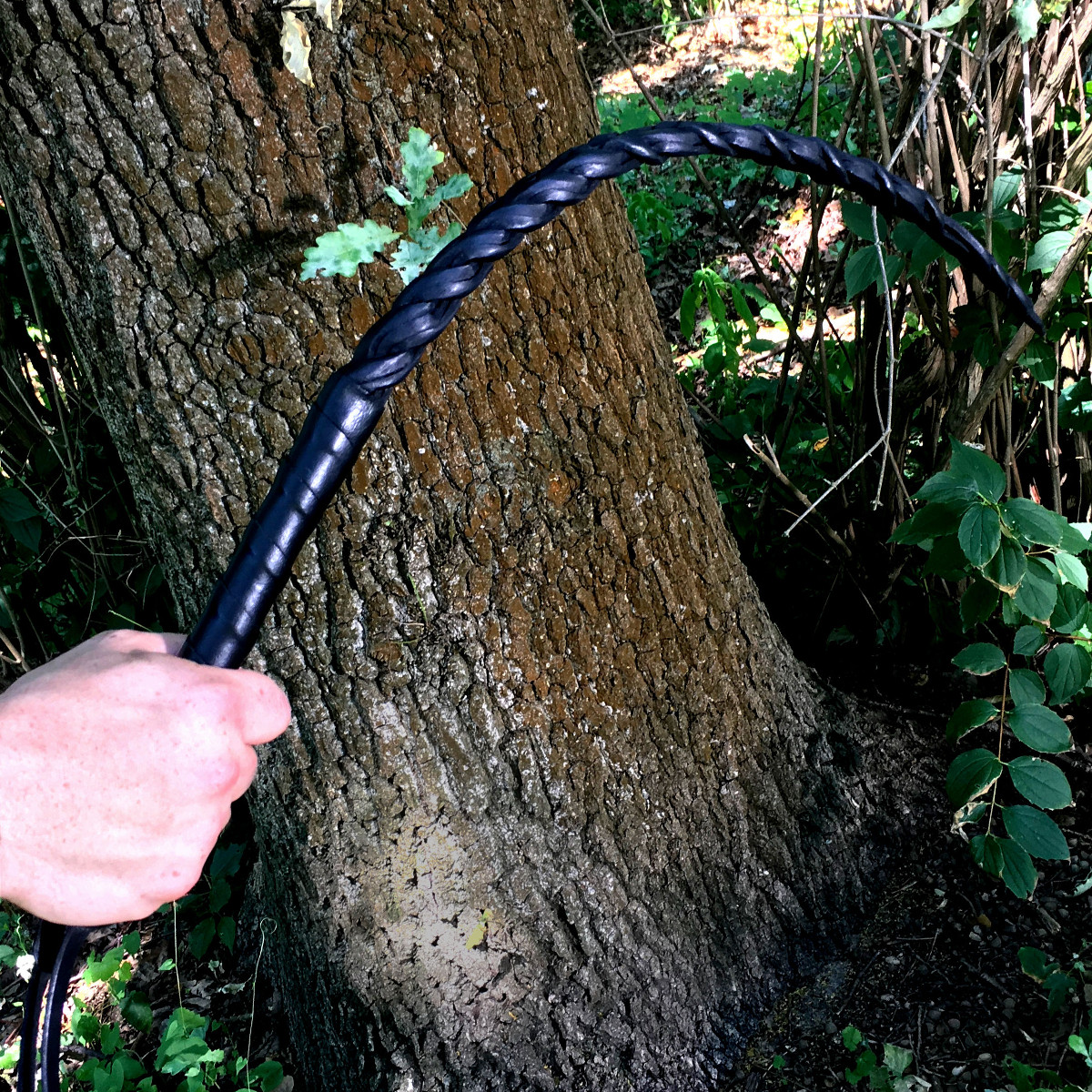 Diese Hundepeitsche hat eine eigentlich für diese Gattung unübliche Einlage aus Holz im Griff.Damit lässt sie sich wie eine typische Singletail nutzen. Ansonsten verfügt dieses Modell aber über die typischen Details einer Hundepeitsche: Am Griff ist ein Karabinerhaken eingearbeitet, mit dem die Peitsche am Hundehalsband eingeklinkt werden kann, wenn man sie umgedreht als Hundeleine nutzen will. Kurz vor dem Ende der Peitsche geht die Flechtung in zwei ungeflochtene Lagen Leder über, die so eine Handschlaufe bilden, um den Hund sicher führen zu können.Der schlange Griff ist mit einem breiten Streifen Leder teilweise überlappend umwickelt. Dadurch ergibt sich eine etwas unebene Struktur des Griffs, die einen sicheren Halt in der Hand gewährleistet.Die Wirkung von Hundepeitschen ist generell als recht heftig einzustufen. Das gilt auch für dieses Modell. Also bitte mit Vorsicht ausprobieren!Wir fertigen diese Hundepeitsche aus unserem geölten Sattel-Leder (s. Zusatz-Information unten) in schwarz Gesamtlänge ca. 93 Zentimeter (zzgl. Karabinerhaken), Länge des Griffs ca. 21 Zentimeter Durchmesser des Griffs ca. 2 bis 2,3 Zentimeter, Gewicht ca. 200 Gramm