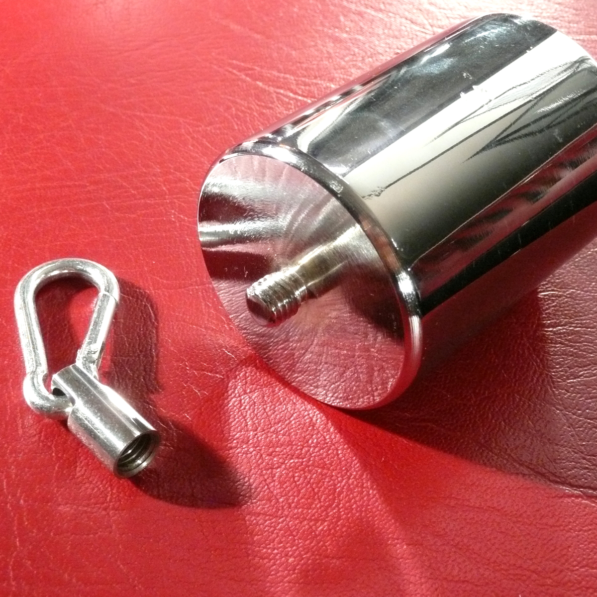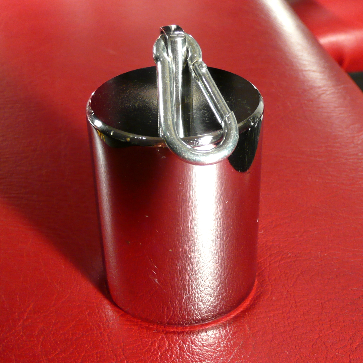 Gewicht (ca. 250 Gramm) mit abschraubbarem Karabinerhaken und Bohrung im Boden zum Anschrauben von Zusatz-Gewichten Höhe ca. 4,8 Zentimeter (zuzüglich Halterung und Karabinerhaken) Durchmesser ca. 3 Zentimeter Hergestellt aus verchromtem Stahl