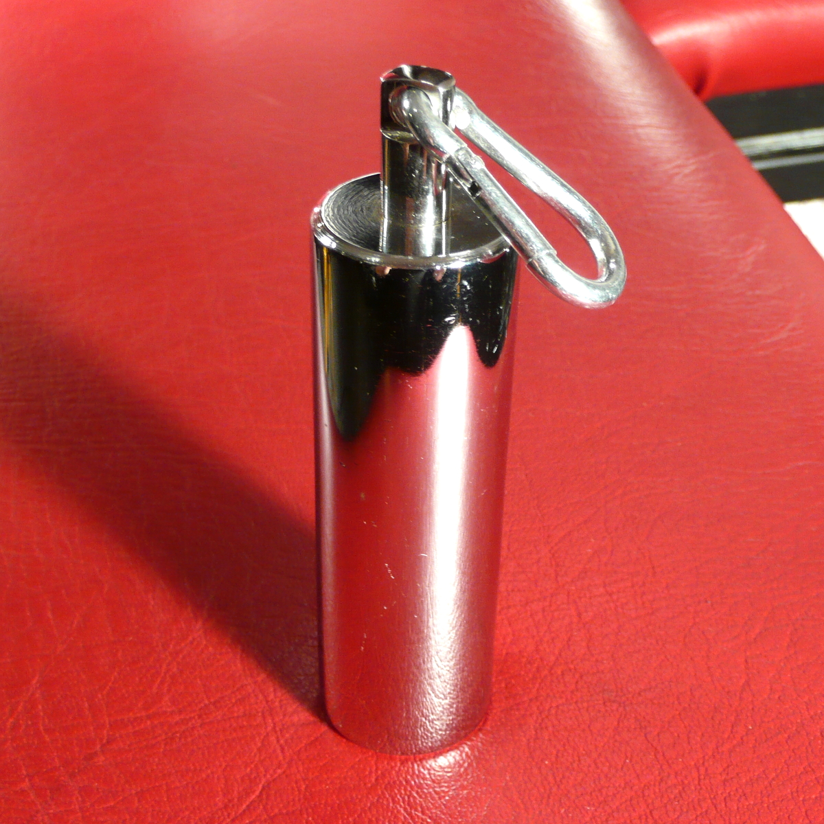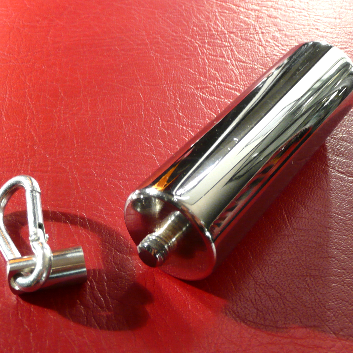 Gewicht (ca. 250 Gramm) mit abschraubbarem Karabinerhaken und Bohrung im Boden zum Anschrauben von Zusatz-Gewichten Höhe ca. 4,8 Zentimeter (zuzüglich Halterung und Karabinerhaken) Durchmesser ca. 3 Zentimeter Hergestellt aus verchromtem Stahl