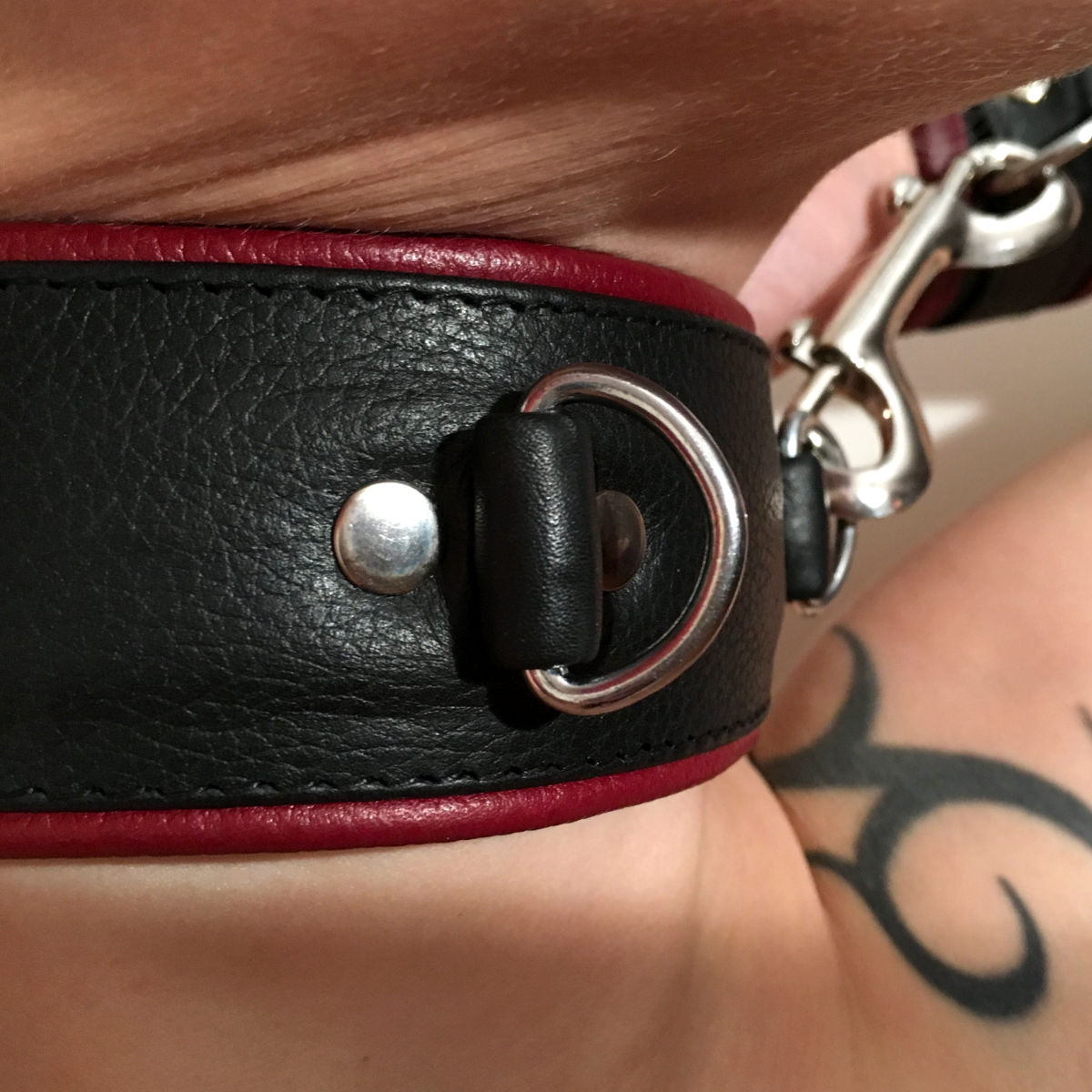 Die schmalen Lederpaspeln in Bordeaux-rot verleihen dem gesamten Halsband eine gewisse Eleganz, besonders wenn sie mit farblich passenden Manschetten (wie unseren Wotan-Manschetten) kombiniert werden.