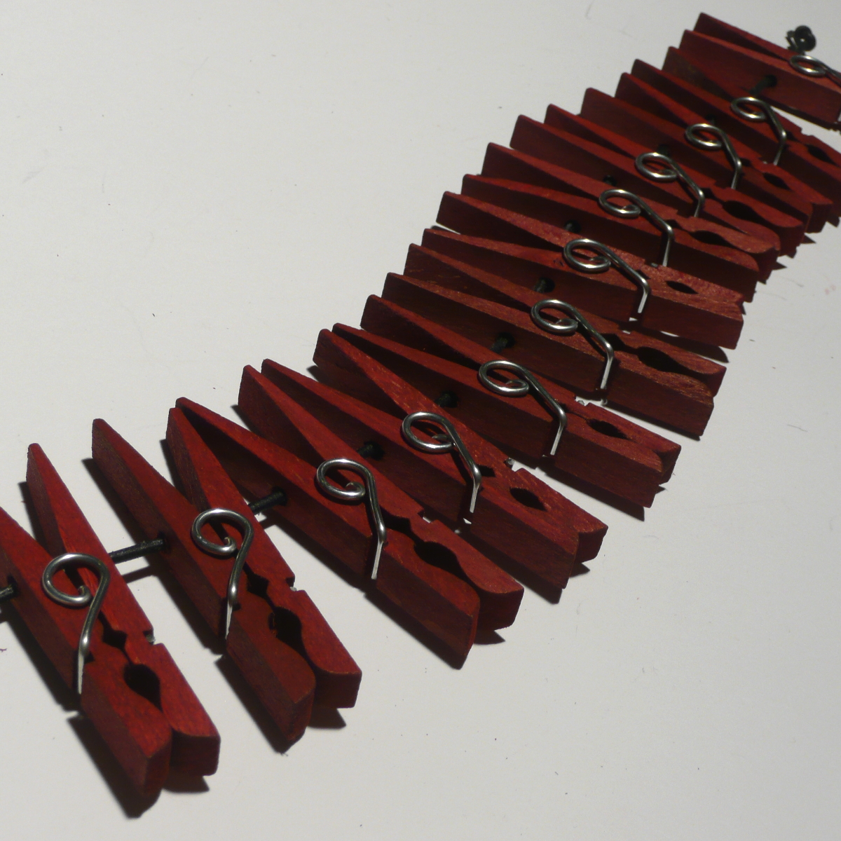 Sechs rote Holzklammern mit einer speziellen Feder, die ein Verdrehen verhindert. Die Verbindung der Klammern mit einer Lederschnur macht dieses Set zum gemeinen Spielzeug. Werden die Klammern in einer Reihe gesetzt, lassen sie sich mit einem kräftigen Zug an der Verbindungsschnur ruckartig Abziehen. Da sagt niemand mehr, dass Wäscheklammern harmlos sind!
