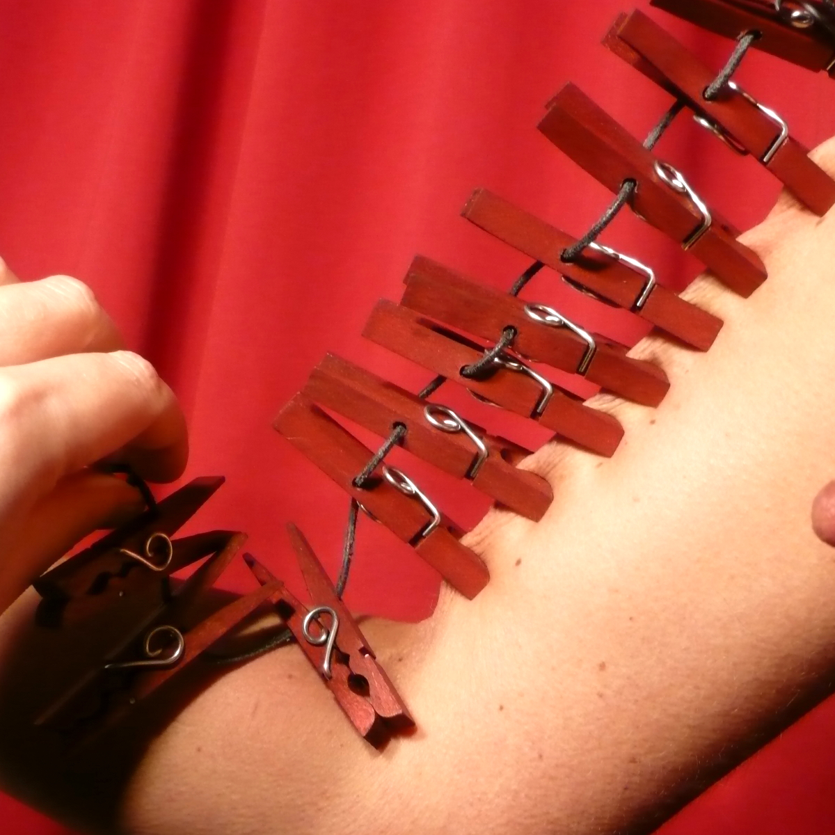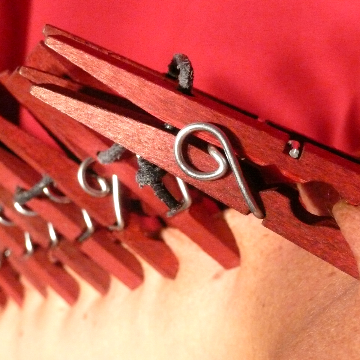 Zwölf rote Holzklammern mit einer speziellen Feder, die ein Verdrehen verhindert. Um diese lange Reihe zu setzen, braucht es genügend elastisches Gewebe. Die Menge der Klammern wird für das Opfer bereits zur Herausforderung. Werden dann aber alle zwölf Klammern mit einem Ruck abgezogen, entpuppen sie sich als beissendes Ungeheuer!