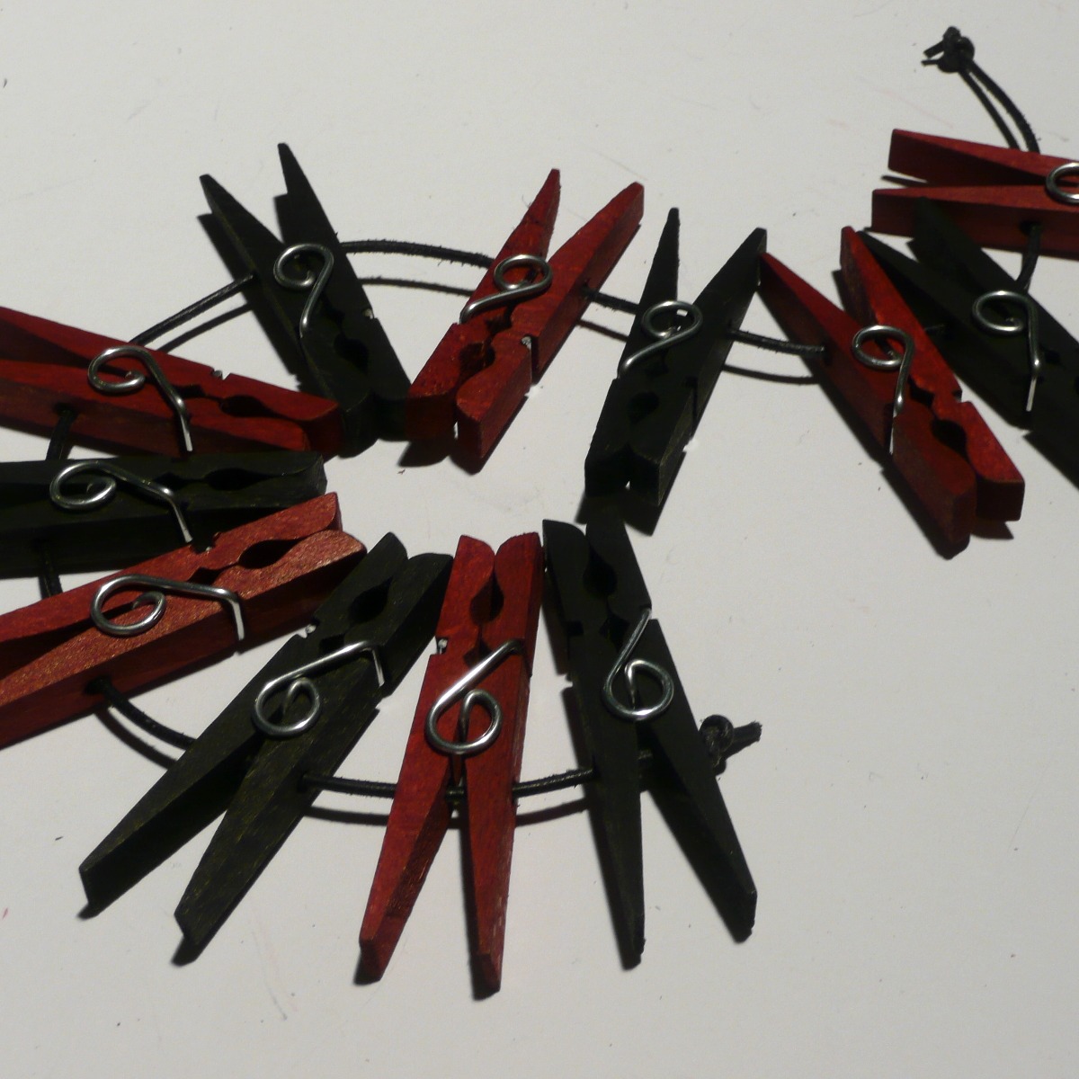 Set aus je drei schwarzen und roten Holzklammern mit einer speziellen Feder, die ein Verdrehen verhindert. Die Verbindung der Klammern mit einer Lederschnur macht dieses Set zum gemeinen Spielzeug. Werden die Klammern in einer Reihe gesetzt, lassen sie sich mit einem kräftigen Zug an der Verbindungsschnur ruckartig Abziehen. Da sagt niemand mehr, dass Wäscheklammern harmlos sind!