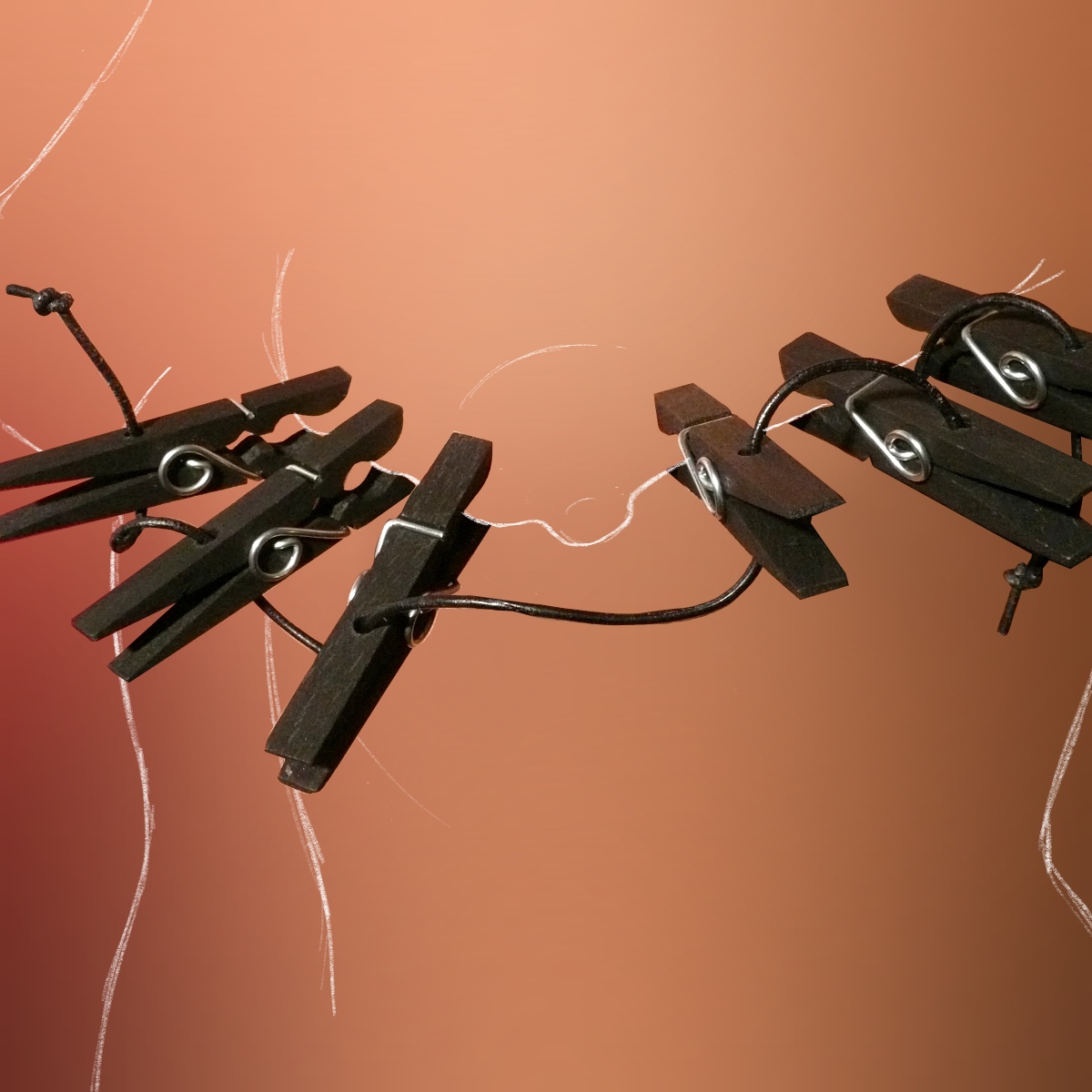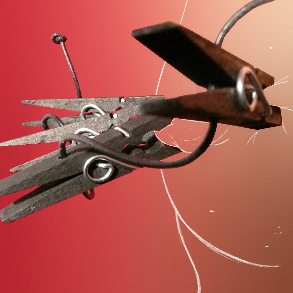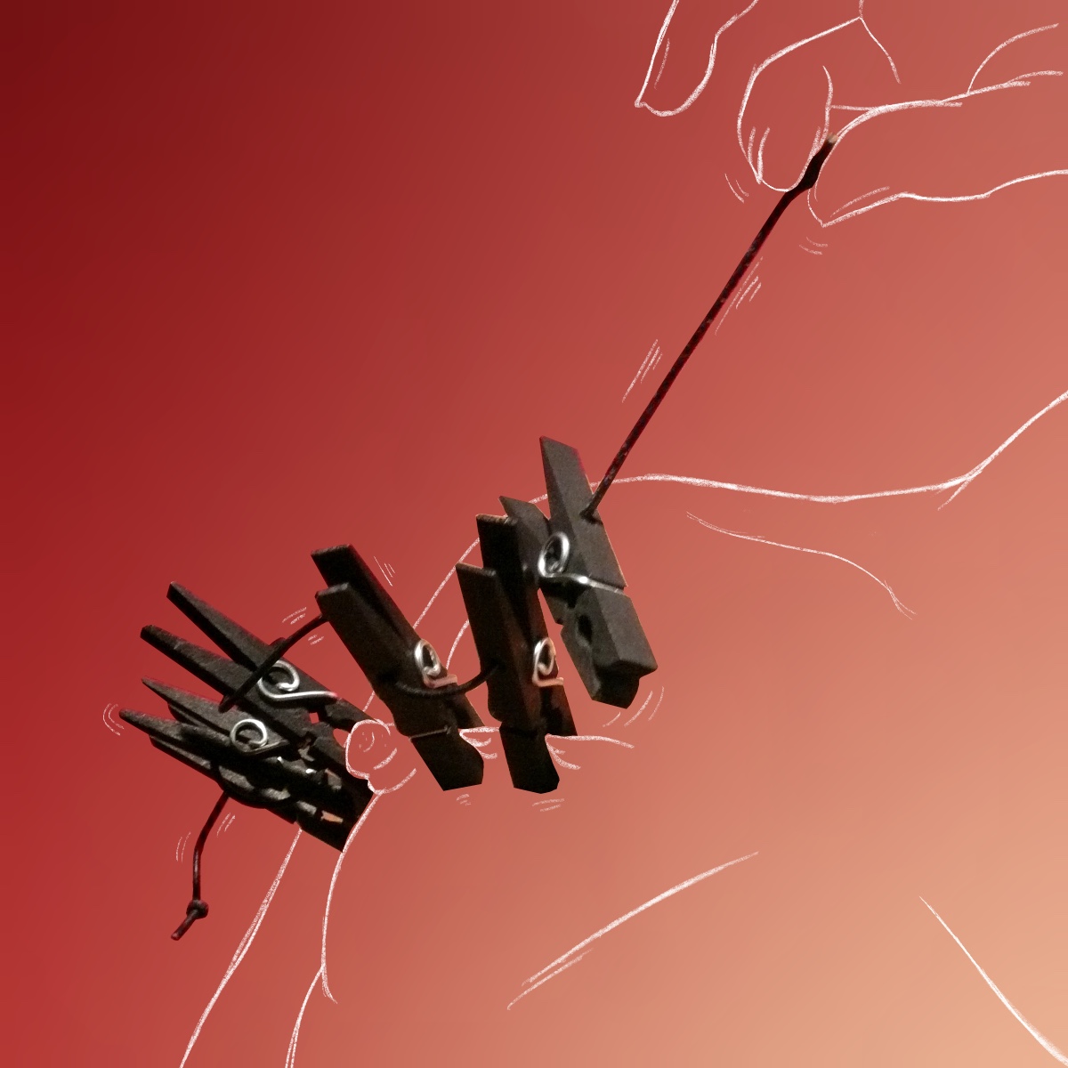 Zwölf rote Holzklammern mit einer speziellen Feder, die ein Verdrehen verhindert. Um diese lange Reihe zu setzen, braucht es genügend elastisches Gewebe. Die Menge der Klammern wird für das Opfer bereits zur Herausforderung. Werden dann aber alle zwölf Klammern mit einem Ruck abgezogen, entpuppen sie sich als beissendes Ungeheuer!