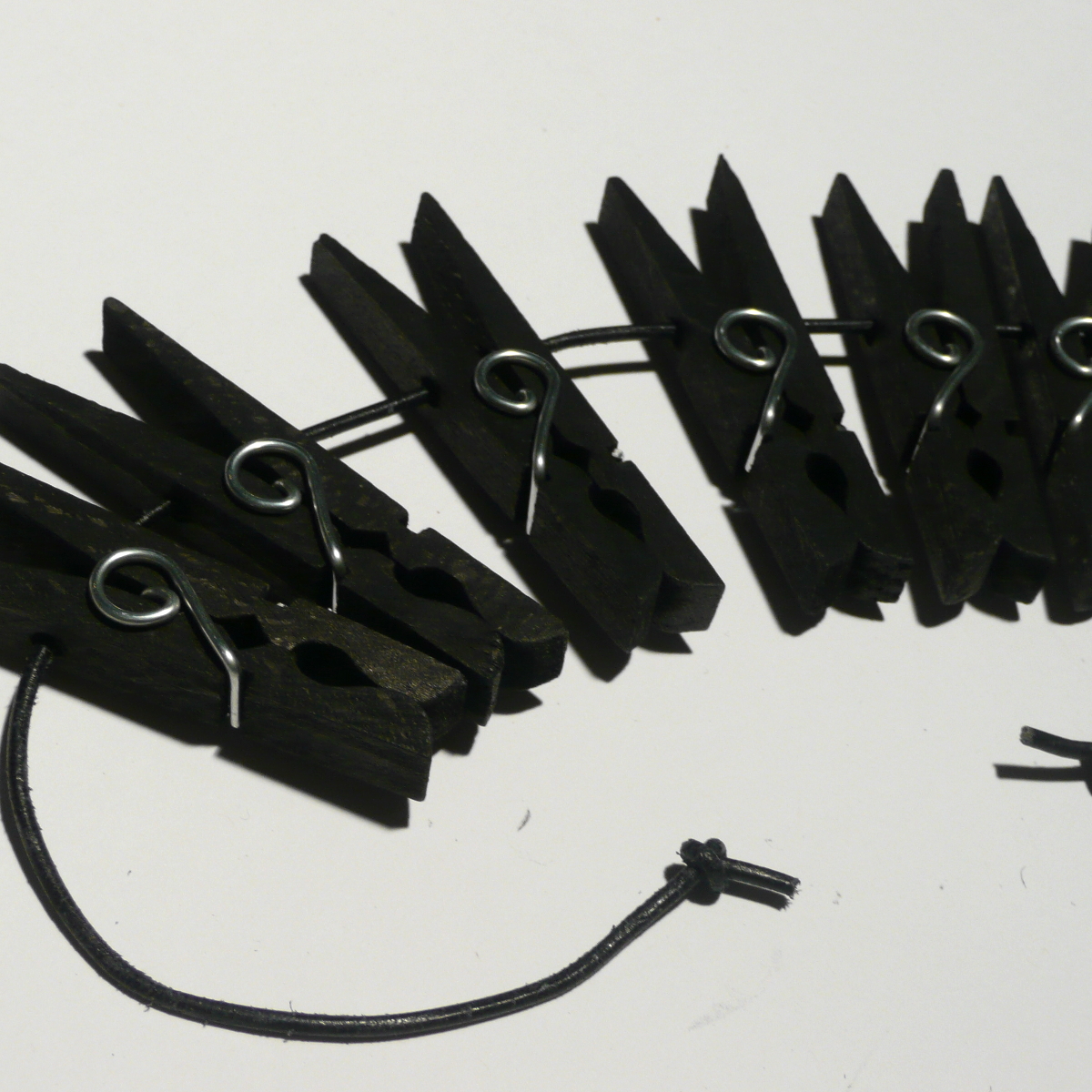 Die Verbindung der Klammern mit einer Lederschnur macht dieses Set zum gemeinen Spielzeug: Werden die Klammern in einer Reihe gesetzt, lassen sie sich mit einem kräftigen Zug an der Verbindungsschnur ruckartig abziehen. Da sagt niemand mehr, dass Wäscheklammern harmlos sind!