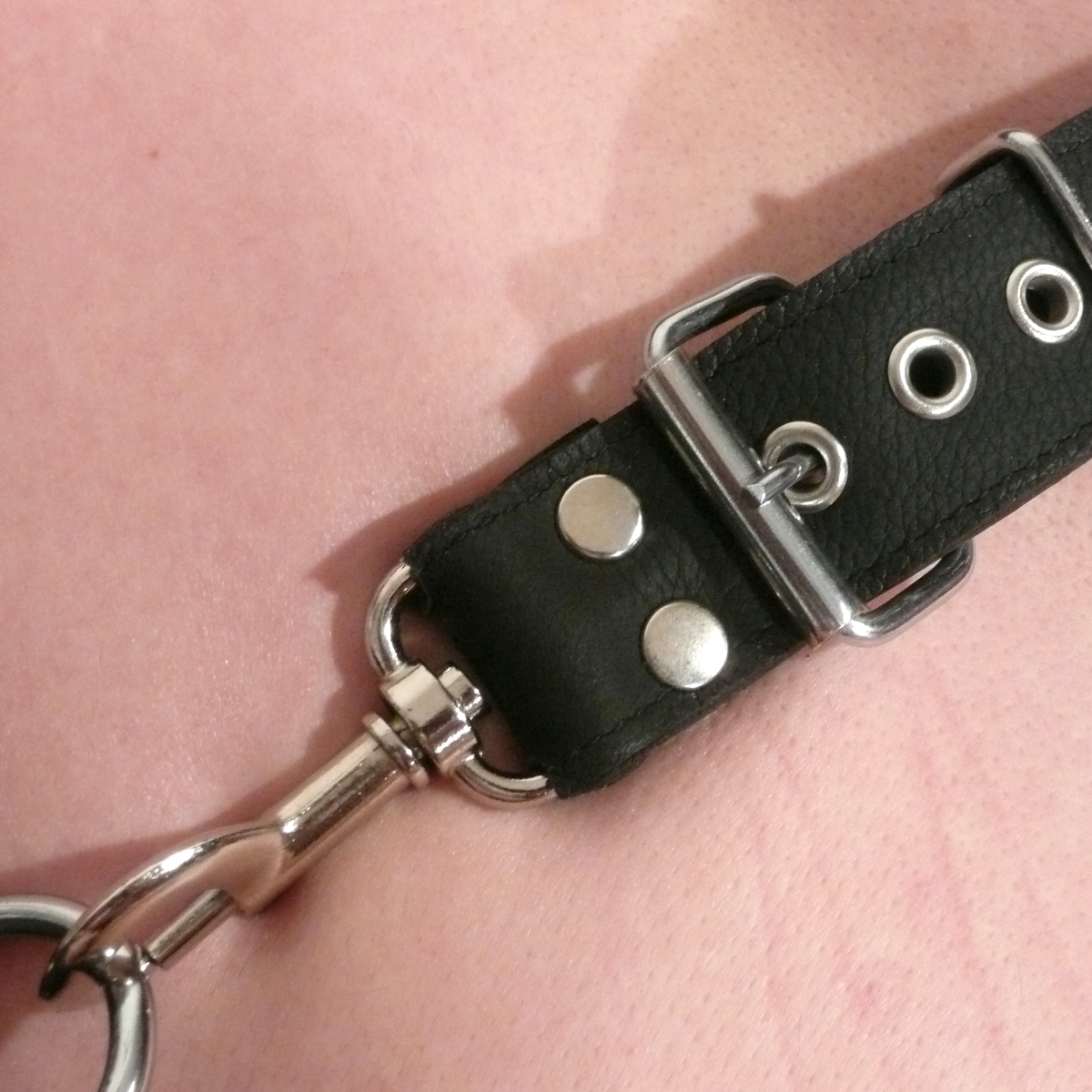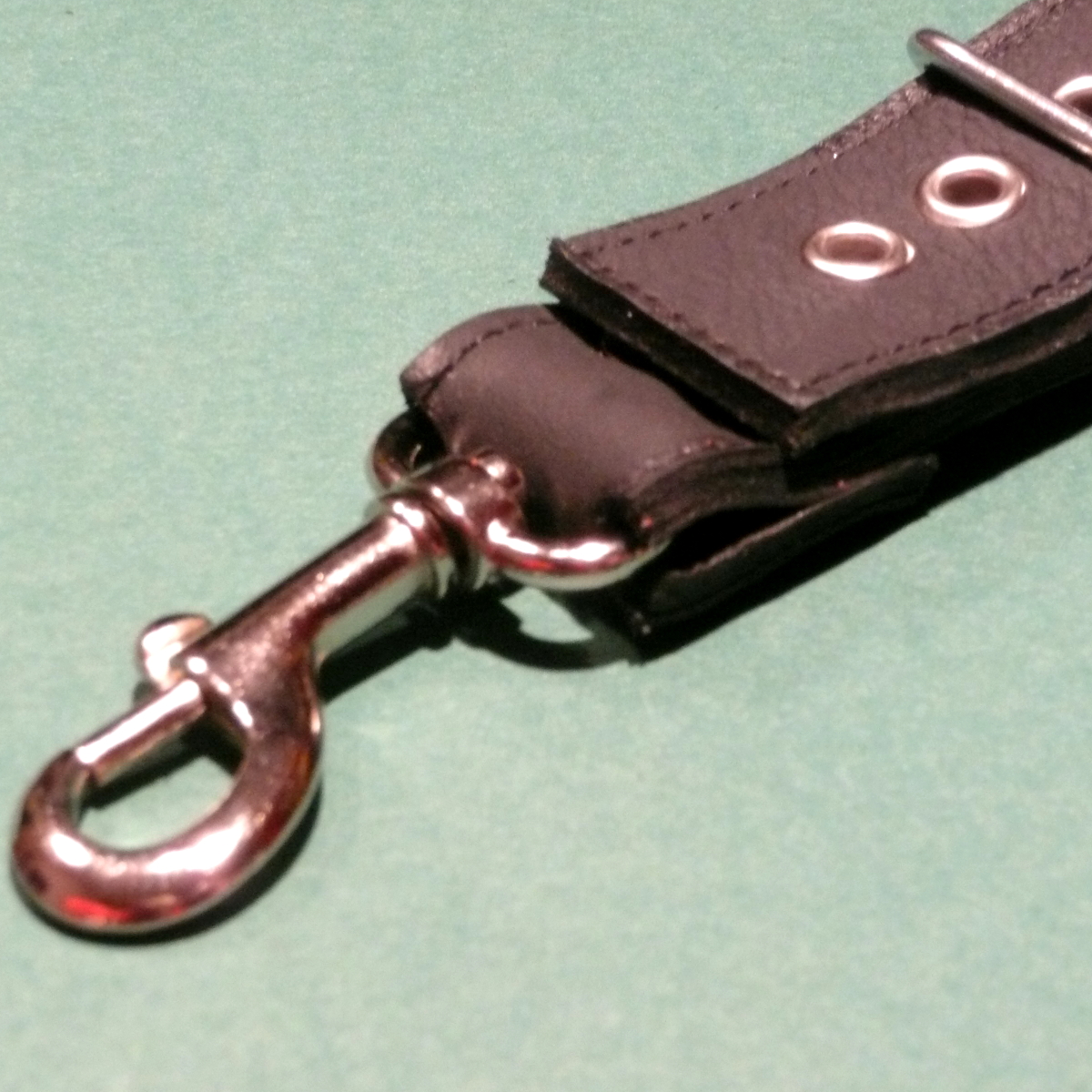 Stufenlos-Spanner, kurz (mit Triangel-Schraubösen) Der Stufenlos-Spanner ist die superpraktische Lösung, wenn Sie eine Fesselung während des Spiels allmählich immer unbequemer machen wollen! Dabei handelt es sich um einen Spanngurt, der zwischen zwei Objekten wie z.B. Fesselmanschette und Bettstrebe eingehakt wird und dann ganz nach Bedarf stufenlos enger gezogen werden kann, ohne irgendeine Schnalle öffnen zu müssen oder einen Mechanismus zu betätigen. Einfach den Gurt mit den Schraubösen zwischen zwei Objekten einhängen und an dem offenen Ende ziehen, schon wird er immer kürzer! Die Triangel-Schraubösen können bei Bedarf auch mit einem passenden Schraubenschlüssel gesichert werden und lassen sich dann nicht mehr von unnützen Fingern auffummeln! Das Prinzip ist einfach: Die kurze Hälfte des Gurtes endet in einem doppelten D-Ring. Das andere lange Ende des Gurtes ist offen und wird durch die beiden D-Ringe hindurch geschlungen (s. Darstellung im Foto!) Dabei werden die Ringe so ineinander gedrückt, das sie eine Bewegung des Gurtes nur noch in eine Richtung zulassen, nämlich kürzer. Um den Gurt wieder zu entspannen muß der Zug deutlich zurück genommen werden. Erst dann lassen sich die Ringe soweit lösen, daß der Gurt wieder zurück laufen kann und länger wird. Diese kurze Version des Stufenlos-Spanners ist verstellbar von maximal 40 Zentimeter auf minimal 15 Zentimeter. Lieferumfang: 1 kurzer Stufenlos-Spanner mit Triangel-Schraubösen (ohne im Bild gezeigte Manschetten, ohne Verschluß- und Verbindungselemente, diese bitte separat bestellen!)