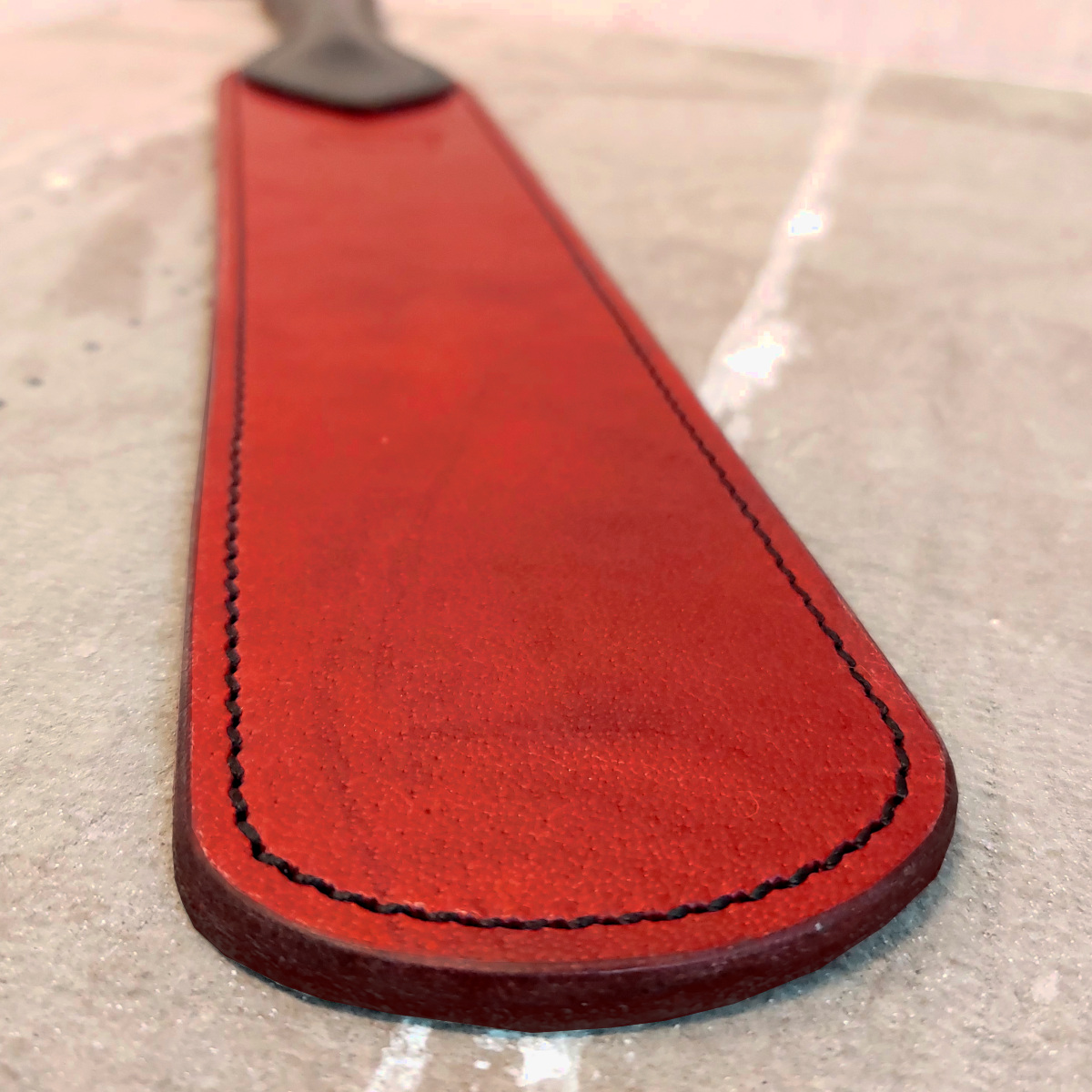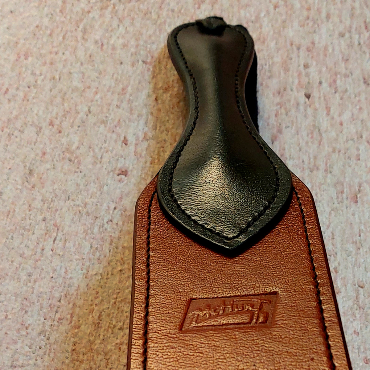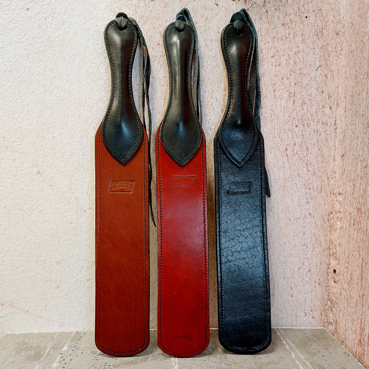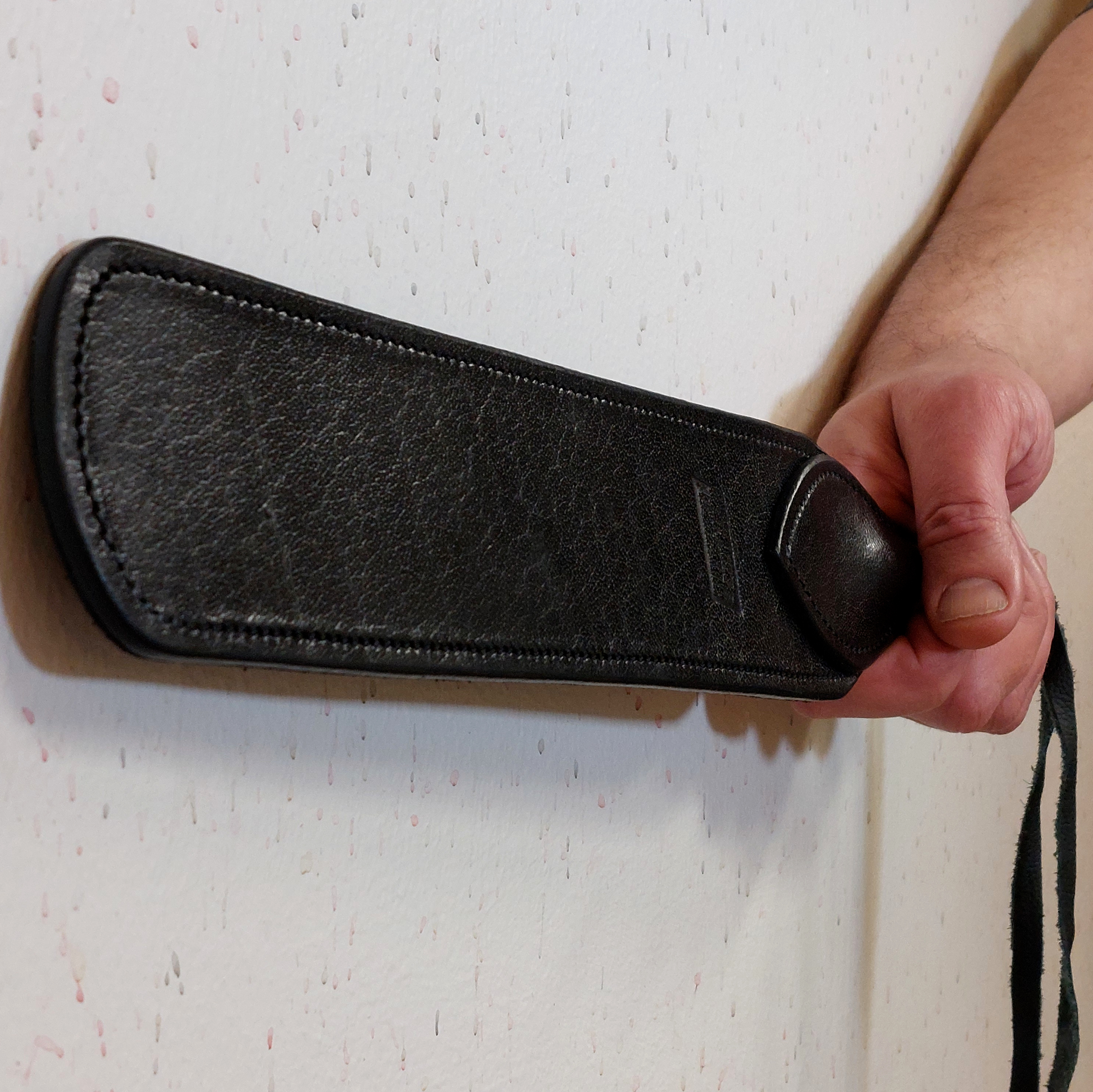 Er wird aus dickem, sehr steifen Leder hergestellt. Dadurch ist die Wirkung sehr gut dosierbar von spielerisch klatschend bis streng und strafend.