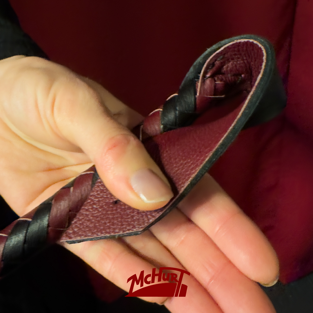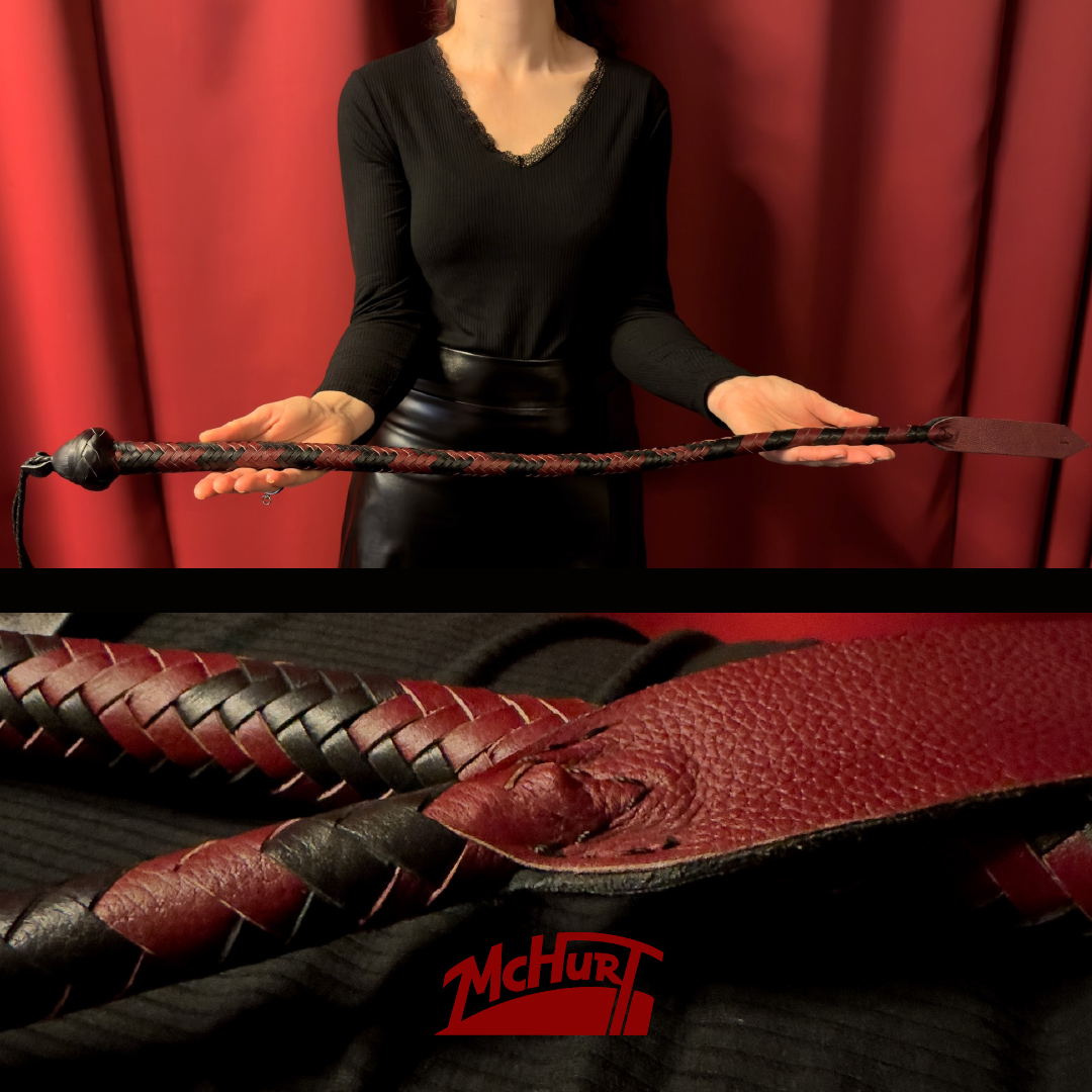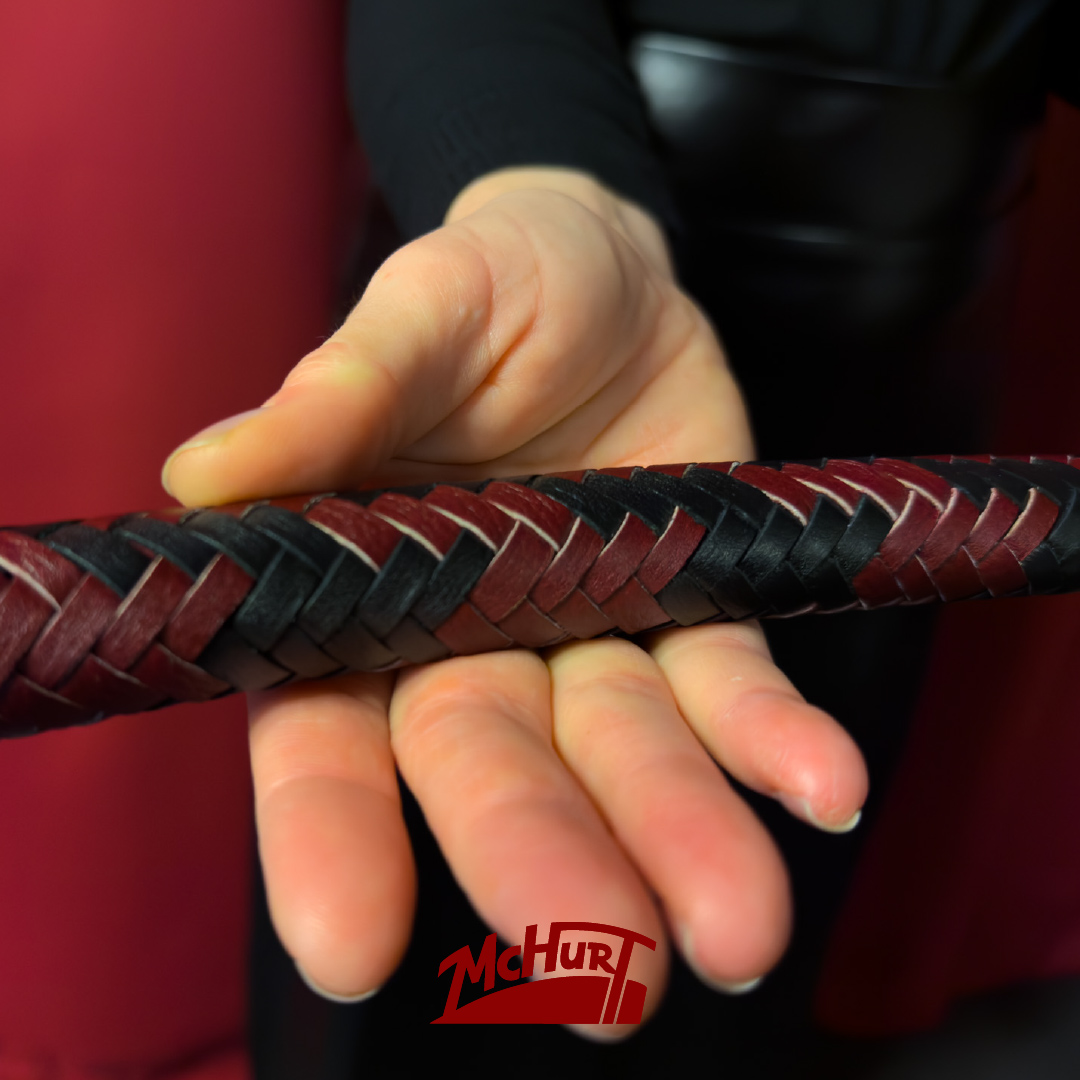 Diese Kantschu wird aus zwei verschieden farbigen Schichten soften Rindsleder vom Ende her geflochten. Somit gibt es keinen Absatz zwischen dem geflochtenen Teil und der Klatsche, sondern einen nahtlosen Übergang.