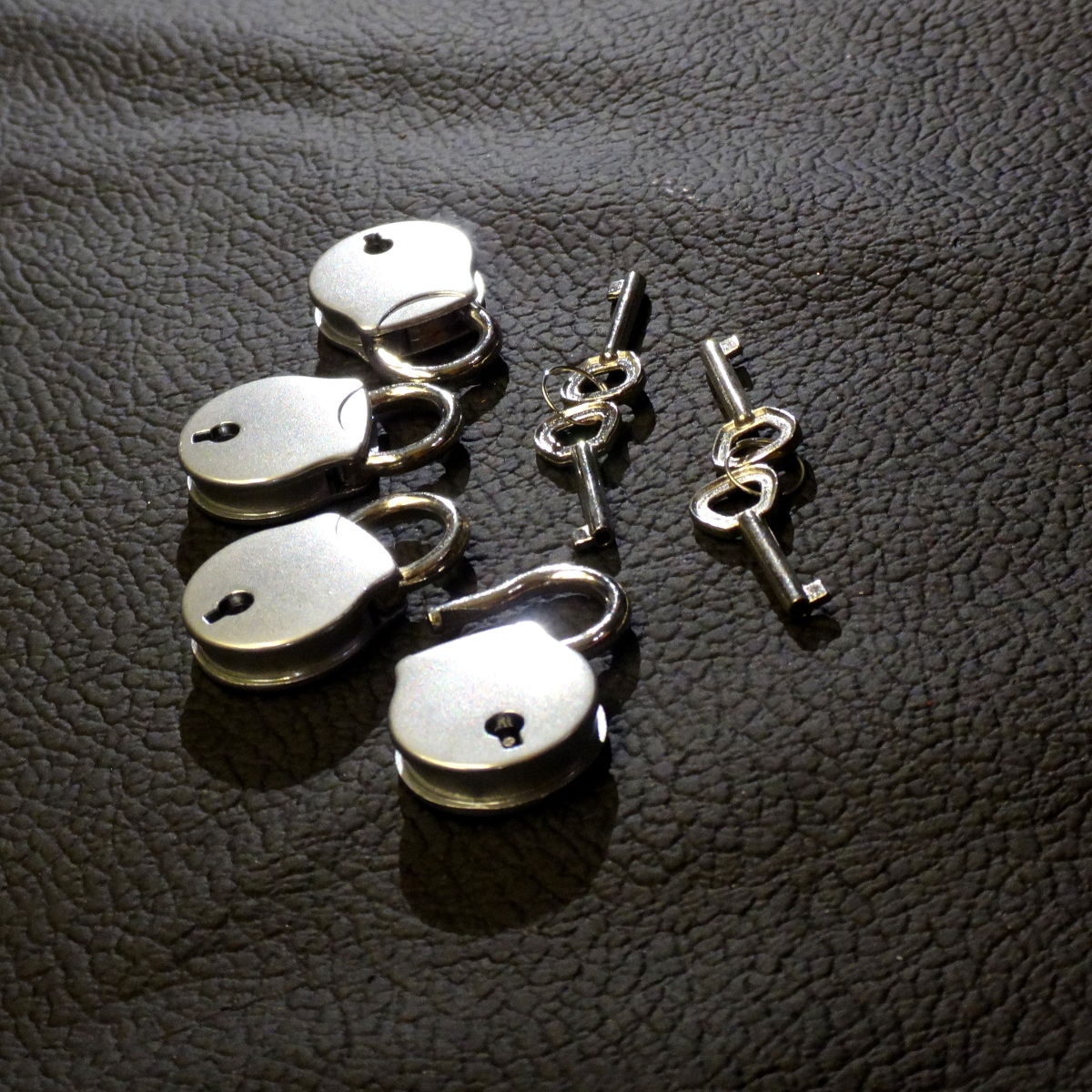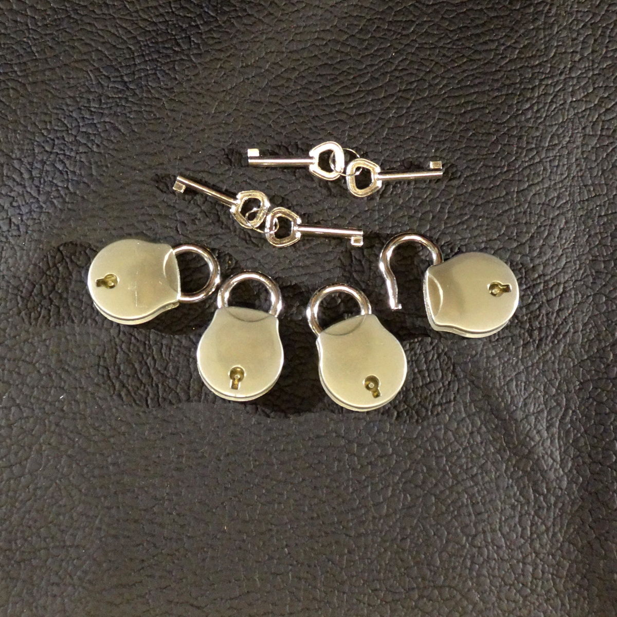 Mit diesem 4er-Set unseres kleinen Vorhängeschlosses können Sie beispielsweise zwei Hand- und zwei Fußfesseln gleichzeitig sichern oder unseren Knebelharness ausbruchsicher machen oder . . oder . . . oder . . .