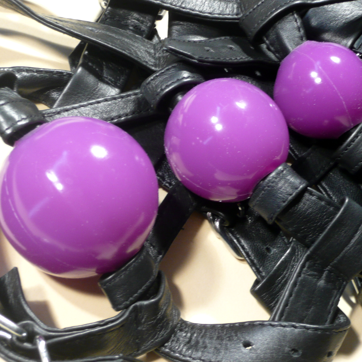 Ballknebel mit lila-farbigem Ball aus Platinum-Silikon auf weichem Lederriemen. Unsere Knebelbälle sind absolut geschmacks- und geruchsneutral und bieten eine sehr angenehme Bissfestigkeit. Sie sind elastisch genug, um die Zähne nicht zu schädigen, aber auch fest genug, um sie nicht mit dem Mund flachdrücken zu können. Die Bälle sind sehr widerstandsfähig. Auch bei kräftigen Bissen hinterlassen Zähne kaum Spuren. Diese Knebel lassen sich sehr bequem und bei Bedarf auch lange tragen und hinterlassen relativ wenig Spuren im Gesicht, da die Riemen aus weichem Bekleidungsleder genäht werden und keinerlei Nieten oder Verbindungsösen außer dem flachen Schnallenverschluß an der Rückseite haben. Erhältlich mit vier verschieden großen Silikon-Bällen: Small: ca. 38 Millimeter (für kleine Plappermäuler und Personen, die leicht einen Würgereiz bekommen) Medium: ca. 45 Millimeter (die mittlere Standard-Grösse) Large: ca. 52 Millimeter (für große Plappermäuler und Geniesser der Ruhe) Extra-Large: ca. 60 Millimeter (für die wenigen, die mit Large-Bällen immer noch keine Ruhe geben) Achtung: 60 Millimeter Durchmesser sind für die meisten Personen anatomisch nicht zu bewältigen!Bitte wählen Sie die Grösse X-Large nur, wenn Sie bereits Erfahrung mit Bällen in der Grösse Large haben! Sonst lautet das Motto nachher: Da war der Appetit wohl grösser als der Mund fassen konnte!