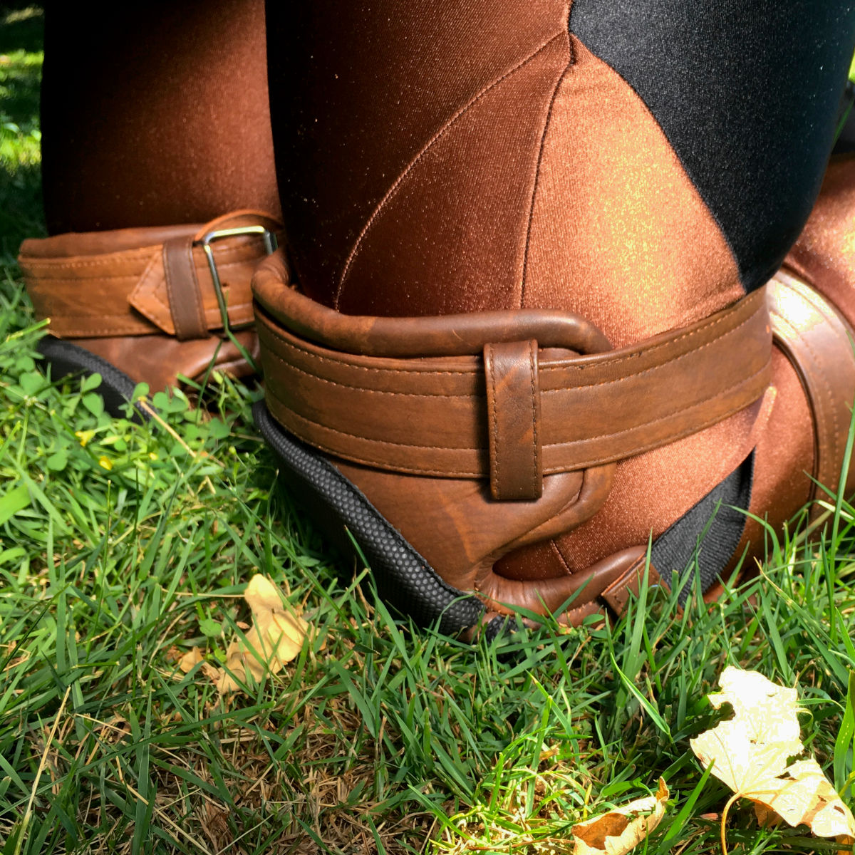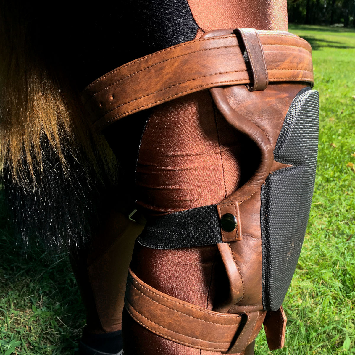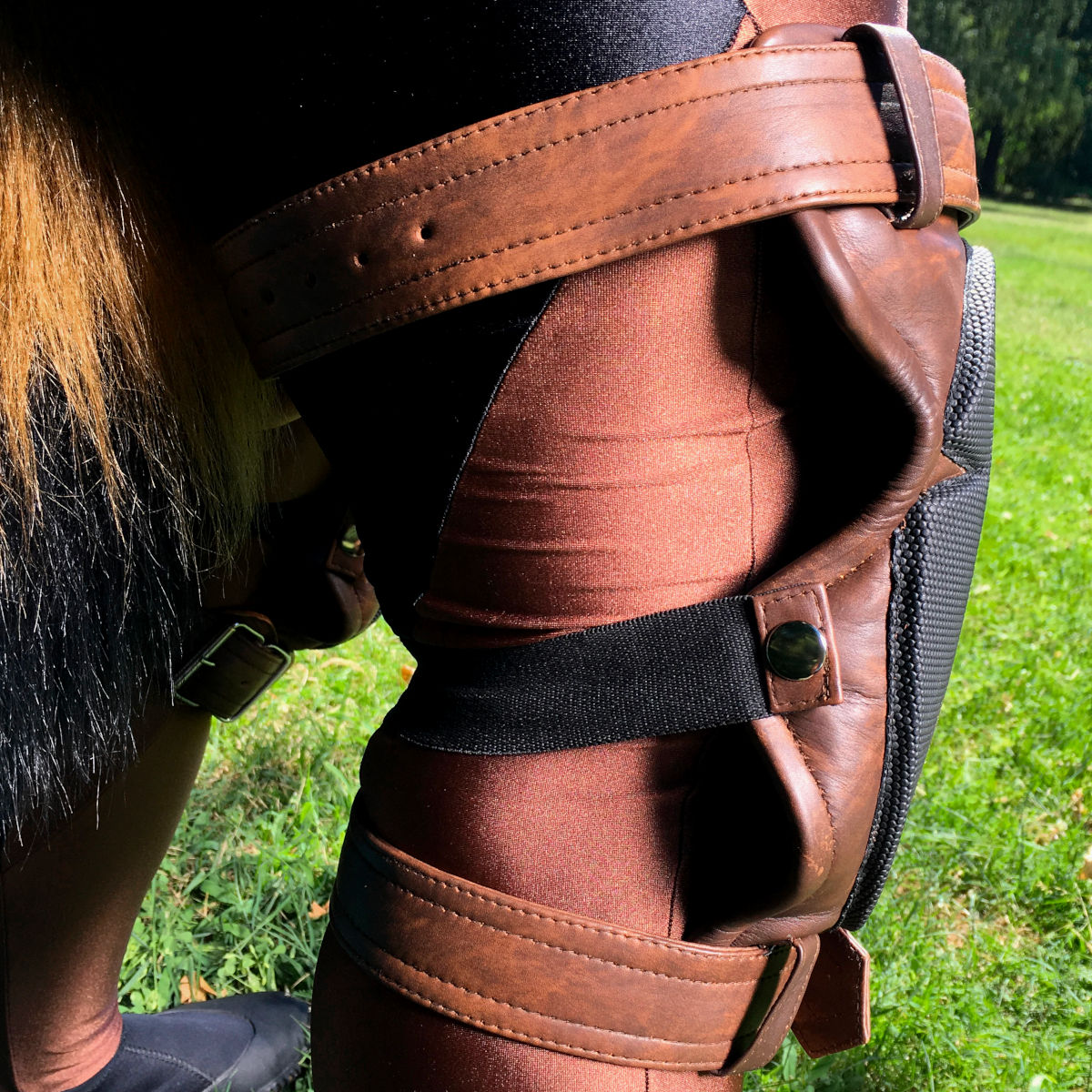Die Knieschoner werden oben und unten von stabilen Lederriemen gehalten und haben auf Höhe der Kniekehle ein elastisches Band für optimalen Tragekomfort. Damit sind sie für längeres Knien ebenso geeignet wie für wildes Herumtollen von Pets auf dem Boden.
