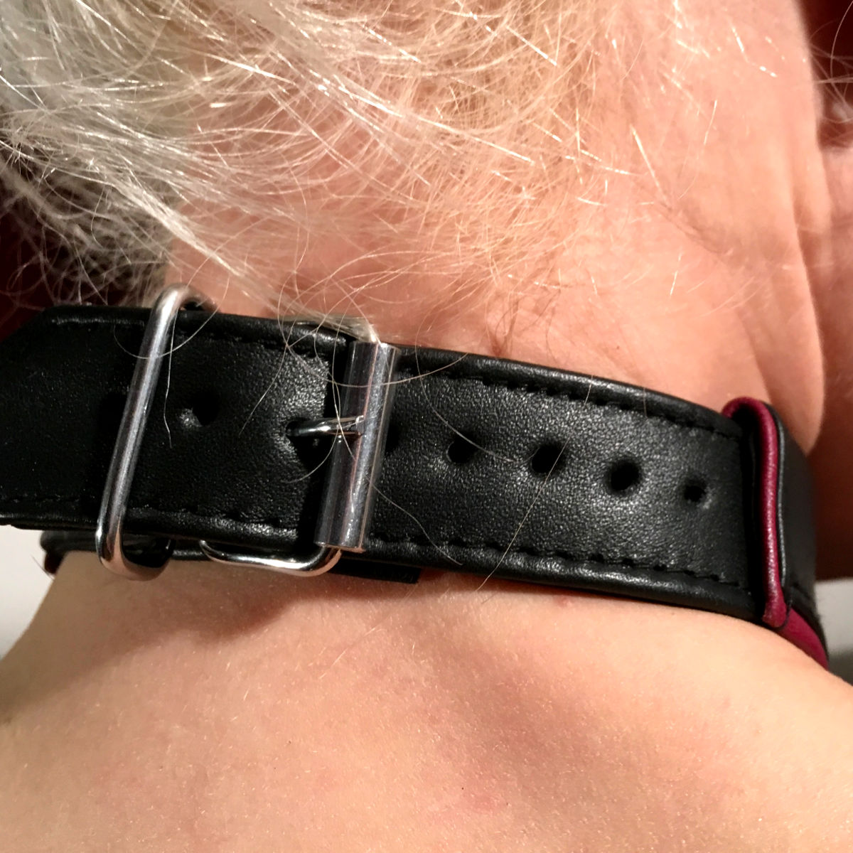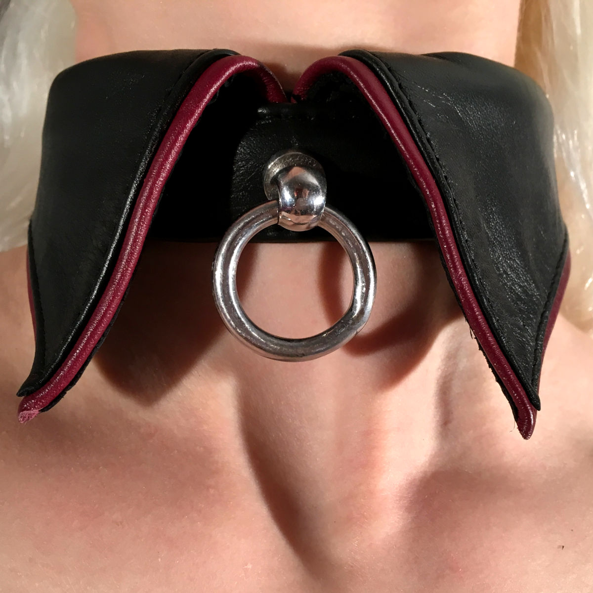 Wir nähen das Kragen-Halsband sehr aufwendig aus weichem Rind-Bekleidungsleder in ganz schwarz, in schwarz/bordeaux, schwarz/lila oder schwarz/weiß.