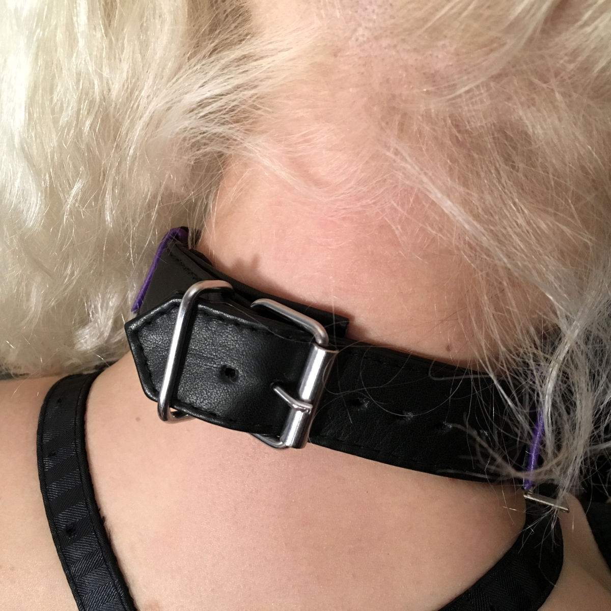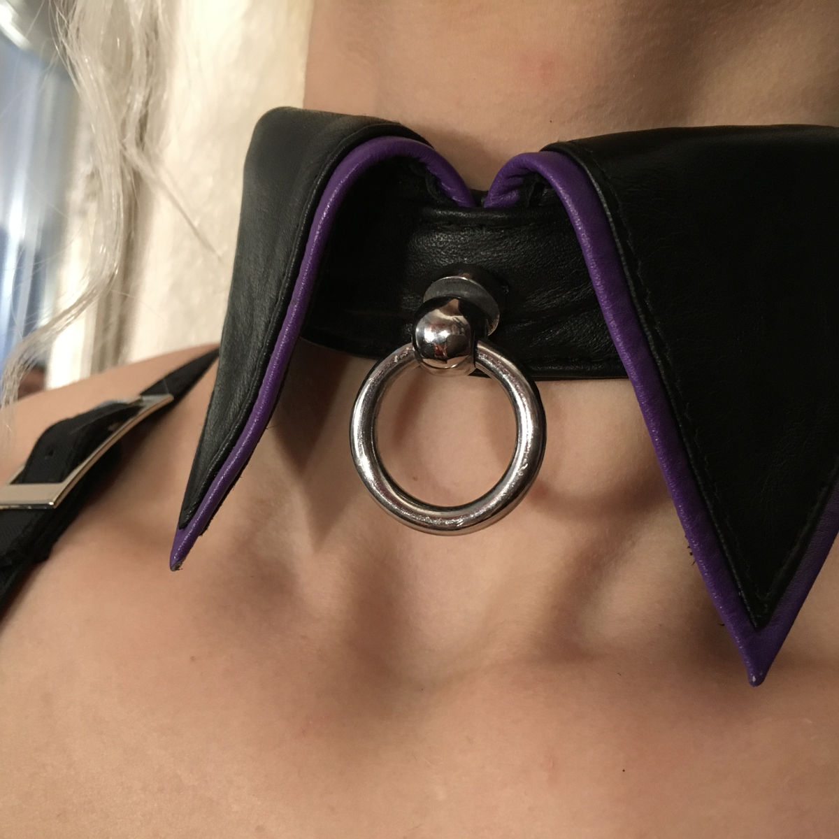 Wir nähen das Kragen-Halsband sehr aufwendig aus weichem Rind-Bekleidungsleder in ganz schwarz, in schwarz/bordeaux, schwarz/lila oder schwarz/weiß.