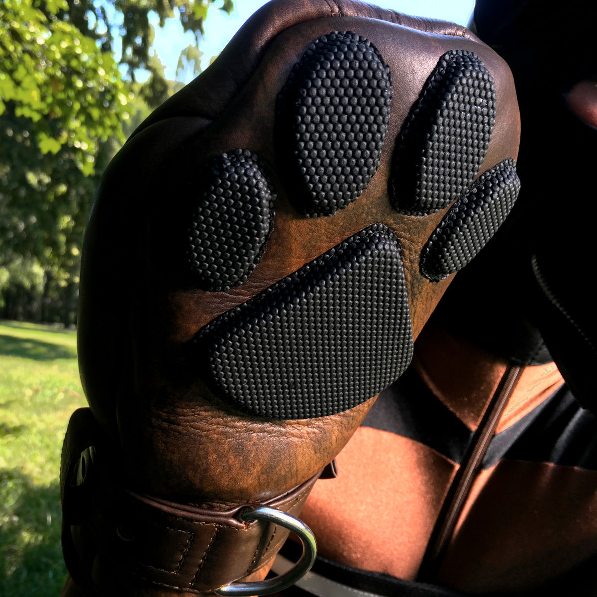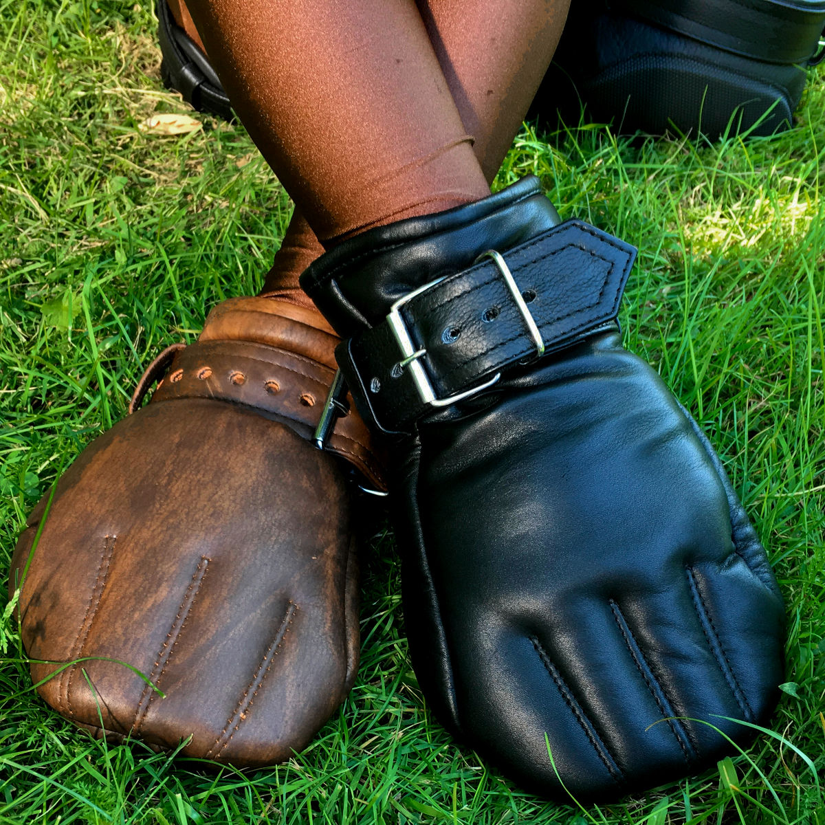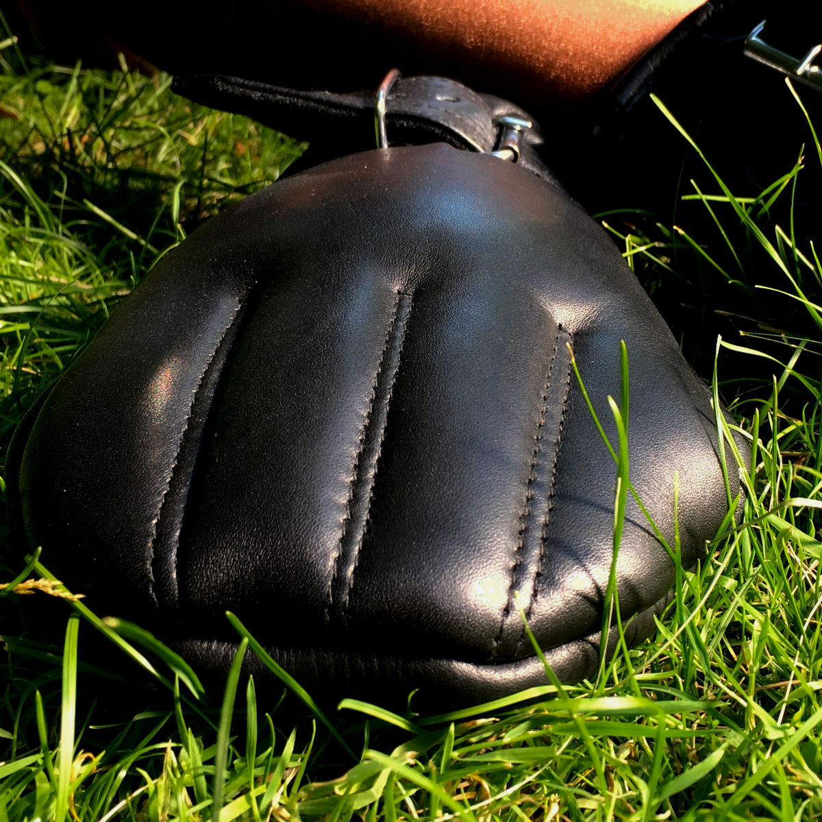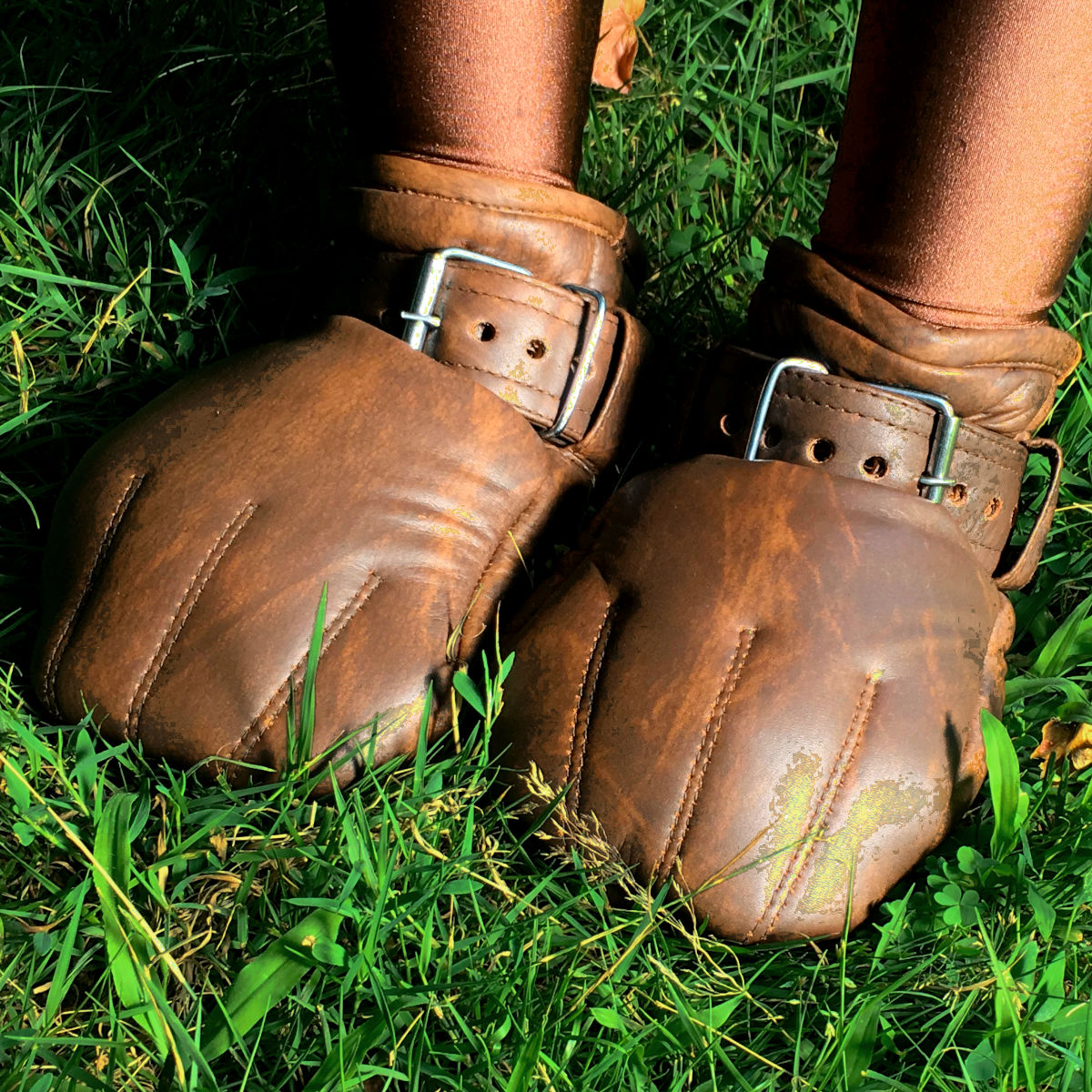 Die Hand schlüpt zunächst gestreckt in den Handschuh, wird nun zur Faust geballt und rutscht dann ganz tief hinein. Wird jetzt der Riemen über dem Handgelenk kräftig zugezogen, ist Entkommen quasi unmöglich.