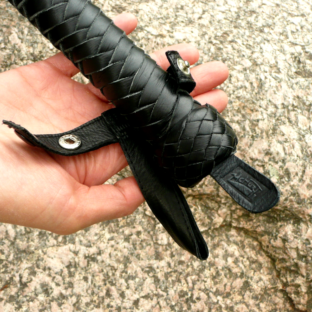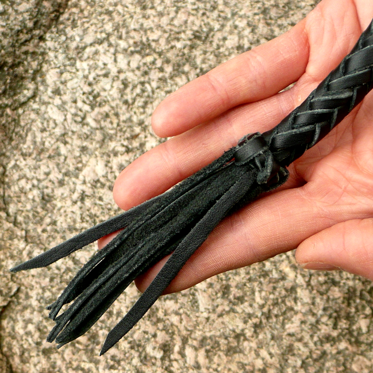 Auf den ersten Blick wirkt die Spitze von Ladina mit seinem kurzen Büschel aus Lederstreifen eher harmlos. Allerdings liegt der Teufel hier im Detail. Wer genauer hinsieht, wird den geflochtenen Knoten am Übergang zu diesem Büschel entdecken. Und der hat es in sich. Seine Wirkung beim Auftreffen ist böse, durchdringend und nachhaltig. Wer diese Peitsche einmal gespürt hat, sieht das büschelige Ende nur noch als Deko.