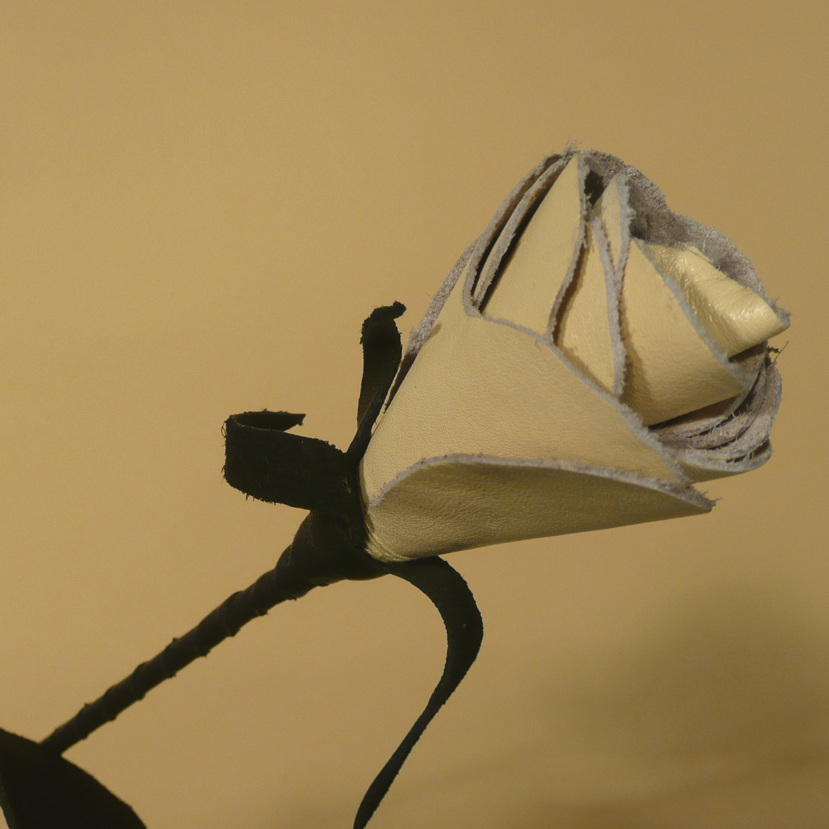 Die Blüte besteht aus sieben cremefarbenen Lederblättern. Der leicht elastische Stiel der Rose ist mit schwarzem Leder umwickelt und mit schwarzen Blättern verziert.