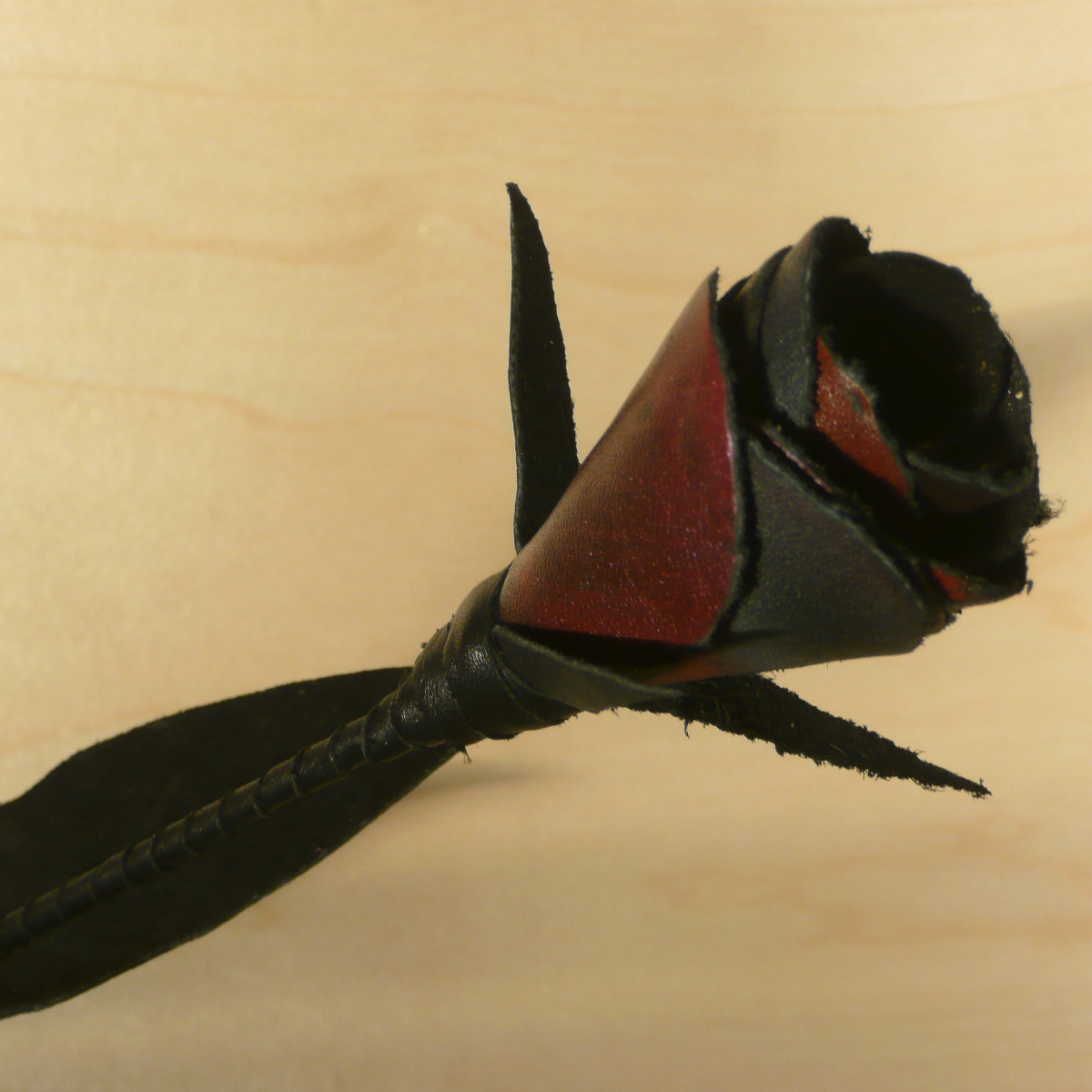 Der leicht elastische Stiel der Rose ist mit schwarzem Leder umwickelt und mit schwarzen Blättern verziert.