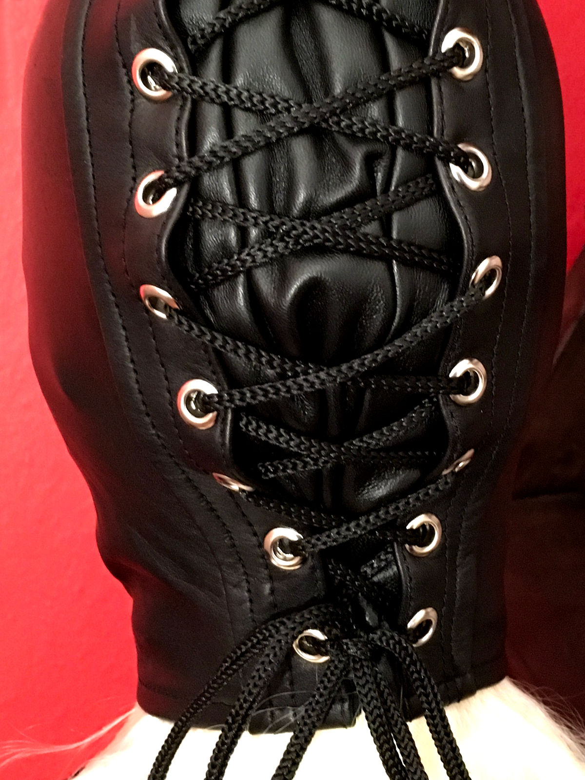 Ist der Kopf in der Maske, so schnüren Sie bitte nicht gleich stramm von oben an, sondern erstmal ohne viel Zug gleichmäßig bis nach unten. Anschließend wird die Schnürung allmählich von oben nach unten enger gezogen, bis die Maske eng genug sitzt.