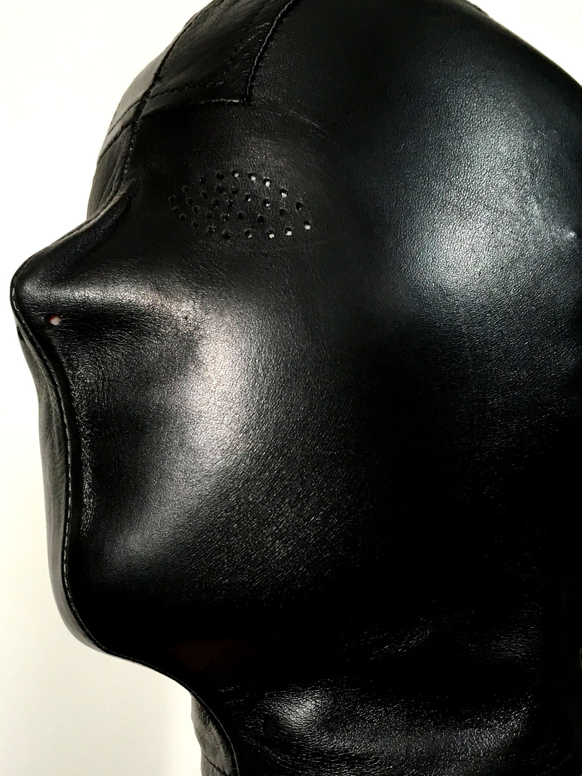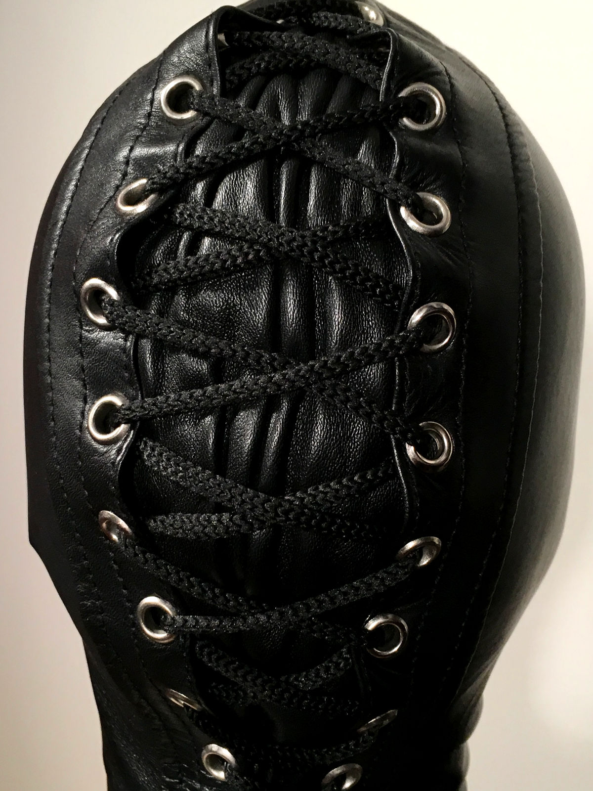 Das Leder schmiegt sich eng um den Kopf und zeichnet die Umrisse darunter deutlich nach. Je enger man die Maske schnürt, desto stärker kommt dieser Effekt zur Geltung!