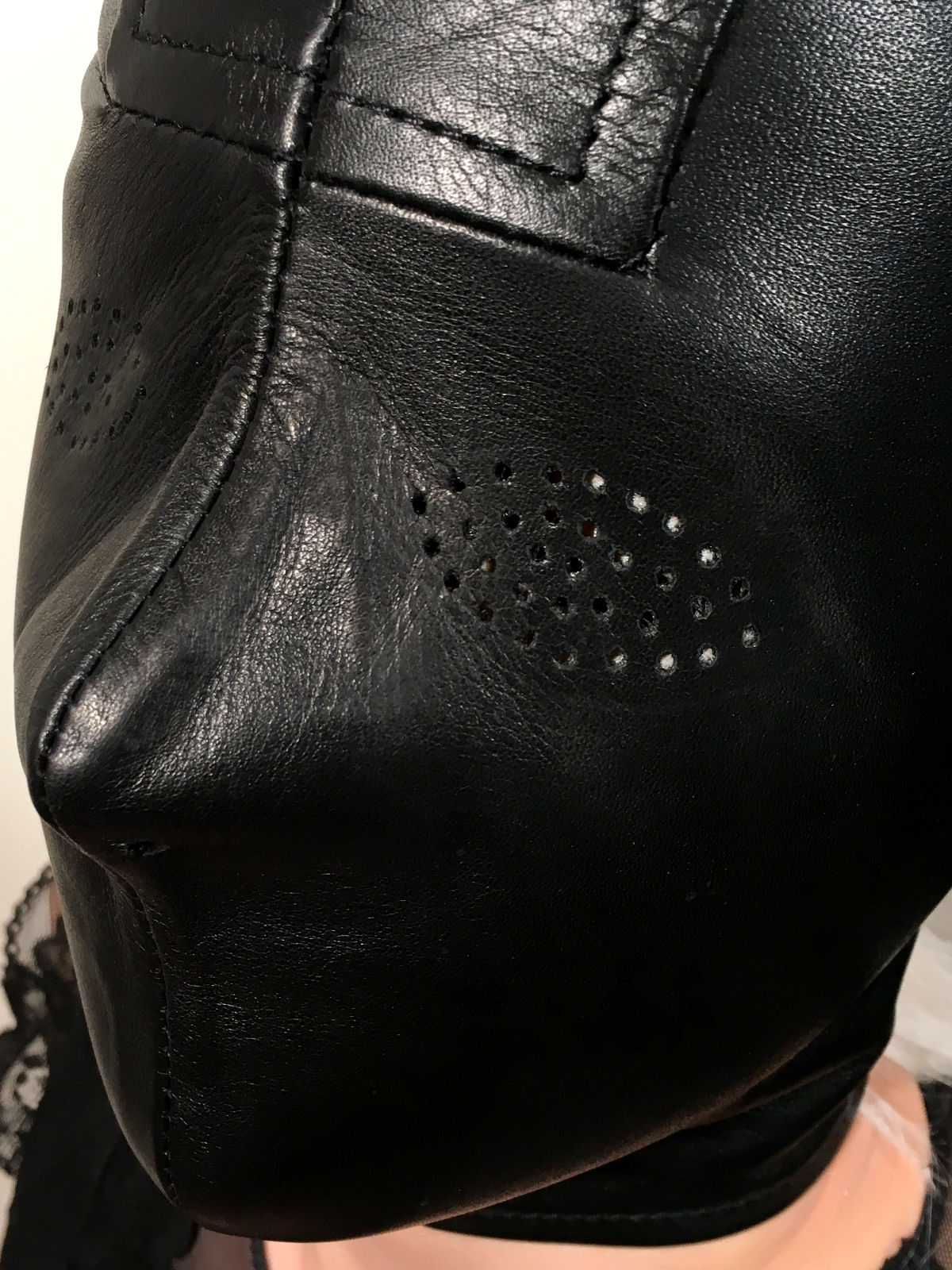 So ist diese Maske schon deutlich restriktiver als die Versionen mit Mundöffnung. Ein vor dem Schnüren der Maske angelegter Ballknebel würde sich zwar nur dezent abzeichnen, die Restriktivität aber massiv erhöhen.