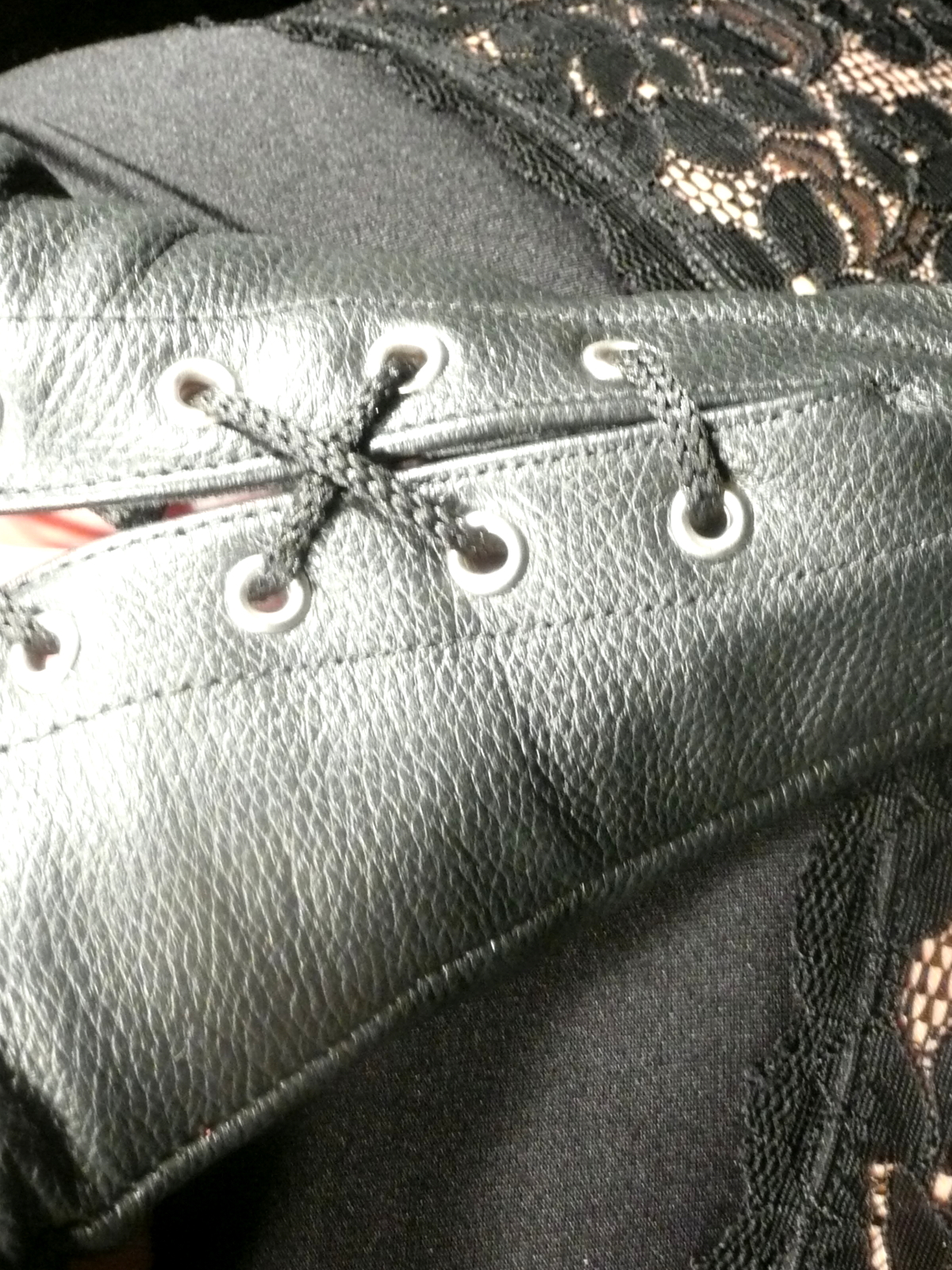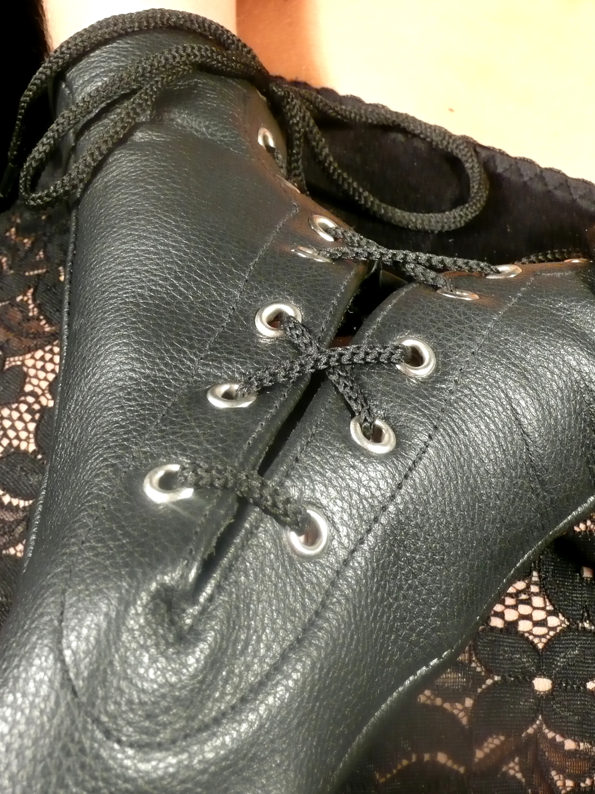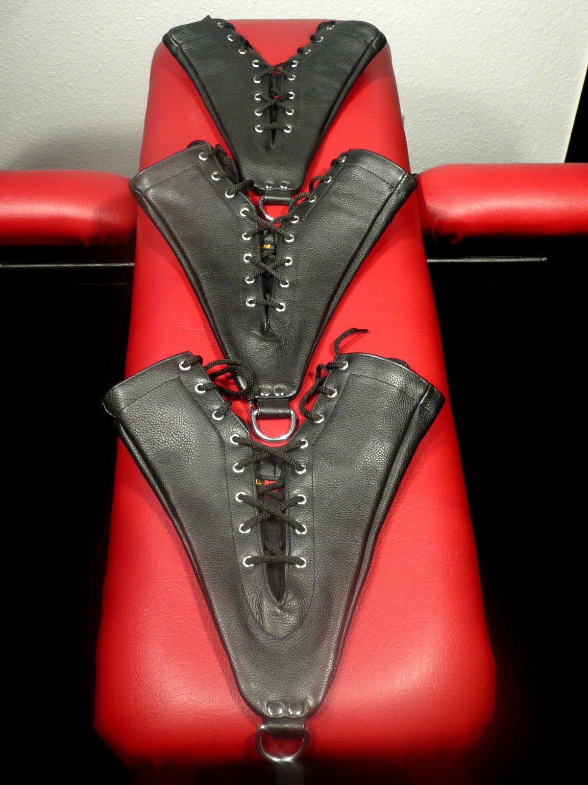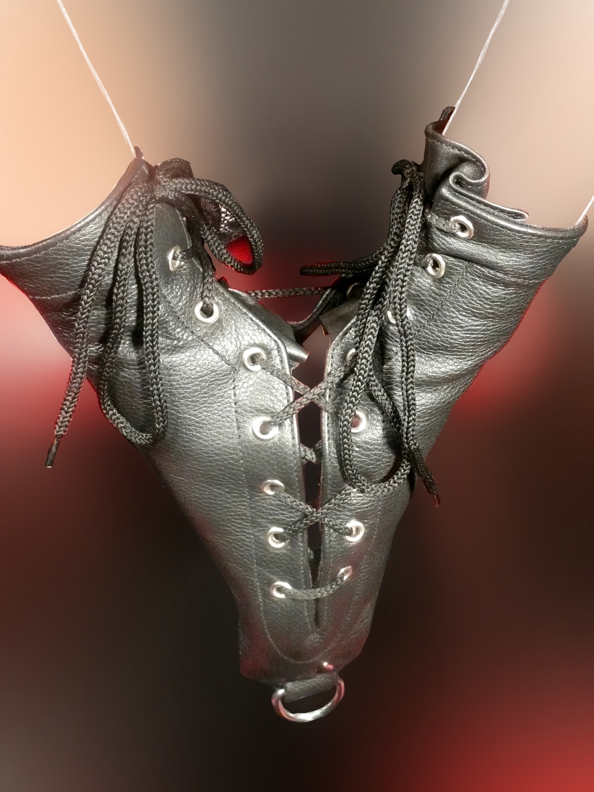Die Hände werden wahlweise vor oder hinter dem Körper durch die kurzen Armstulpen geführt. Mit der Schnürung können die Hände dann eng aneinander gelegt und die Armstulpen um die Handgelenke geschlossen werden.