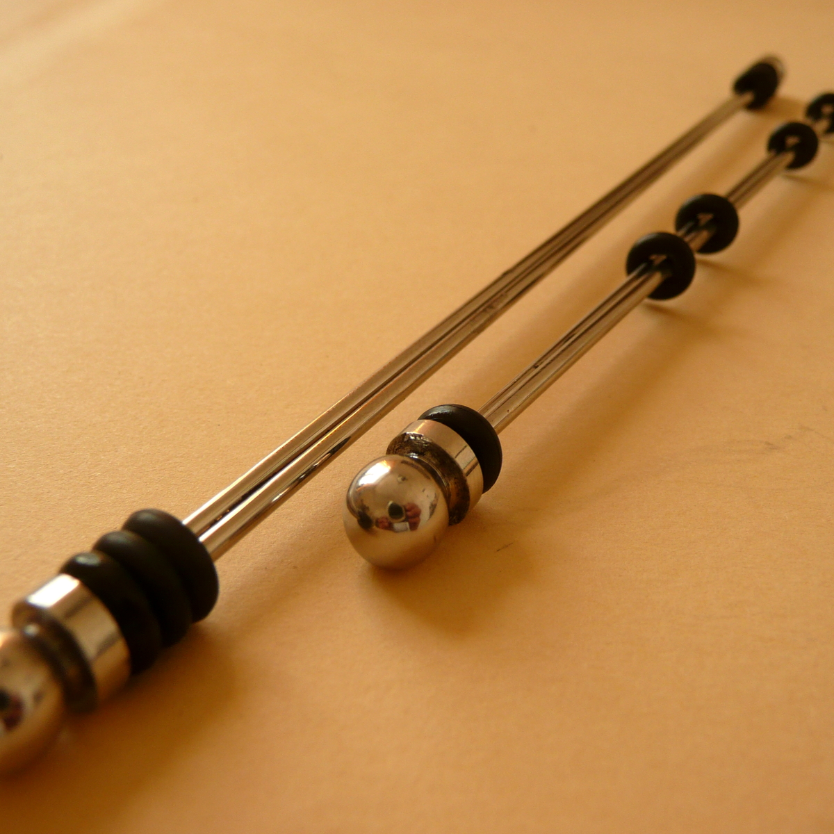 Die Edelstahlkugeln an den Enden sind fest verschweißt, so dass die Sticks immer sicher zusammenhalten. Die Gummiringe sind so gearbeitet, dass sie sich einerseits sehr leicht verschieben lassen, andererseits aber auch nicht von selbst verrutschen.