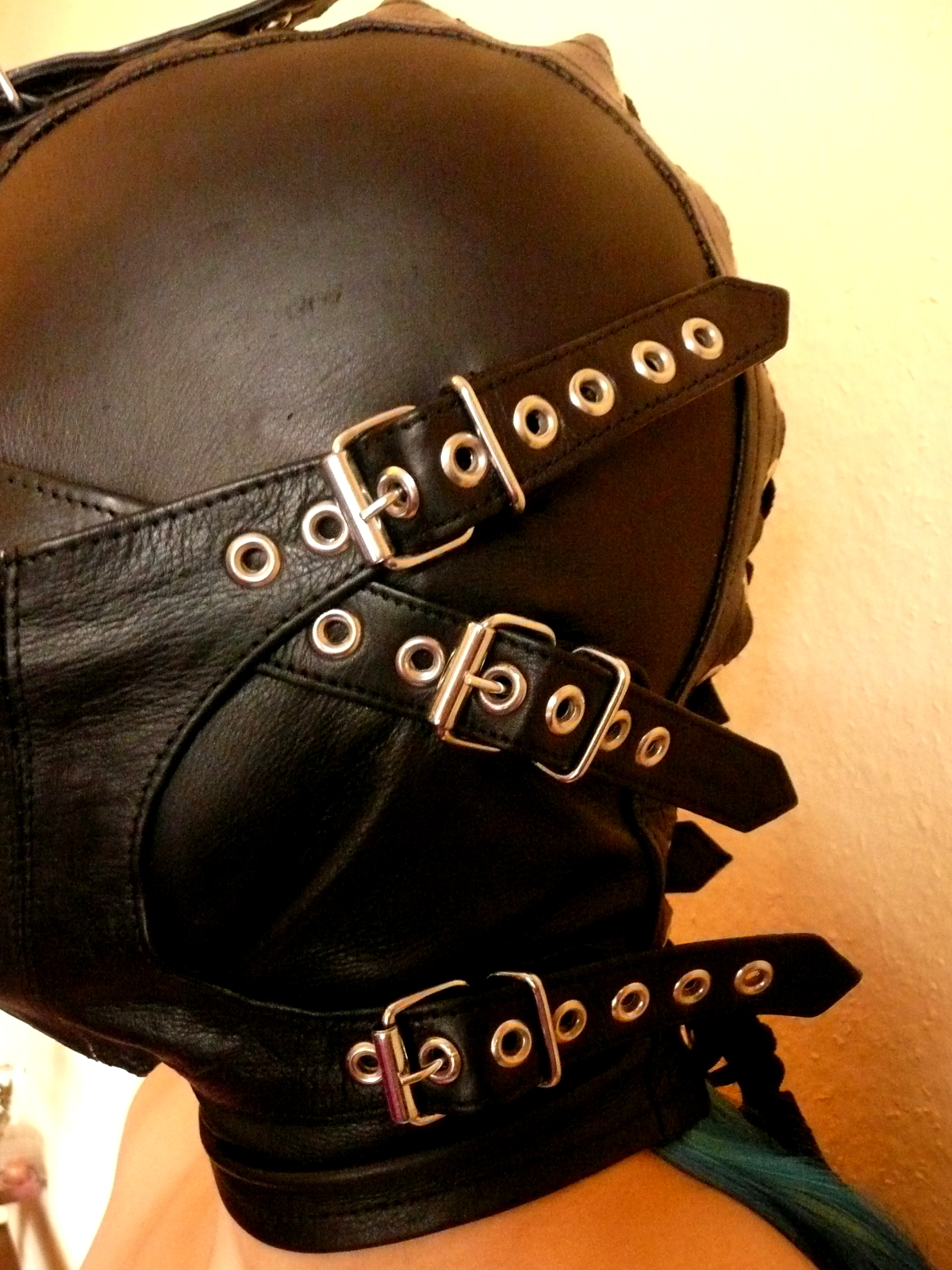 Intuitiv neigt man dazu, die seitlichen Riemen der Augenmaske in die oberen der drei Schnallen an den Seiten der Maske einzuführen. Dies wäre aber falsch. Diese Riemen gehören in die mittleren Schnallen, um der Augenmaske den nötigen Zug nach unten zu verleihen. Die oberen und unteren Schnallen sind für die Riemen der Mundpartie vorgesehen und verleihen auch dieser die benötigte Spannung.