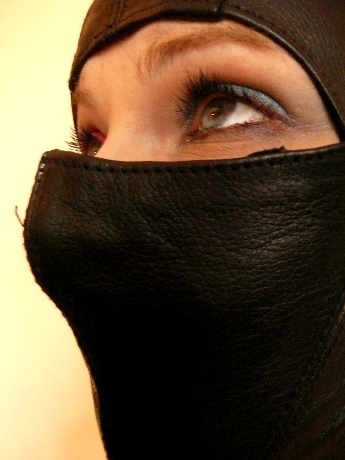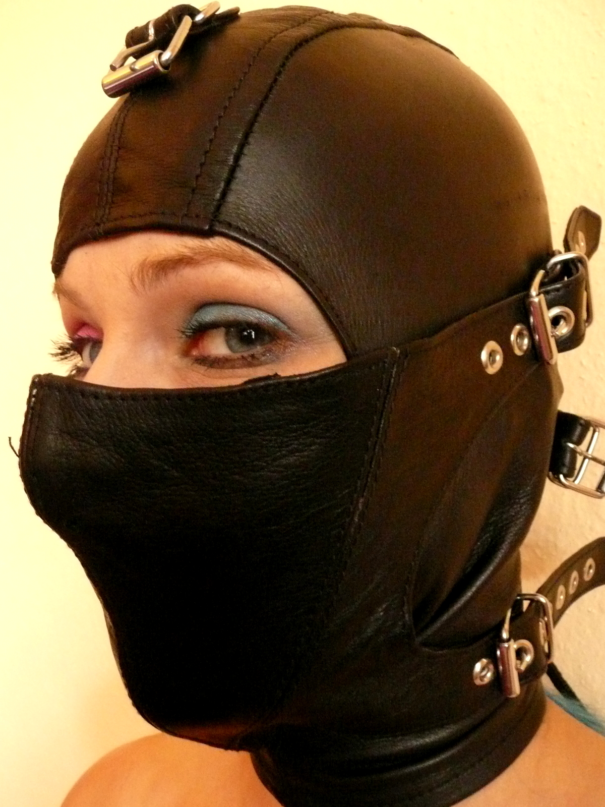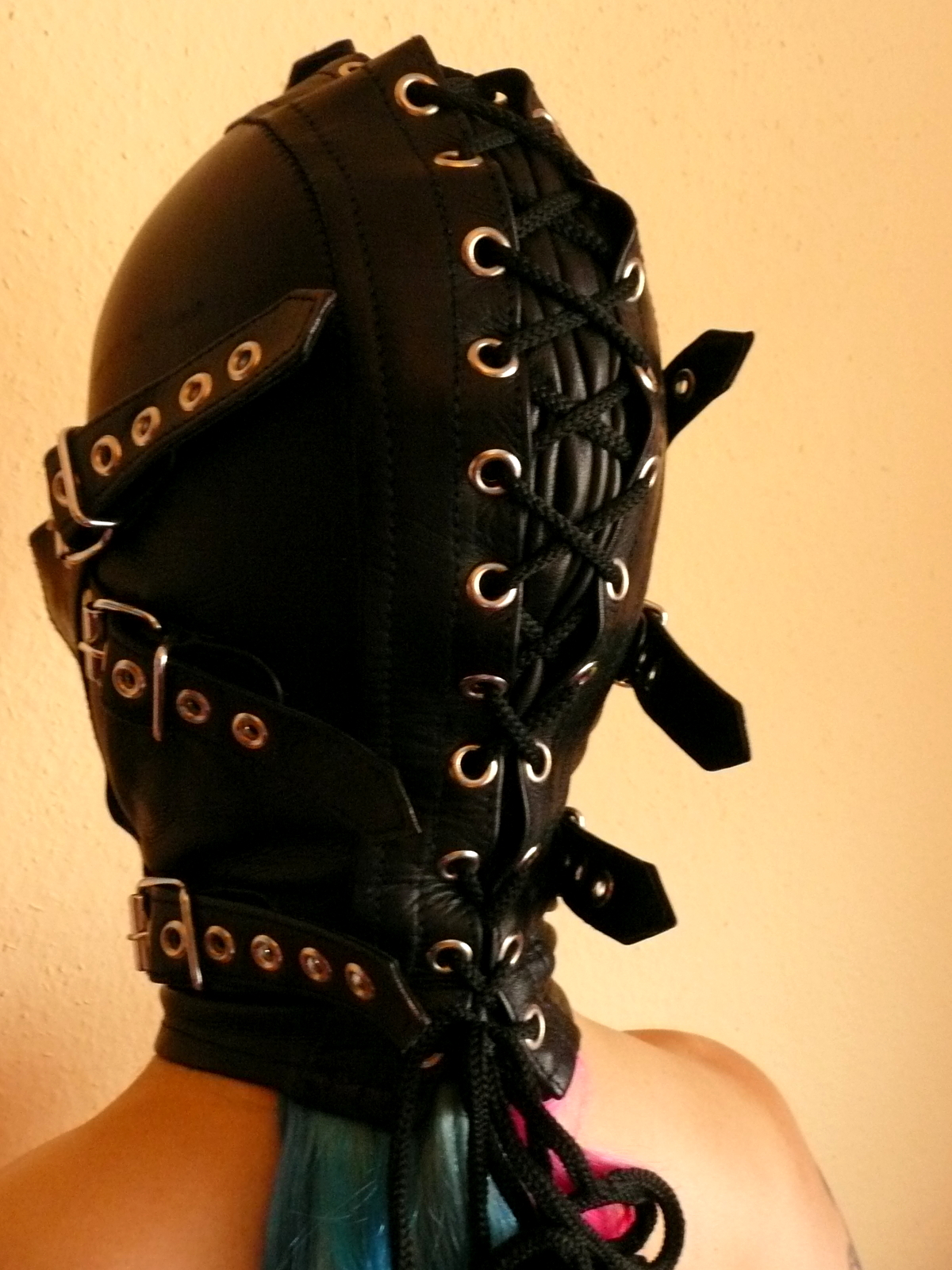 Ist der Kopf in der Maske, so schnüren Sie bitte nicht gleich stramm von oben an, sondern erstmal ohne viel Zug gleichmäßig bis nach unten. Anschließend wird die Schnürung allmählich von oben nach unten enger gezogen, bis die Maske eng genug sitzt.