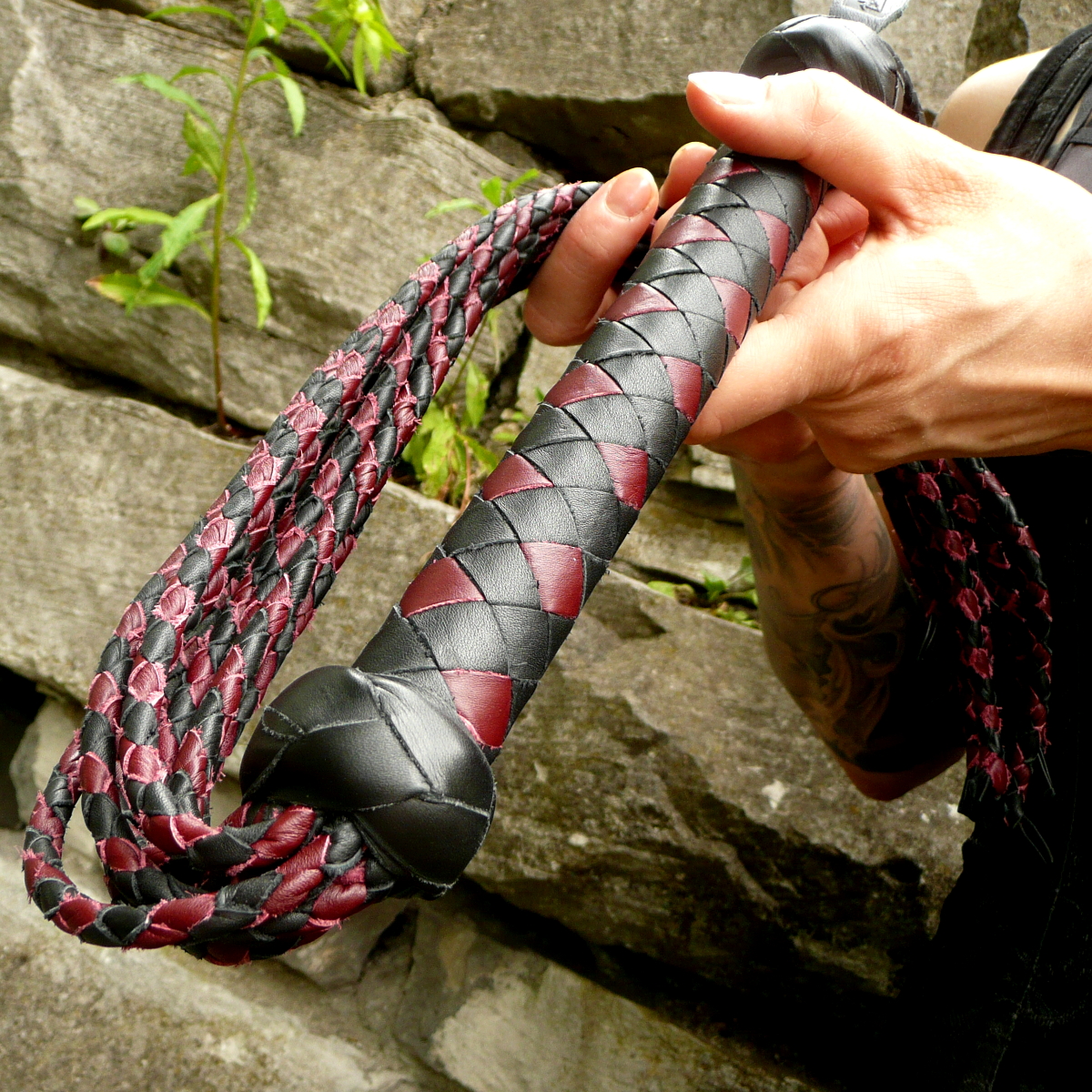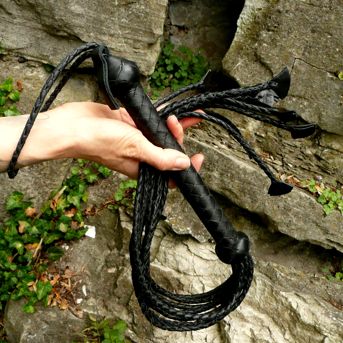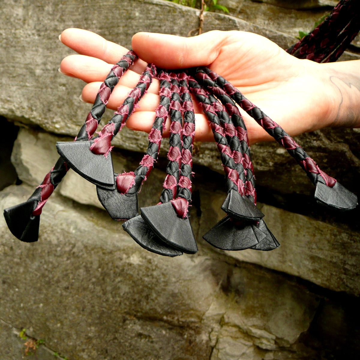 Die neun rund geflochtenen Tails haben am Ende eingeflochtene kleine Lederfliegen, die durchaus heftige Spuren hinterlassen können.