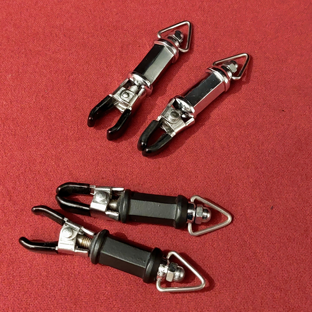 Diese Klammern verteilen den Druck über eine relativ große Fläche und rutschen durch die Kunststoffkappen kaum ab.Entsprechend sind sie mit ihren Haken hervorragende Klammern zum Anbringen von Gewichten oder Verbindungsschnüren oder . . . oder . . . oder . . . MAWA-Klammern führen wir mit zwei unterschiedlich starken Federn. Diese softe Version ist besonders geeignet für den Genitalbereich und für empfindliche weibliche Brustwarzen, die sonst kaum Klammern ertragen können. Länge ca. 7 Zentimeter (inkl. Haken) Lieferumfang: 1 Paar