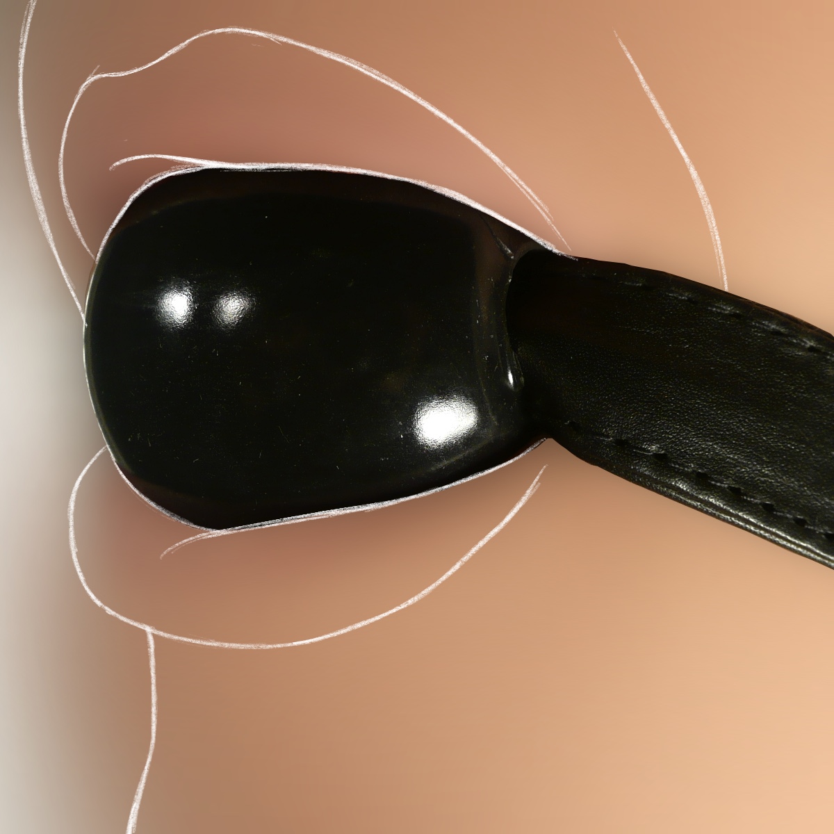 Dieser Muffle-Harness bietet eine doppelte Knebeloption:Zunächst ist die Funktion vergleichbar mit einer Hand, die den Mund fest zu und das Kinn hoch drückt. Zusätzlich können Sie -für die ultimative Stille- einen unserer Silikonbälle montieren, der allerdings nicht im Lieferumfang enthalten ist! Zur Montage des Balls wird der kleine Druckknopf-Riemen mit Hilfe eines Schraubendrehers durch den Ball geschoben. Nun stecken Sie erst das eine Ende des Riemens durch die Öffnung der Knebelplatte und sichern den Druckknopf, dann schieben sie das zweite Ende ebenfalls durch die Öffnung und sichern es auf dem zweiten Knopf.Möchten Sie die Maske ohne Ballknebel verwenden, so können Sie die kleine Mundöffnung mit der mitgelieferten Blende verschließen. Wie jeder andere Knebel-Harness auch, wird dieser Harness mit zunächst auf das weiteste Loch geöffneten Riemen um den Kopf gelegt und der Knebelball hinter die Zähne geschoben.Zuerst ziehen sie den Nackenriemen deutlich fest an, womit sich die Lederplatte (vorne) stramm über den Mund legt. Nun werden die beiden seitlichen Riemen gleichmäßig angezogen, so dass sich eine deutliche Spannung unter dem Kinn entwickelt. Zum Schluss kommt der Stirnriemen am Hinterkopf an die Reihe, der dem Harness nun die ultimative Spannung gibt.Wenn alles schön fest sitzt, sollten sie jetzt keine Wiederworte mehr erhalten, sondern nur noch die üblichen und nie verhinderbaren „Mmh, Mmh, Mmh“ - Laute aus dem Kehlkopfbereich hören.Fall sie doch noch mehr als das hören, ziehen sie einfach die Riemen nochmal nach. Der Harness kann das ab und die tragende Person wird es ihnen danken, sofern sie eine entsprechende Affinität zum Knebeln hat. Der Muffle-Harness ist erhältlich in zwei Größen: Small (Kopfumfang Mund bis 54 Zentimeter) Large (Kopfumfang Mund ab 52 Zentimeter) Lieferumfang: 1 Muffel-Harness mit kleinem Lederriemen zur Montage eines Silikonballs und anköpfbarer BlendeEin Knebelball ist im Lieferumfang nicht enthalten! Diesen bitte separat bestellen. Den Muffle-Harness ohne Option zur Montage eines Silikonballs (Art.-Nr. MGL181) finden Sie im Bereich McSilence - Latex-und Lederknebel.