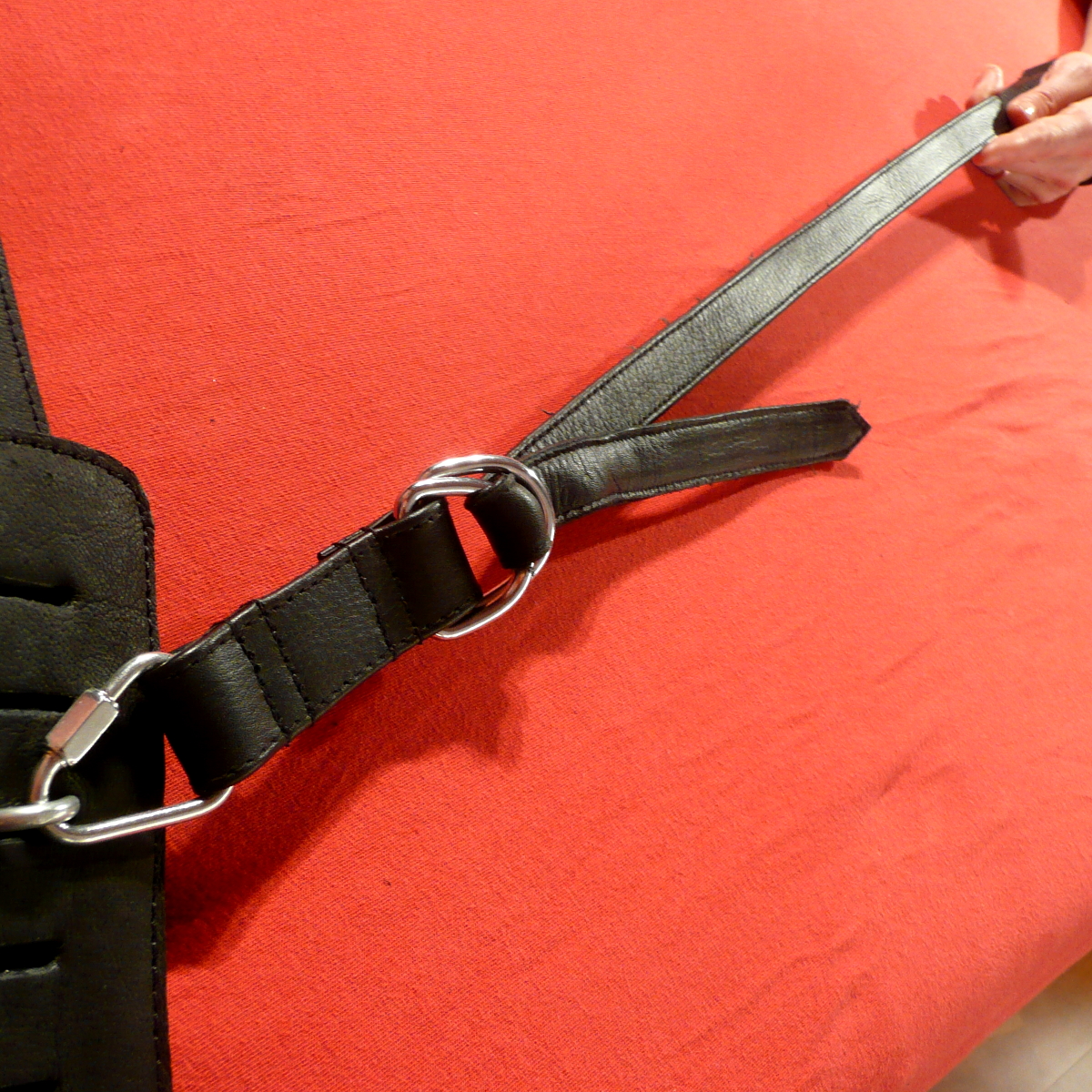 Der Stufenlos-Spanner ist die superpraktische Lösung, wenn Sie eine Fesselung während des Spiels allmählich immer unbequemer machen wollen! Dabei handelt es sich um einen Spanngurt, der zwischen zwei Objekten wie z.B. Fesselmanschette und Bettstrebe angebracht wird und dann ganz nach Bedarf stufenlos enger gezogen werden kann, ohne irgendeine Schnalle öffnen zu müssen oder einen Mechanismus zu betätigen. Einfach die Ösen des Gurtes mit Hilfe von Karabinerhaken oder Vorhängeschlössern zwischen zwei Objekten einhängen, dann am offenen Ende des Gurtes ziehen und schon wird er immer kürzer! Dieser Spanner eignet sich z.B. hervorragend zum allmählichen Aufspannen des Unterkörpers, zum gespannten Fixieren einer Person zwischen zwei Fixierpunkten, oder . . oder . . . oder . . . Lassen Sie Ihrer Fantasie freien Lauf, es gibt unendlich viele Möglichkeiten! Das Prinzip ist einfach: Das kurze Ende des Gurtes endet in einem doppelten D-Ring. Das andere lange Ende des Gurtes ist offen und wird durch die beiden D-Ringe hindurch geschlungen (s. Darstellung im Foto!) Dabei werden die Ringe so ineinander gedrückt, das sie eine Bewegung des Gurtes nur noch in eine Richtung zulassen, nämlich kürzer. Um den Gurt wieder zu entspannen muß der Zug deutlich zurück genommen werden. Erst dann lassen sich die D-Ringe soweit lösen, daß der Gurt wieder zurück laufen kann und länger wird. Diese kurze Version des Stufenlos-Spanners ist verstellbar von maximal 40 Zentimeter auf minimal 15 Zentimeter. Lieferumfang: 1 kurzer Stufenlos-Spanner mit geschlossenen Ösen (ohne im Bild gezeigte Manschetten, ohne Verschluß- und Verbindungselemente, diese bitte separat bestellen!)