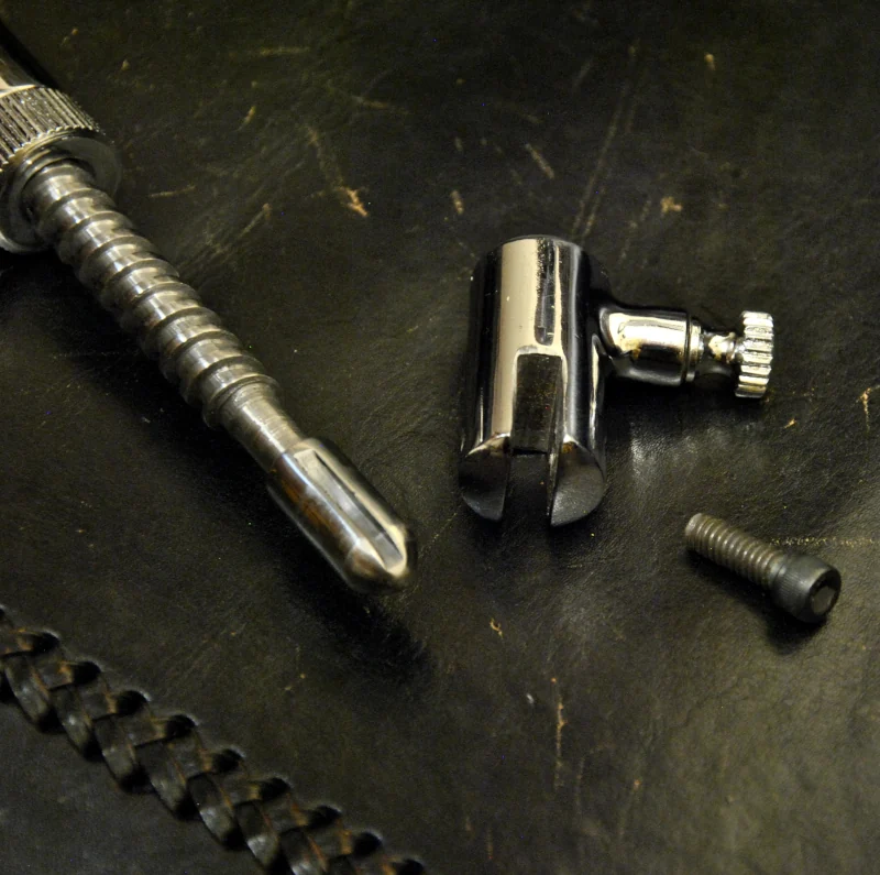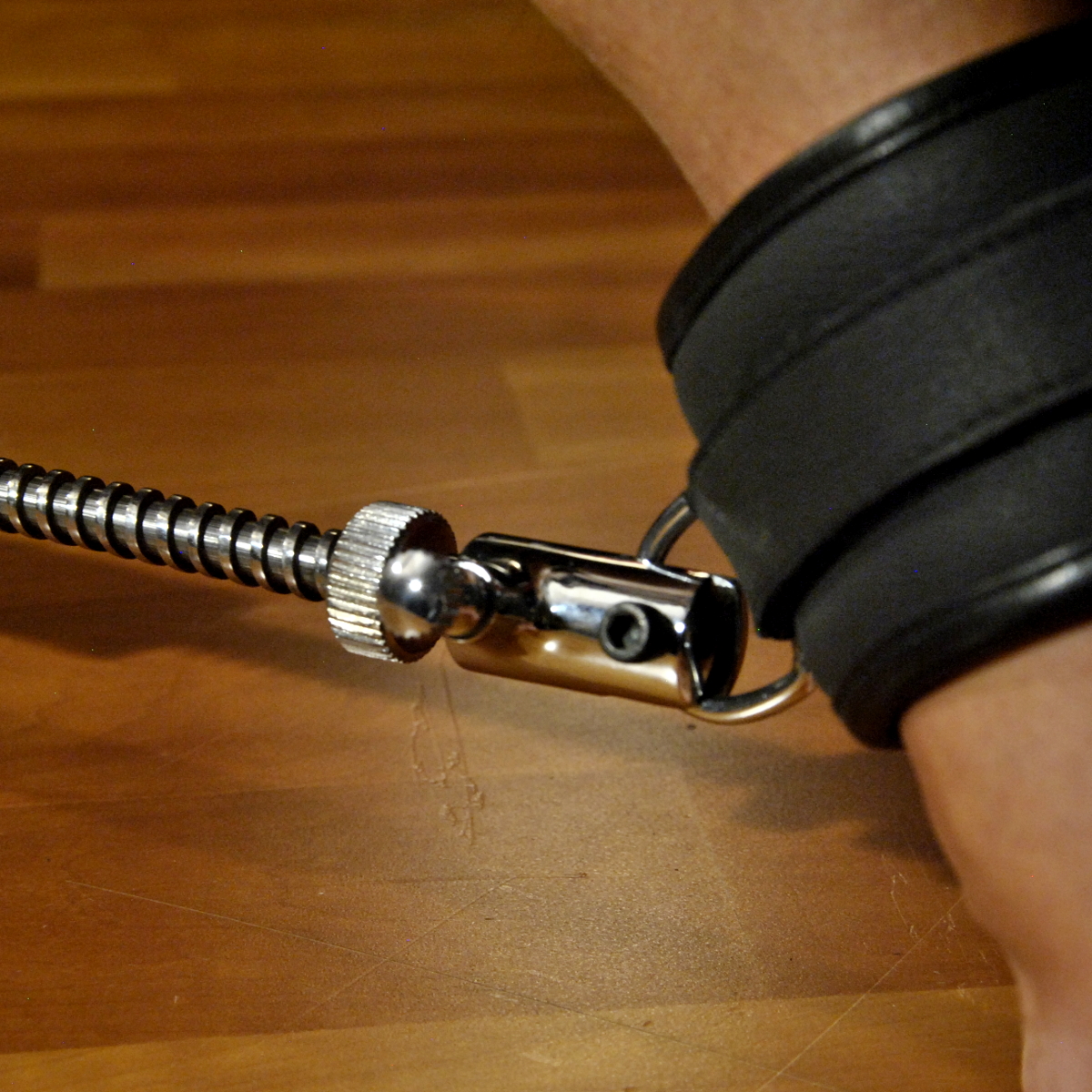 An den beiden Enden finden sich zwei mit einem Schnellverschluß abnehmbare Bauteile, in deren Schlitz sich die D-Ringe unserer verschiedenen Fesselmanschetten mit einer Schraube sichern lassen. So können Sie die Verbindung zu den Manschetten bereits in der Vorbereitungsphase herstellen, anstatt während des Einsatzes zu Füßen der fixierten Person knien zu müssen.
